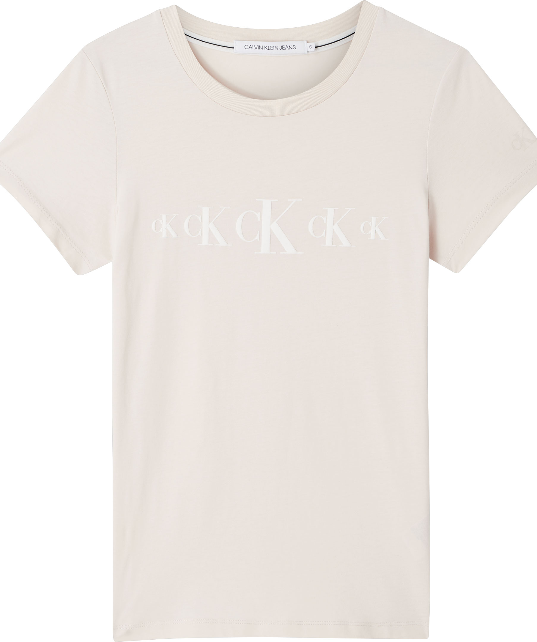 Ljusbeige t-shirt i rak modell från Calvin Klein. Tillverkad i 100% bomull. Fem vita logotyper tryckt mitt på bröstet och rundad halsringning. *Logga på bröstet *Rundad halsringning *100% bomull