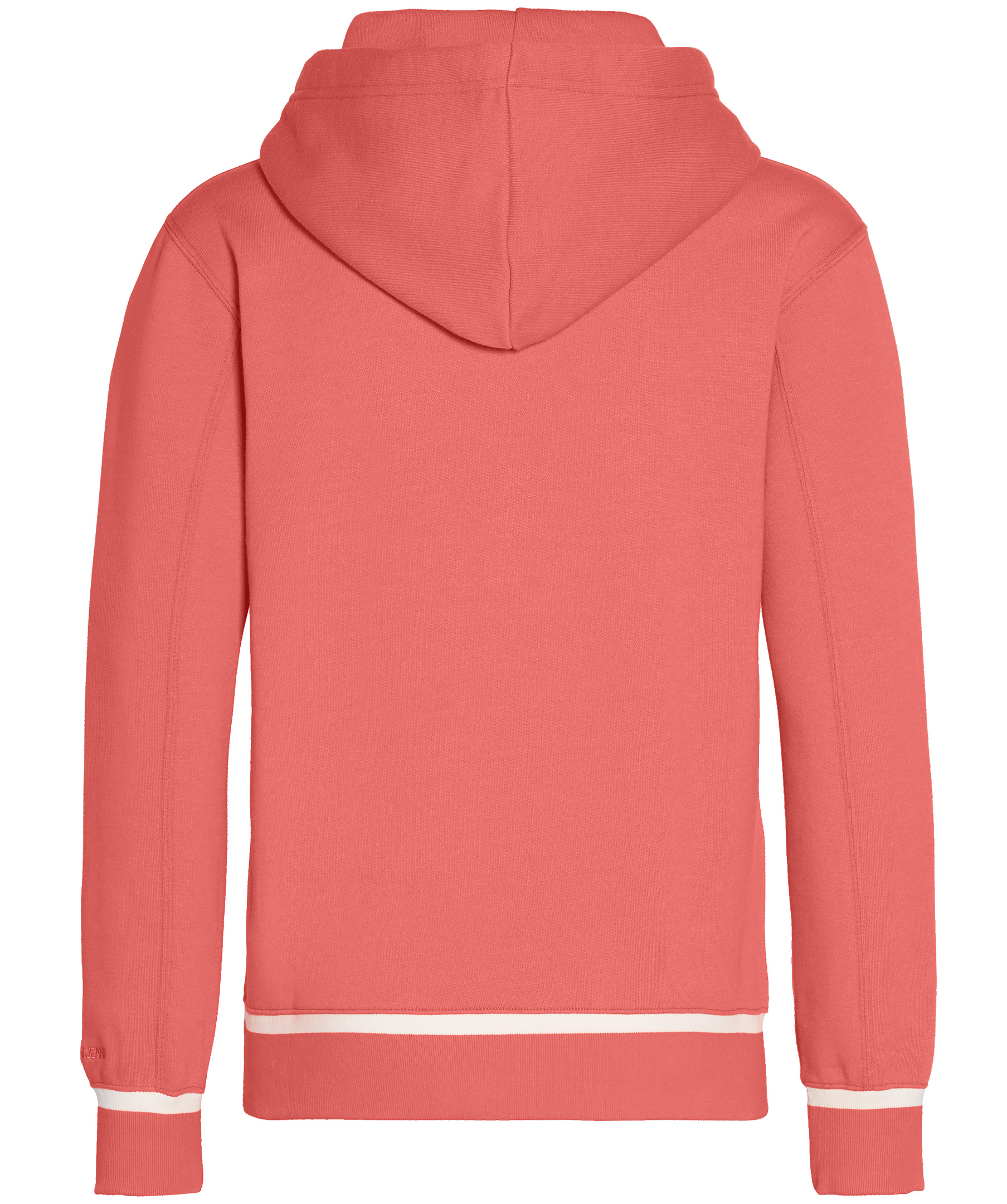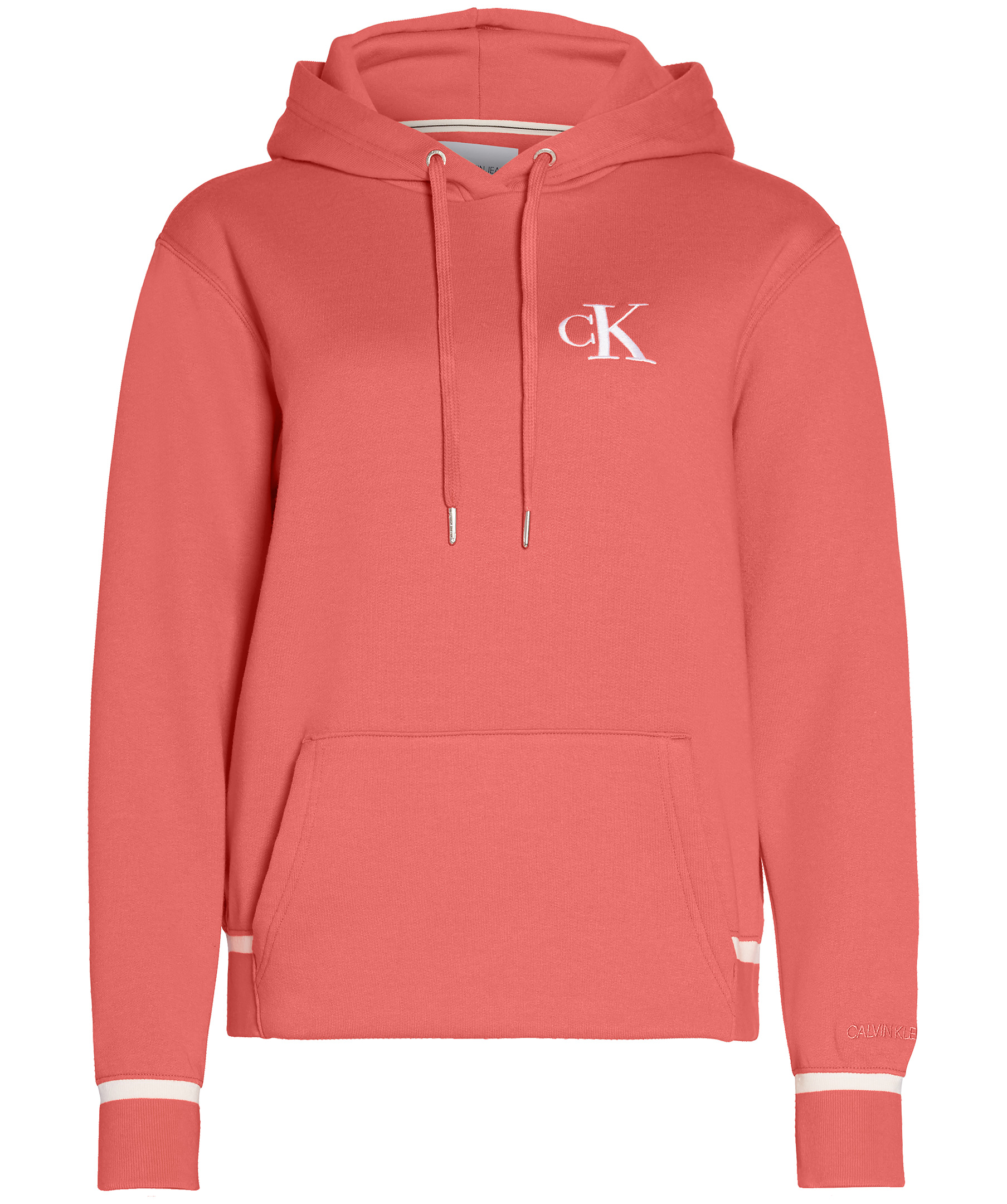 Korallfärgad hoodie från Calvin Klein. Snörning i midjan, ficka på magen och broderad logotyp på vänster sida på bröstet. Mudd i midja och ärmslut med tunn vit rand längst upp på mudden. Tillverkad i 100% bomull.