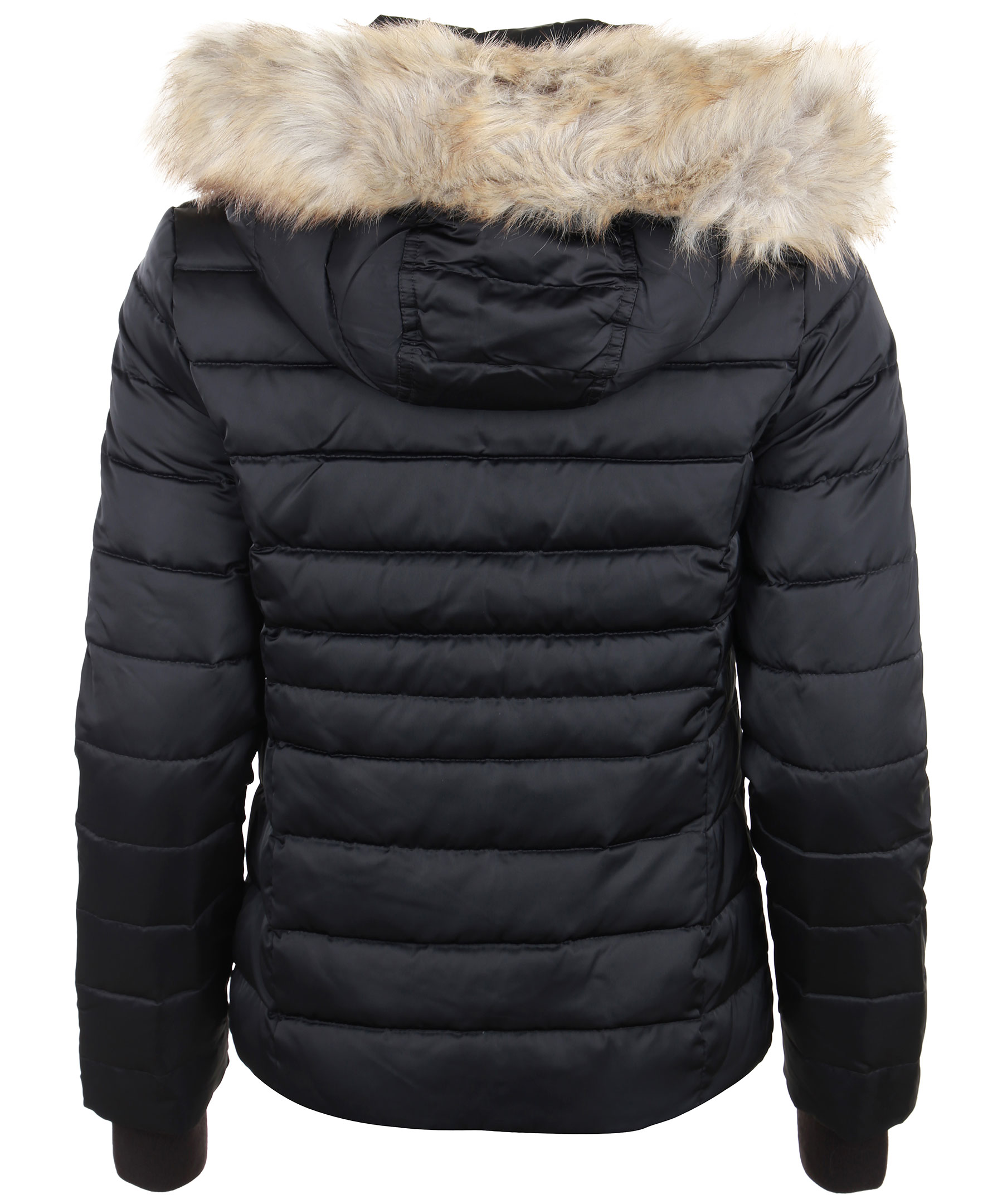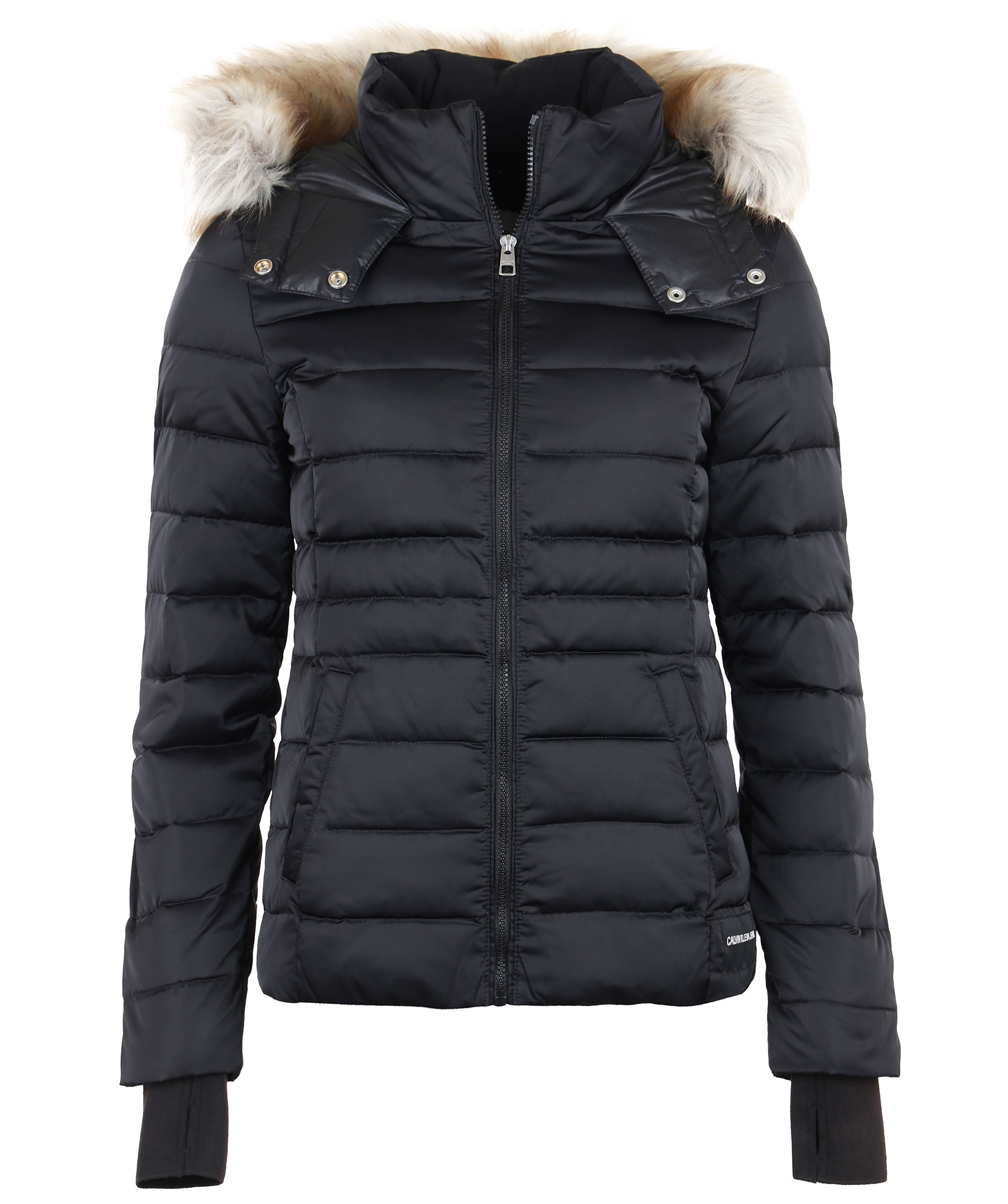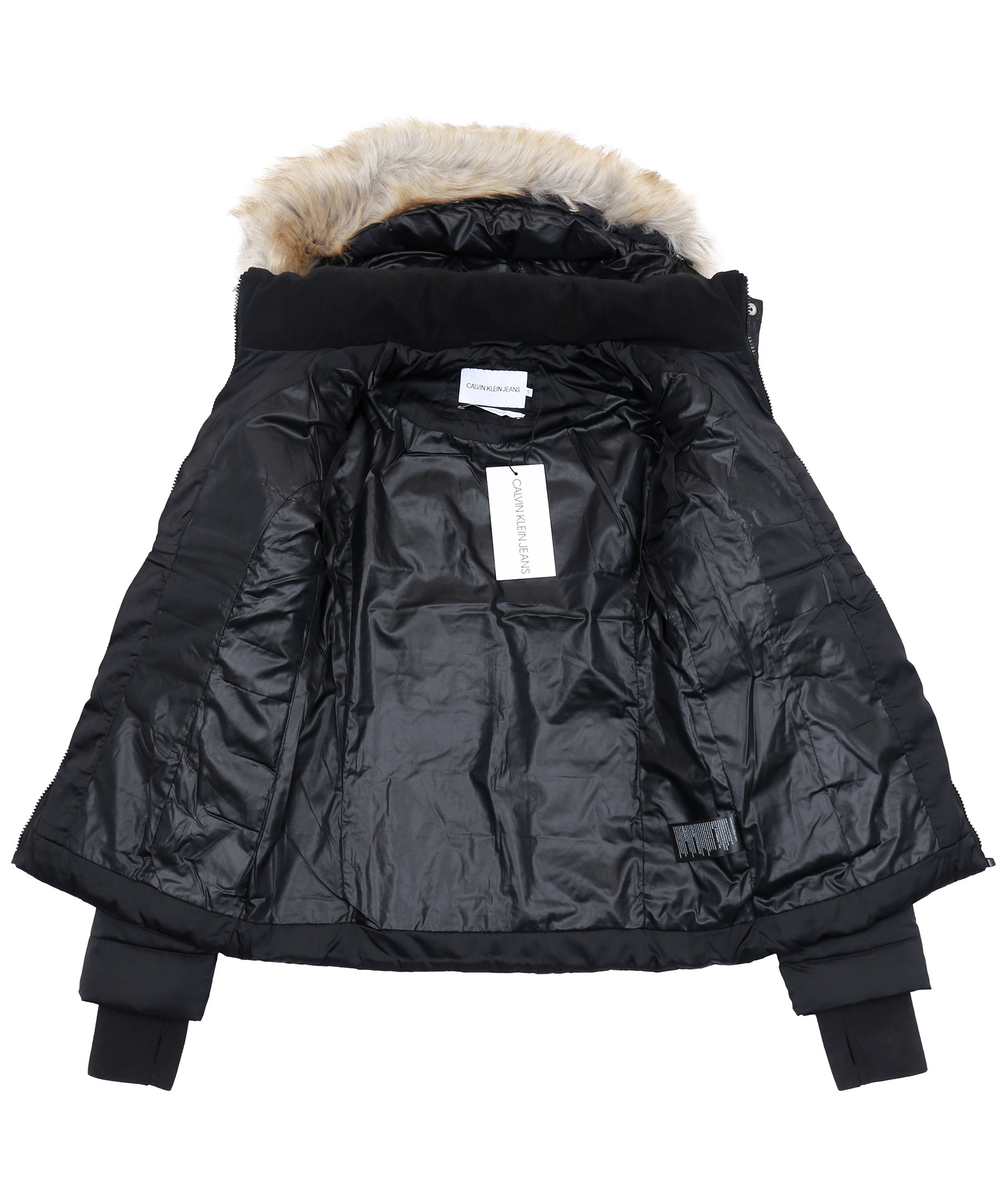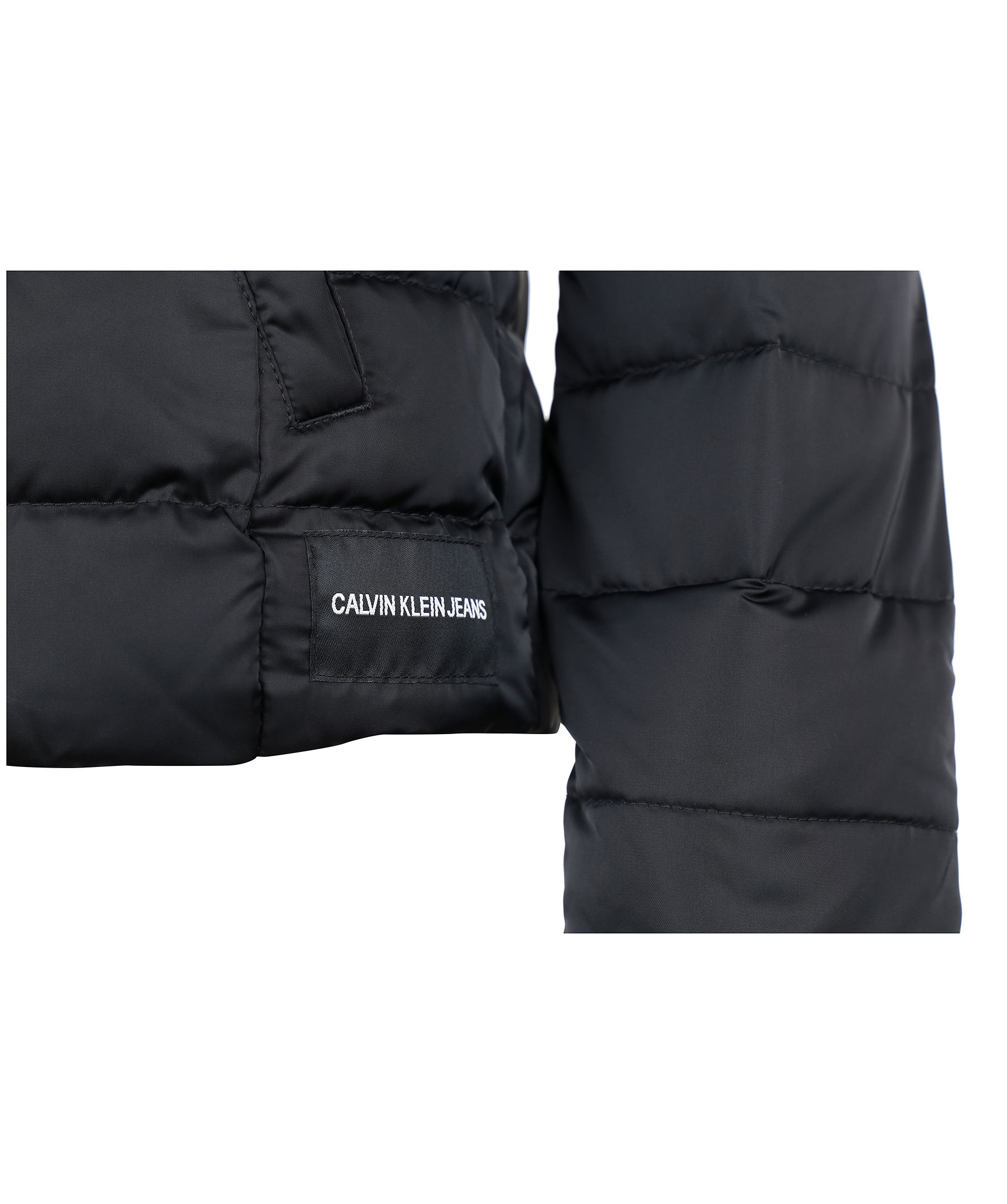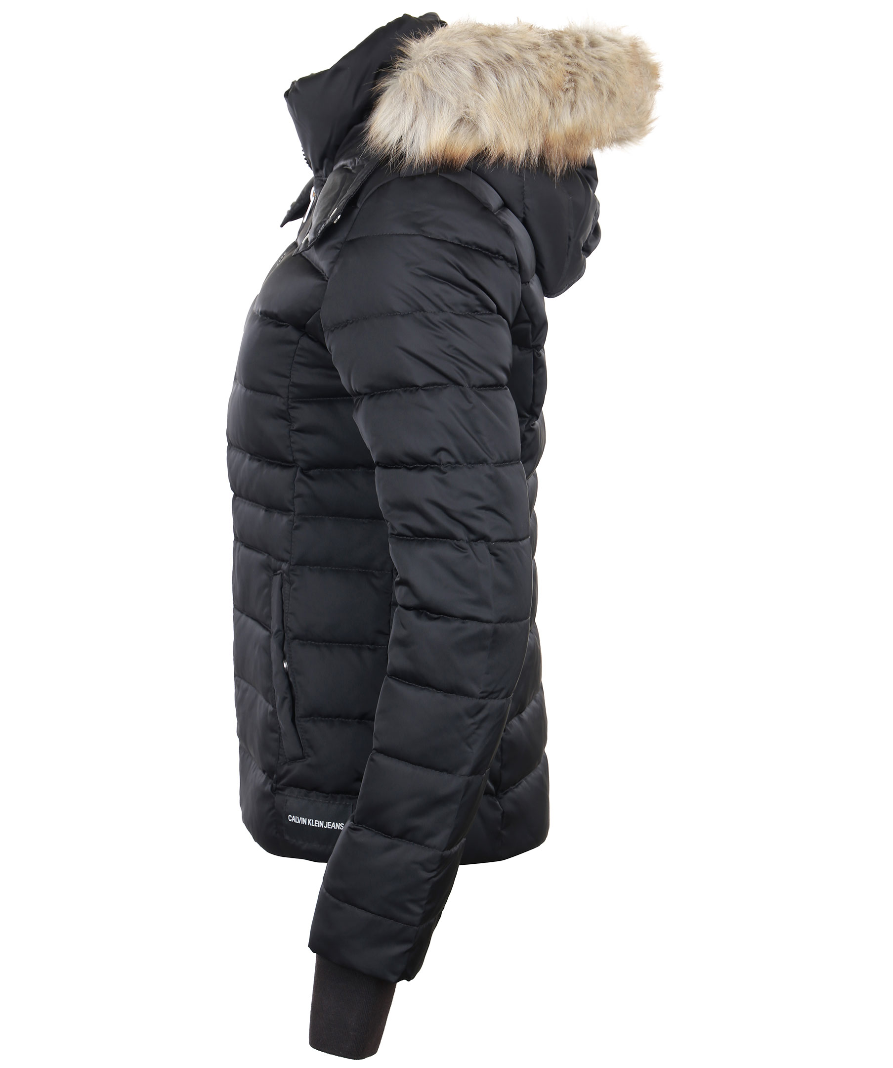 Svart dunjacka från Calvin Klein i medellängd. Jackan har luva med löstagbar krage i faux fur. Två fickor fram samt ribbstickade muddar. Applikation nedtill med logotyp.