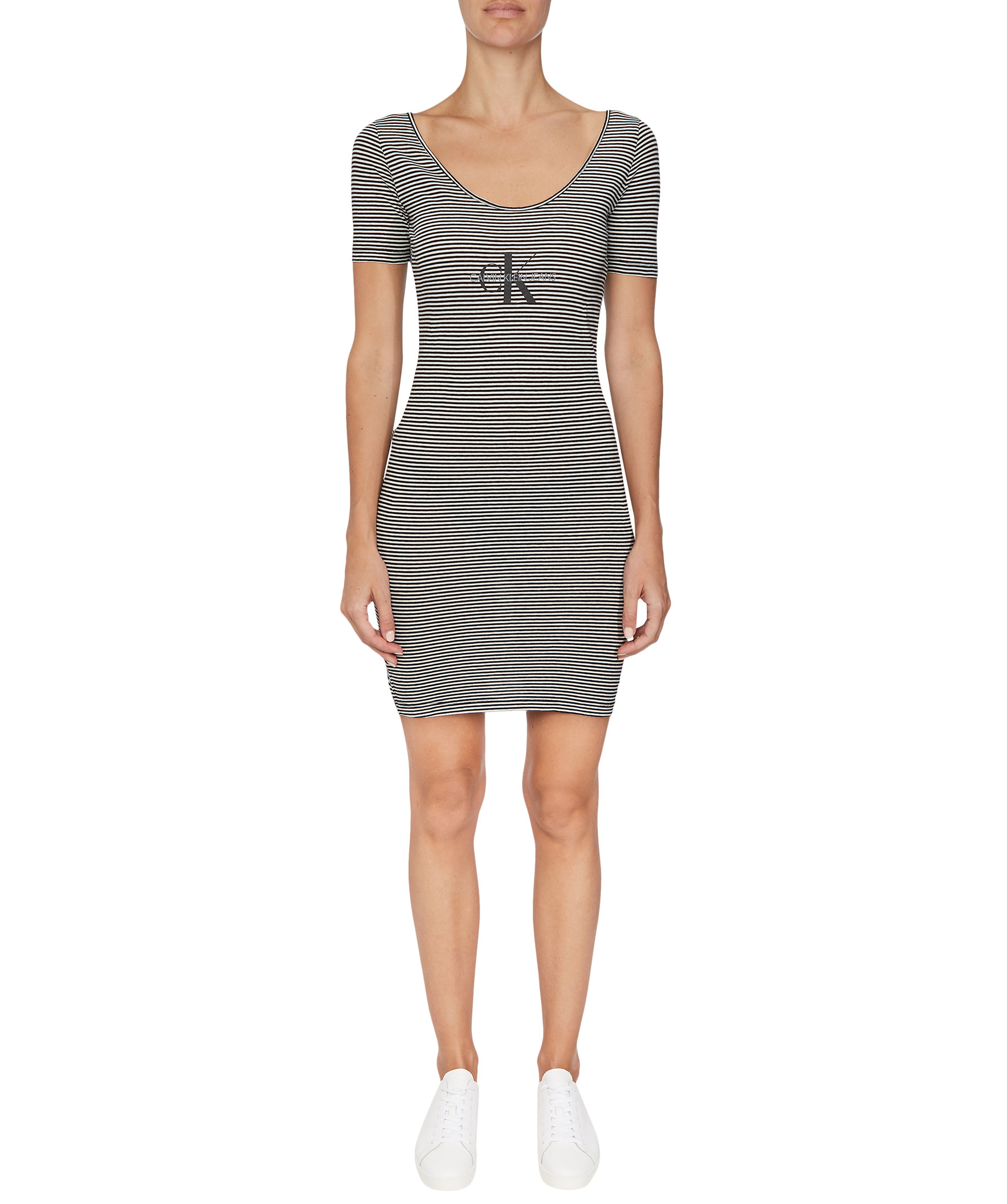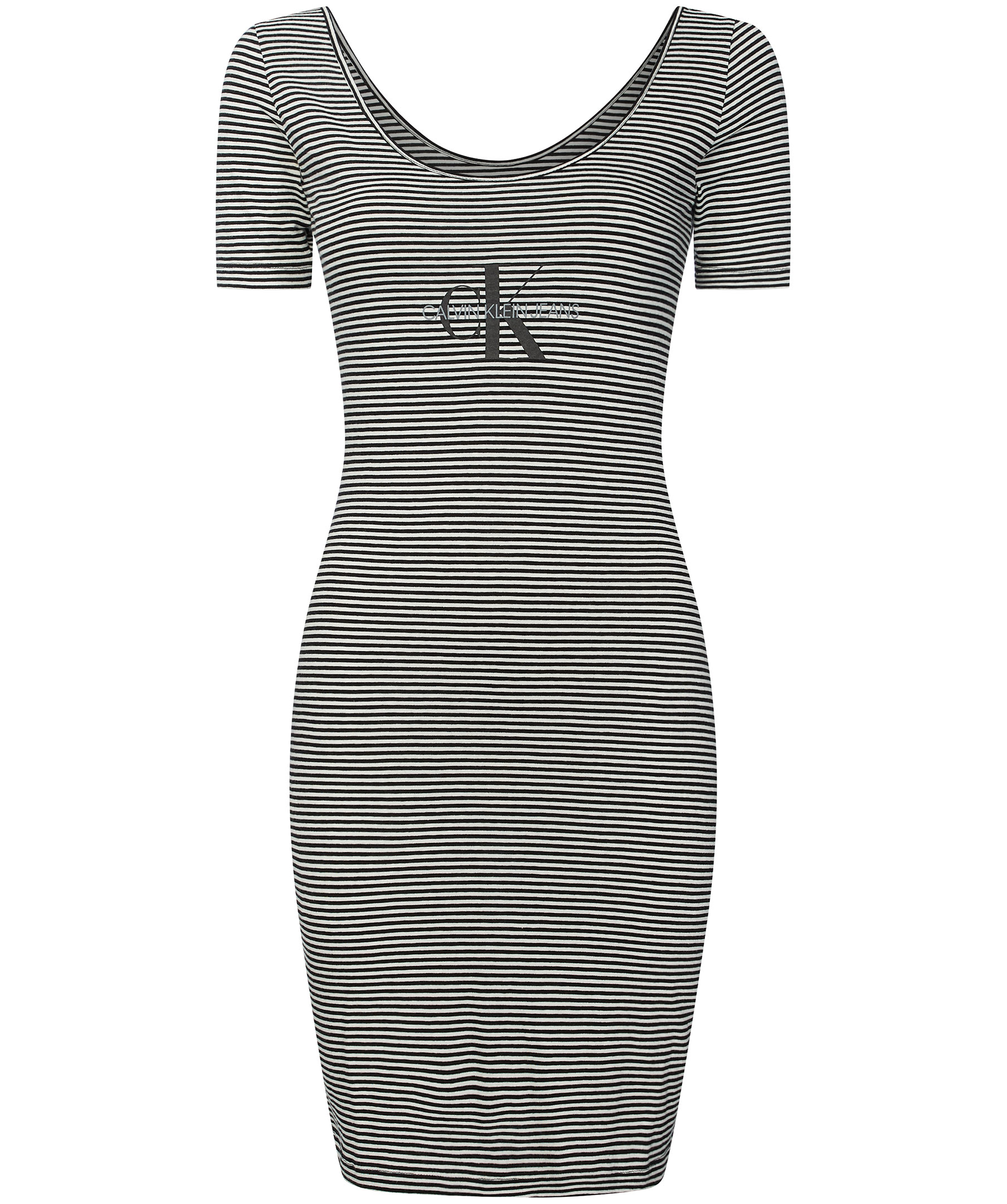 Randig t-shirtklänning med djup rundad halsringning från Calvin Klein. Tryckt logotyp på bröstet. Tillverkad i 100% bomull.