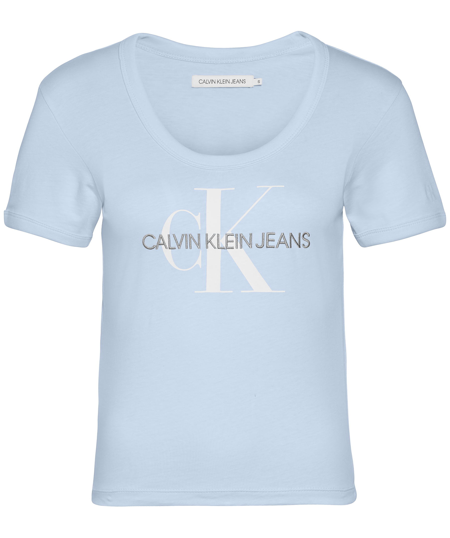 Ljusblå t-shirt från Calvin Klein. Tryckt, logotyp på bröstet och broderad logotyp i grått ovanpå trycket. Rundad halsringning. Tillverkad i stretchig bomull.