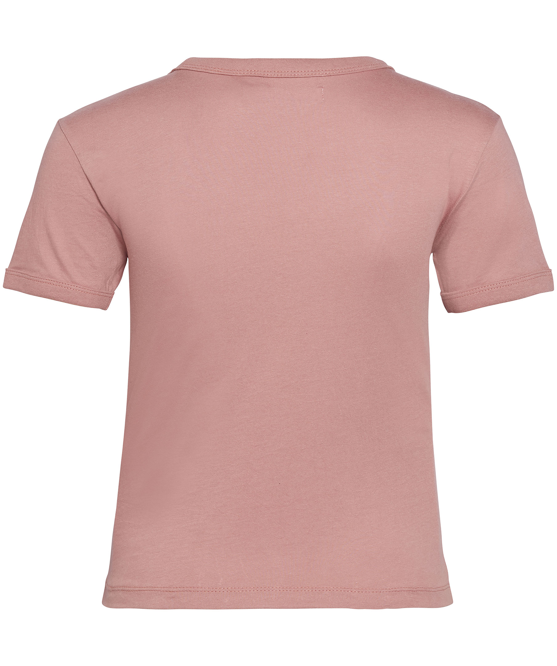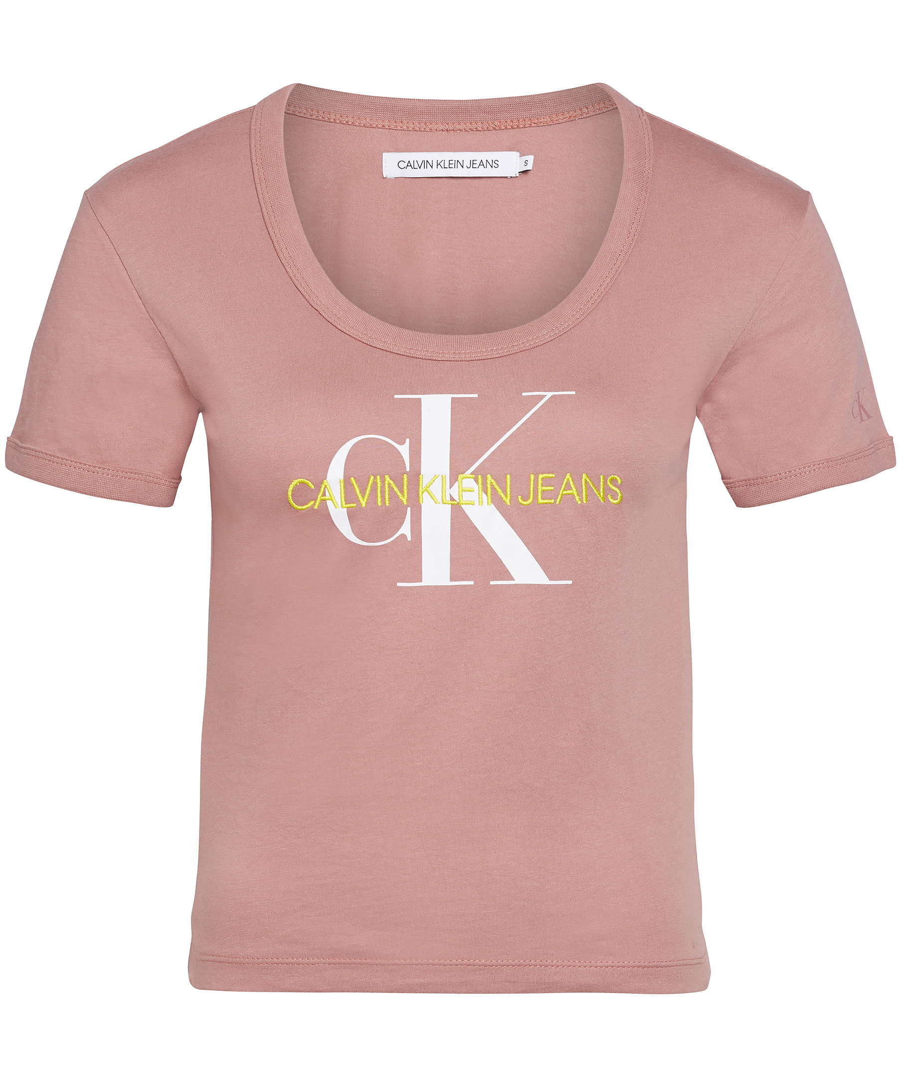 Ljusrosa t-shirt från Calvin Klein. Tryckt, logotyp på bröstet och broderad logotyp i gult ovanpå trycket. Rundad halsringning. Tillverkad i stretchig bomull.