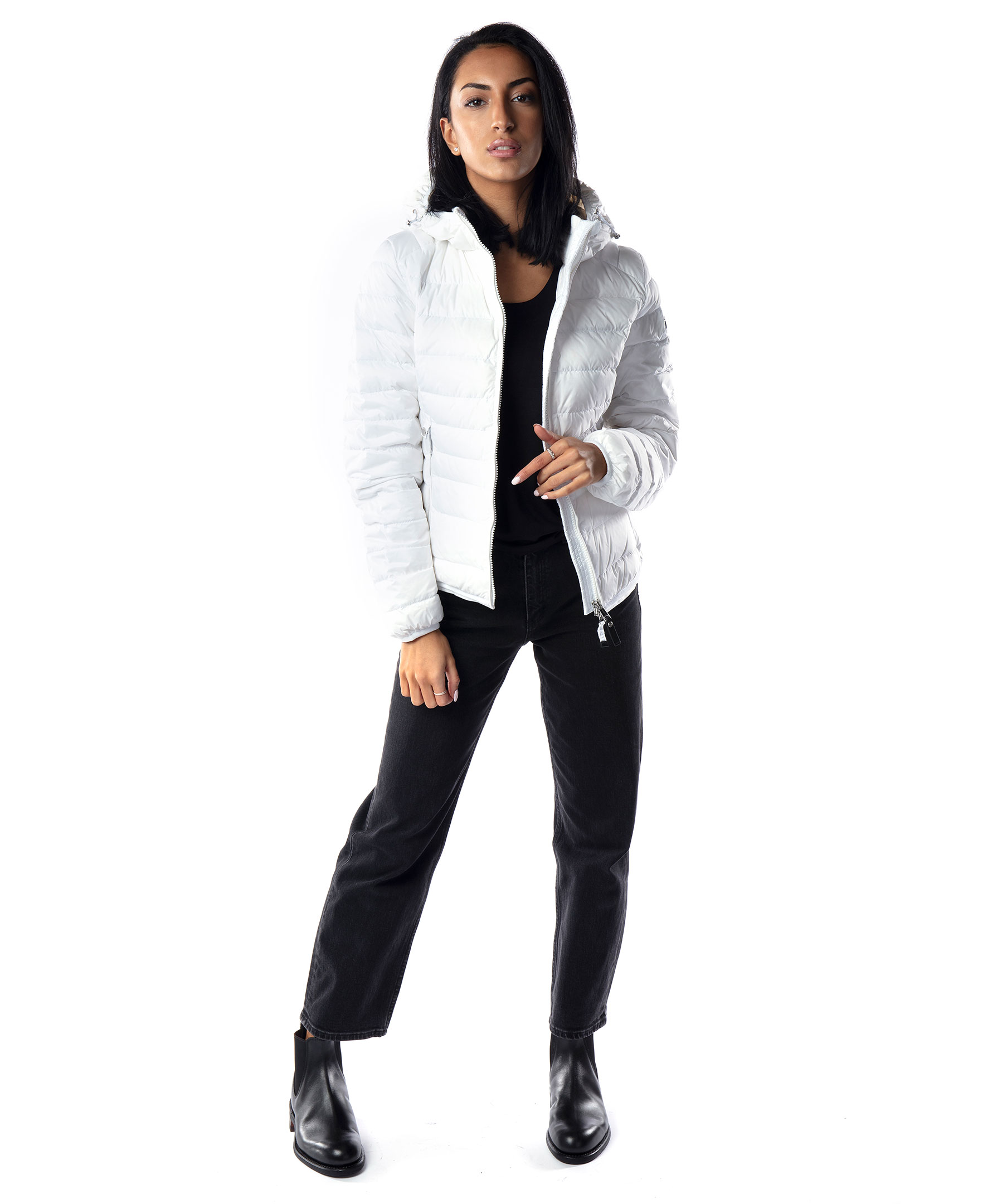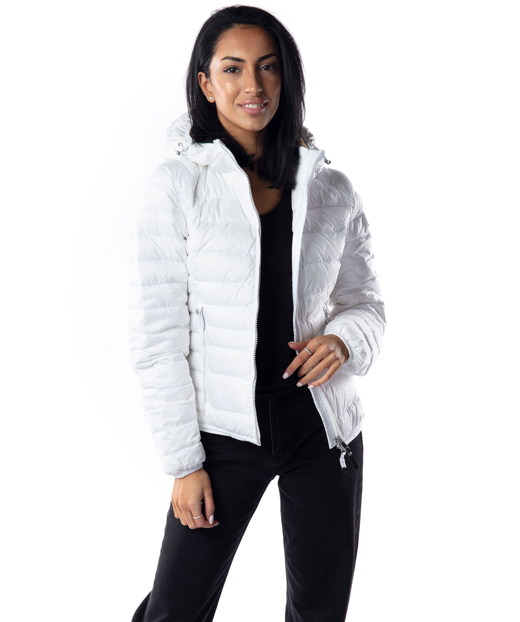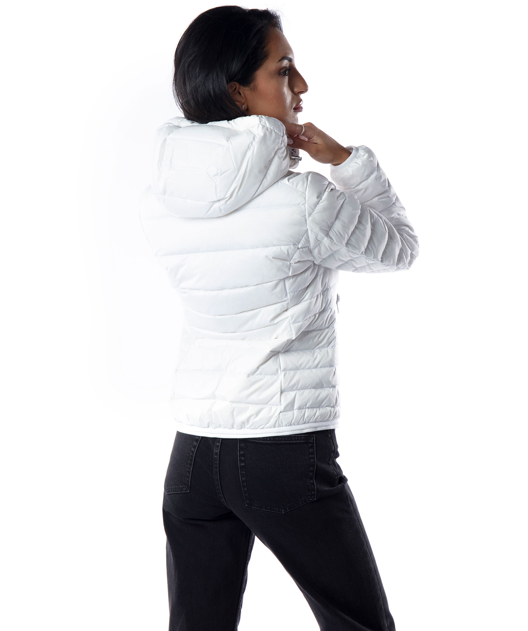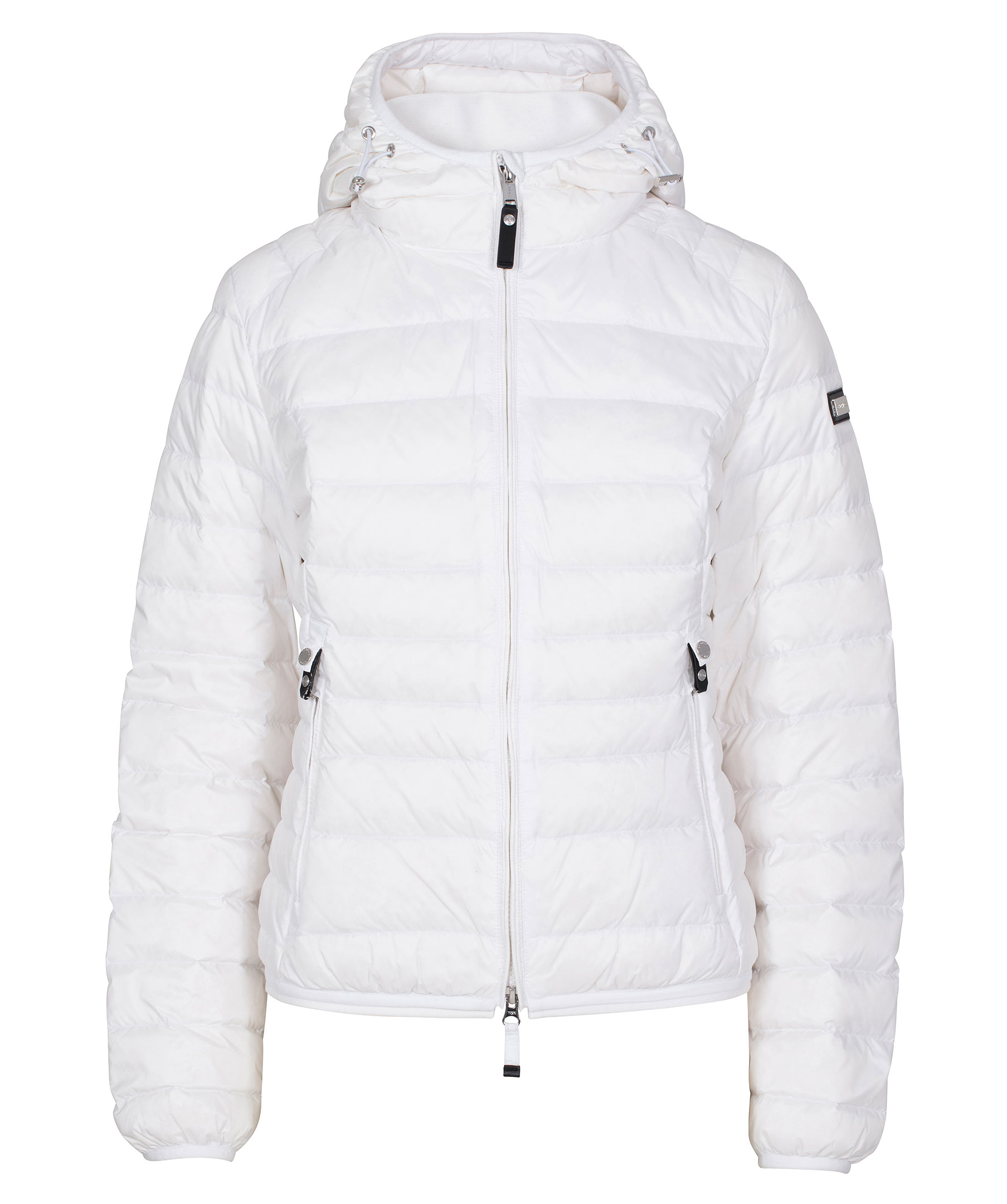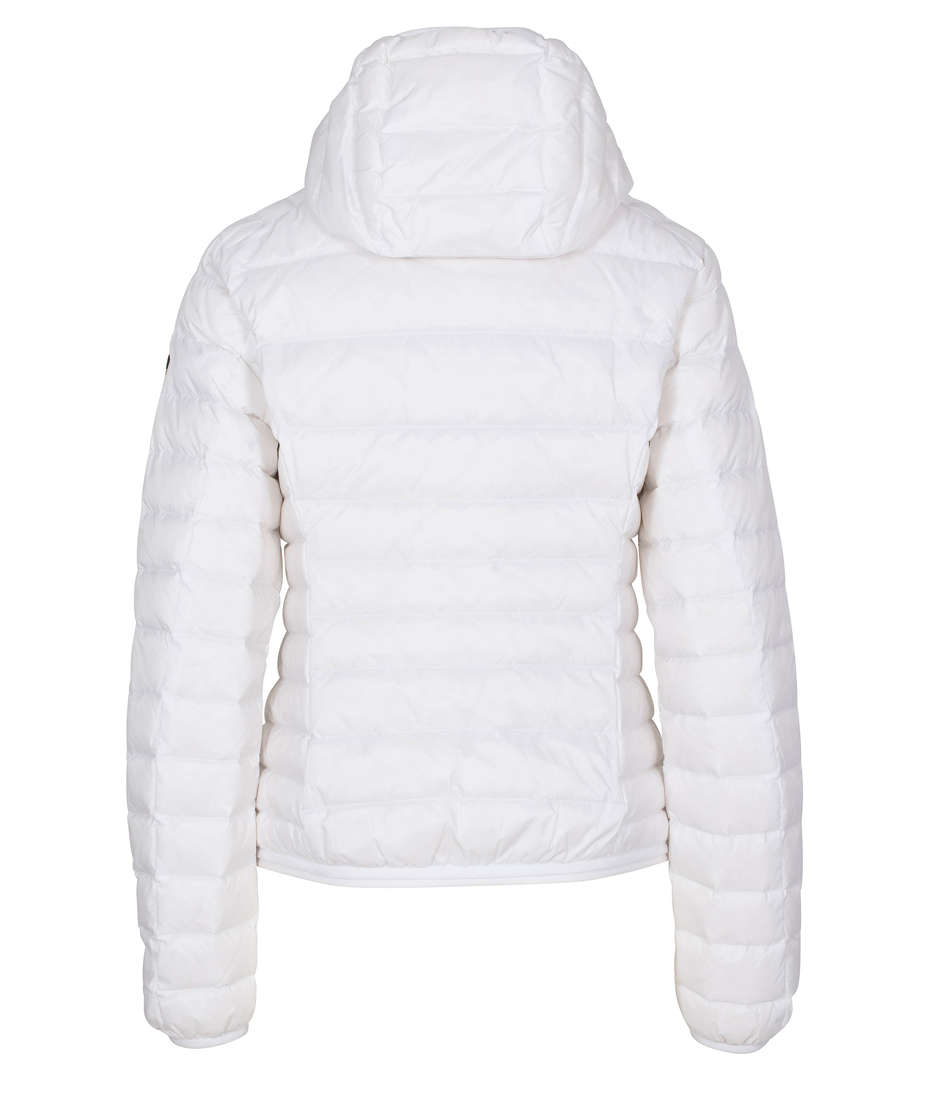 Vit lättviktsdunjacka från Cedrico. Tillverkad i nylon med fyllning av dun och fjäder. Jackan stängs med tvåvägsdragkedja och har en hög krage med luva som kan spännas åt med elastisk dragsko. Två fickor fram som stängs med dragkedja och har knapp ovanför som man kan knäppa fast dragflärpen i så att den håller sig på plats och inte åker ner. Tre innerfickor, en med dragkedja. Logga på vänster ärm samt liten mudd i ärmslut och plaggslut. Modellen är 170 cm lång och bär storlek S.