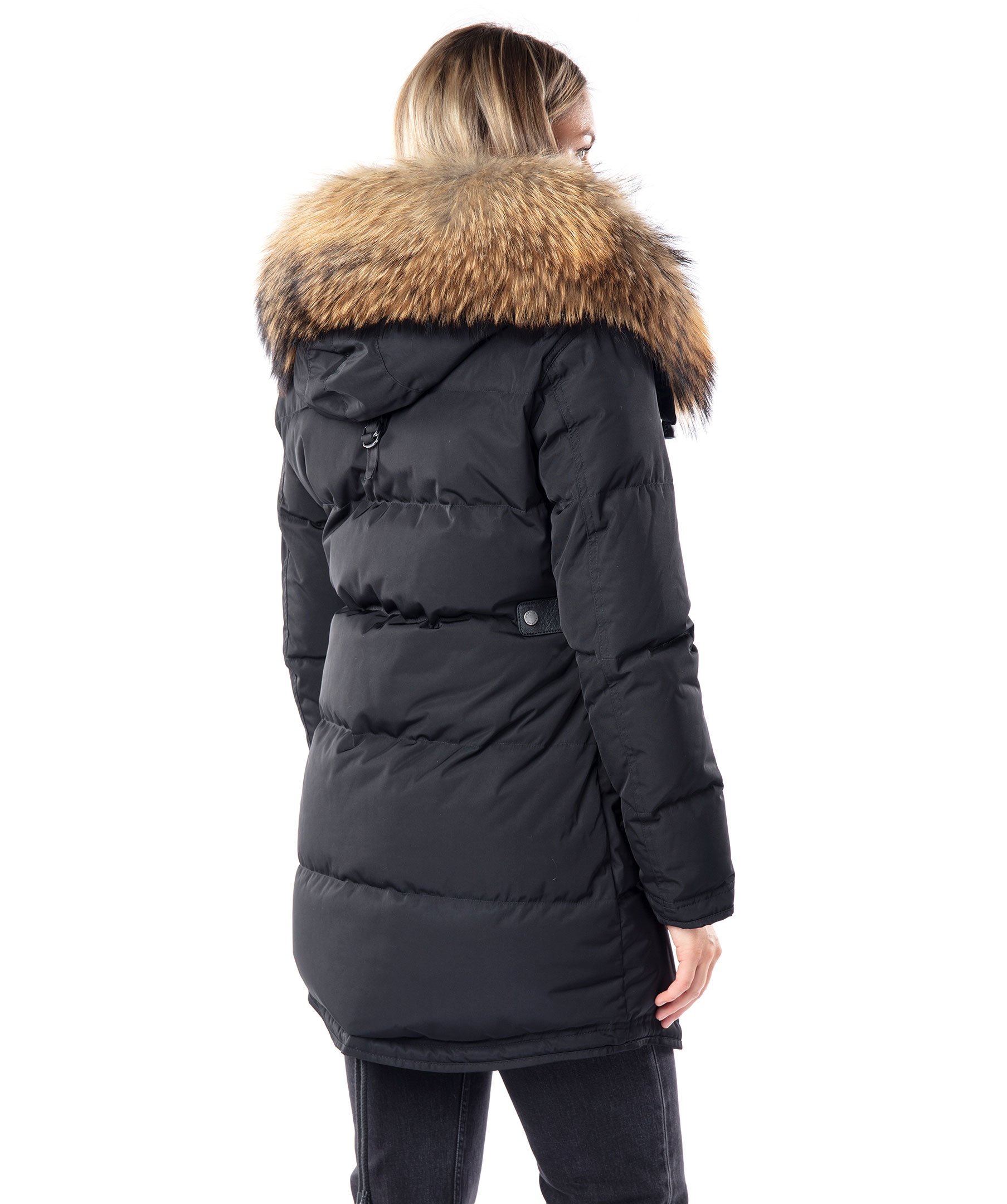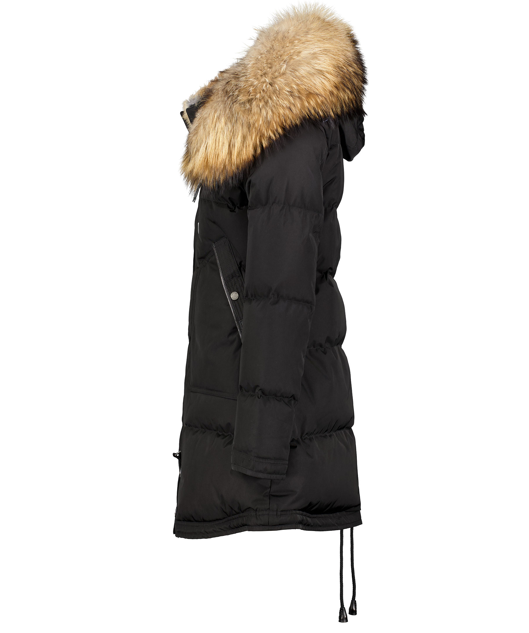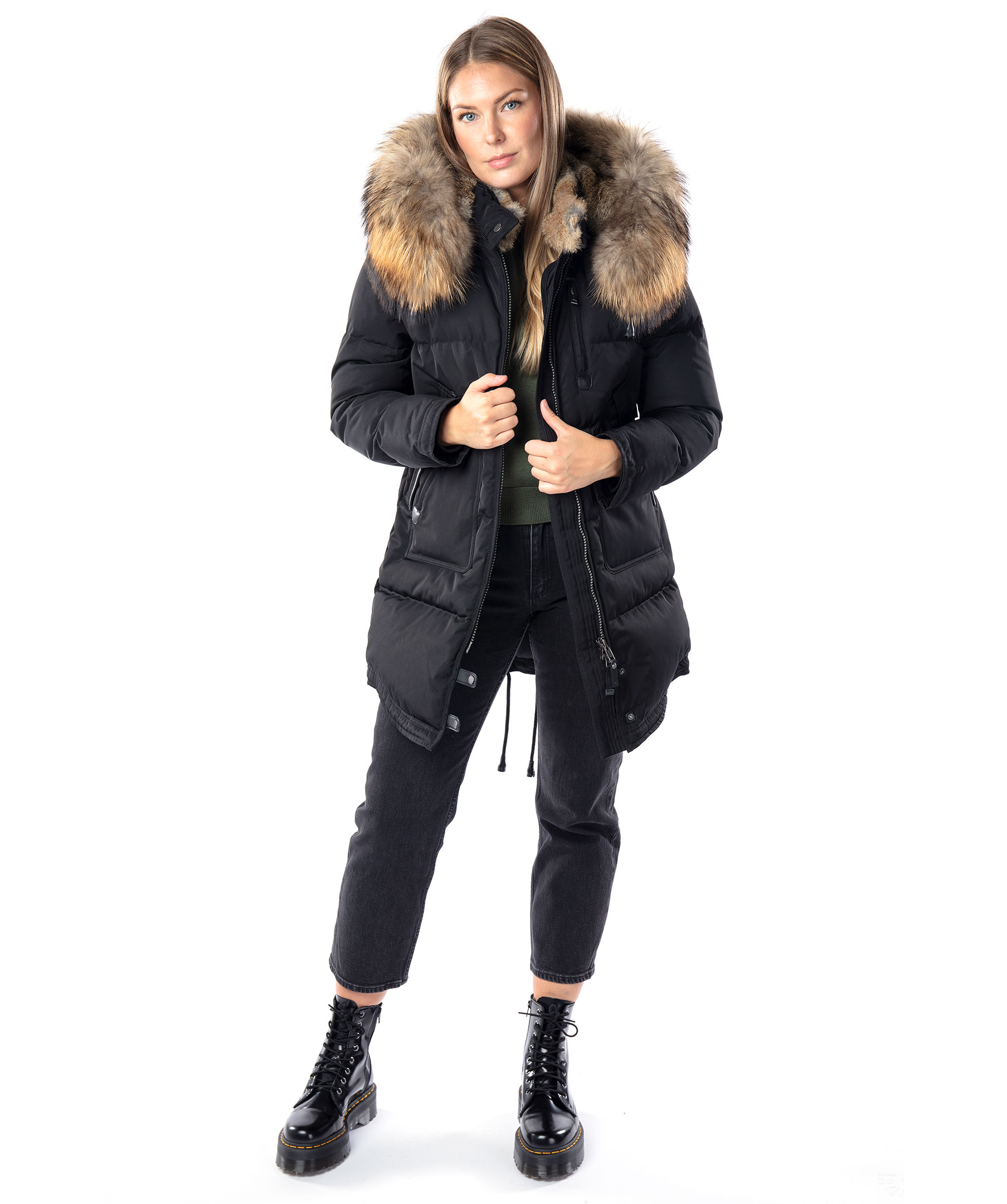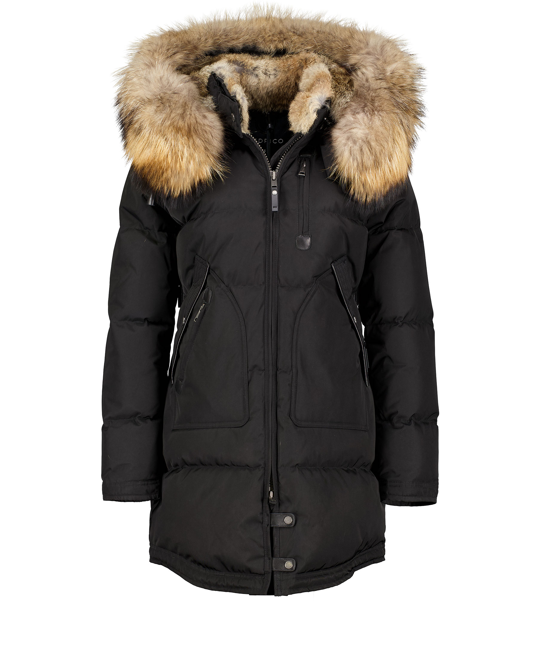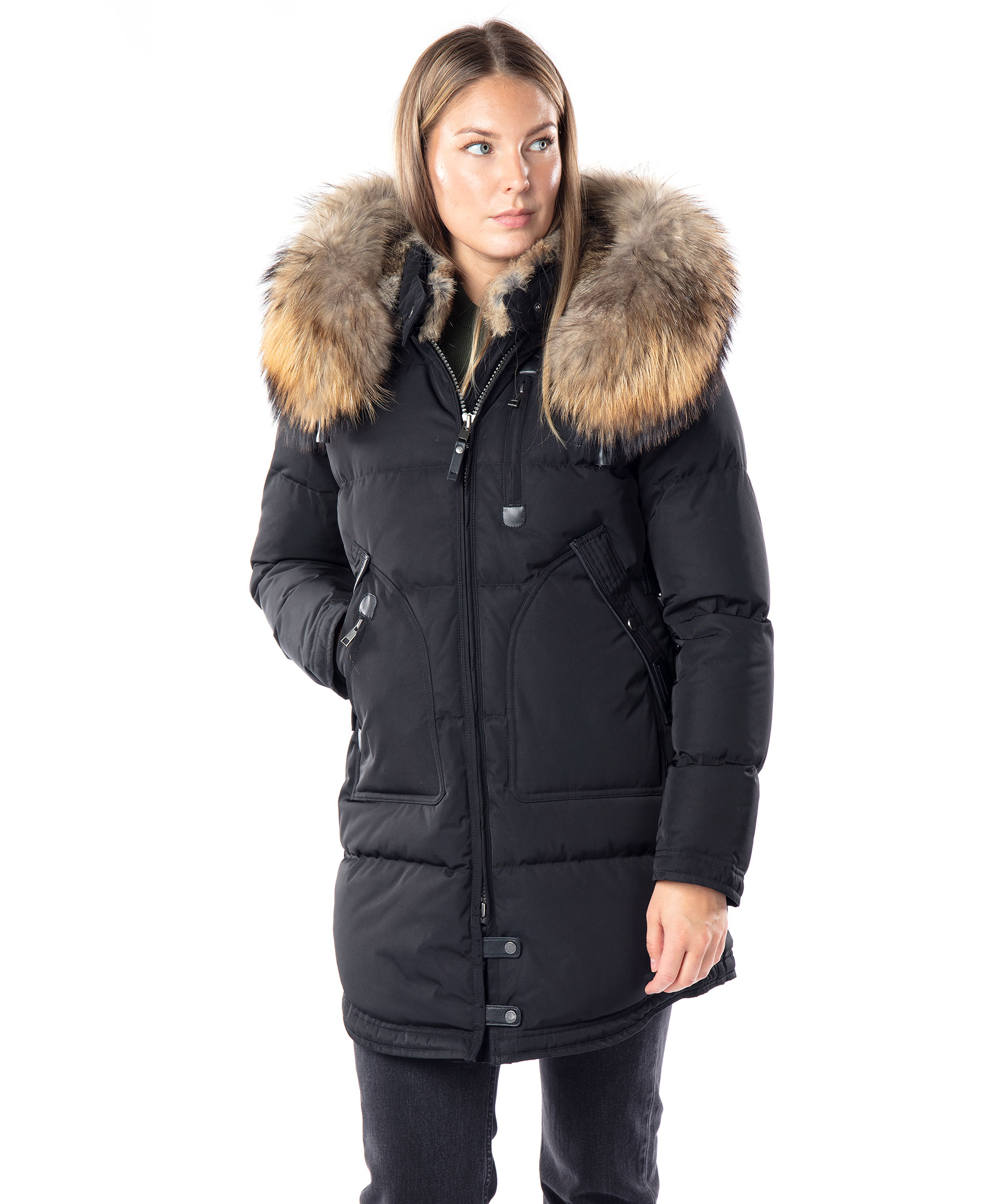 Svart, längre dunjacka med huva från det Norska märket Cedrico. Jackan har löstagbar huva samt pälskrage som är fodrad med tvättbjörn och kaninpäls. Tvåvägsdragkedja och två snedställda fickor med ficklock och knapp samt en ficka med dragkedja. En bröstficka med dragkedja. Samtliga fickor har skinndetaljer samt även skinndetaljer i sidan av jackan samt vid knappar längs ner fram på jackan. Dragsko finns längst ner baktill på jackan. Färgen på pälsen kan variera. Modellen är 175 cm lång och bär storlek S. TIPS! Ånga pälsen för att få den stor och fluffig. OBS! Naturpälsar är unika och kan skilja sig från bilden. * Flera praktiska fickor * Avtagbar luva * Tvåvägsdragkedja
