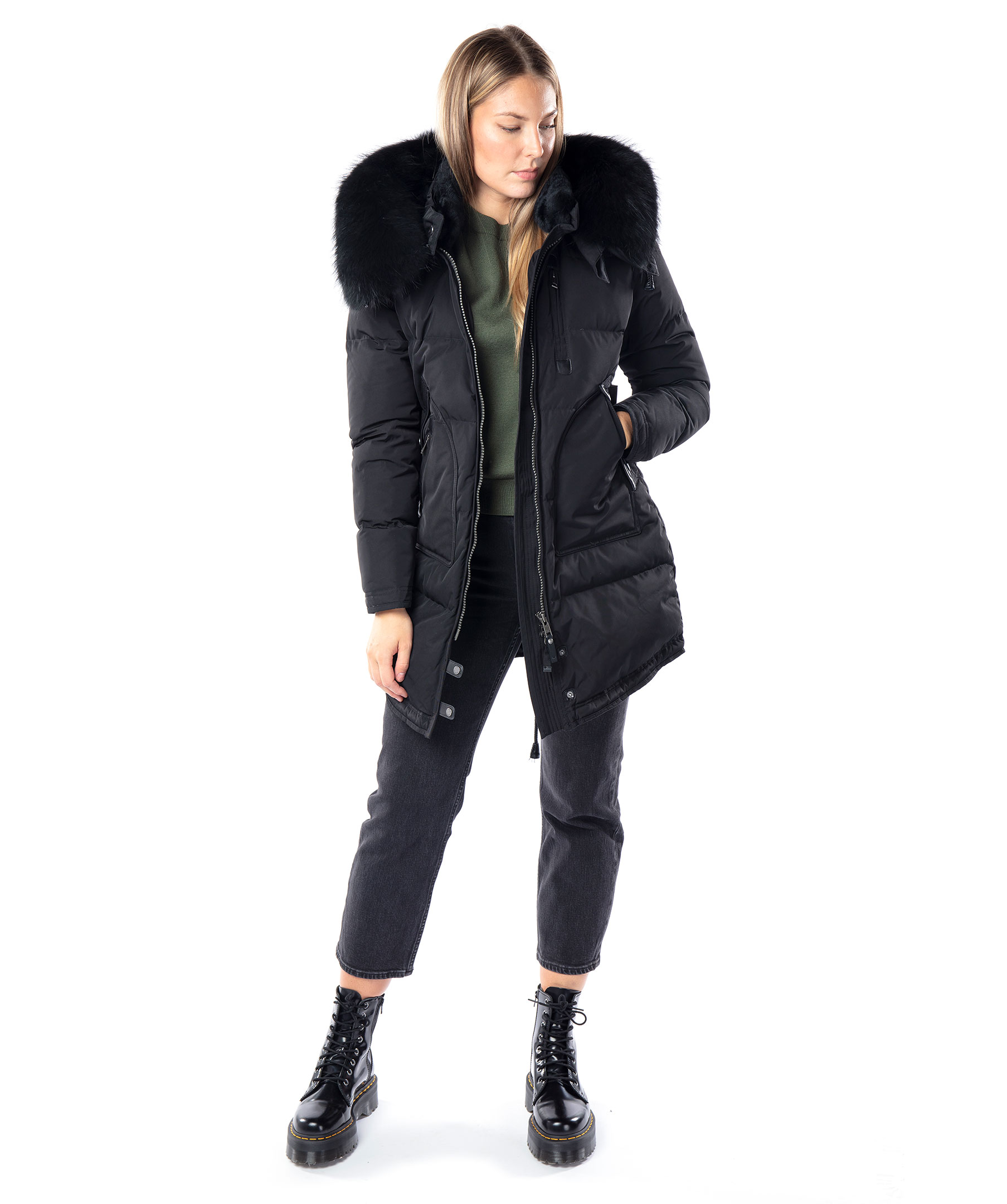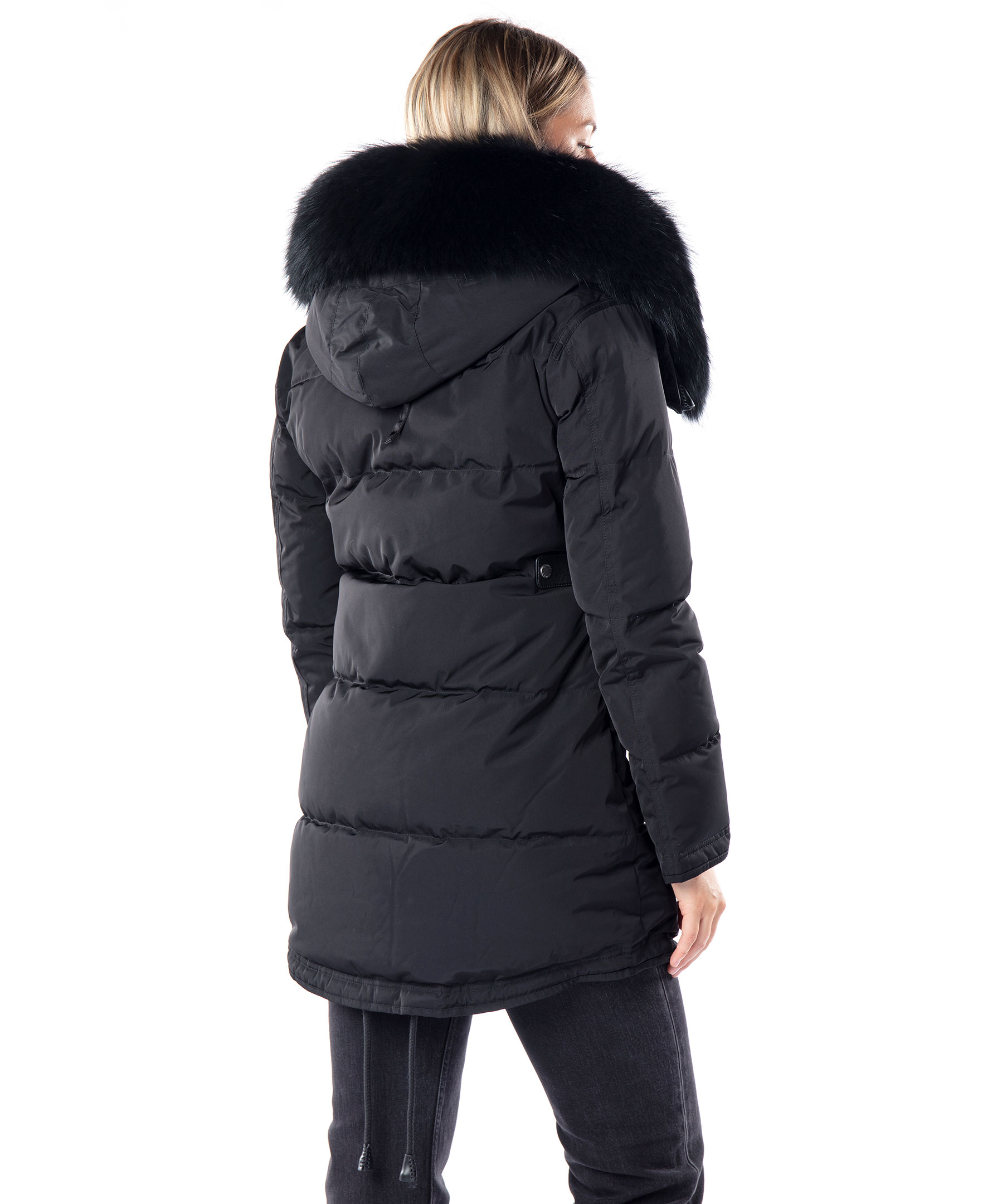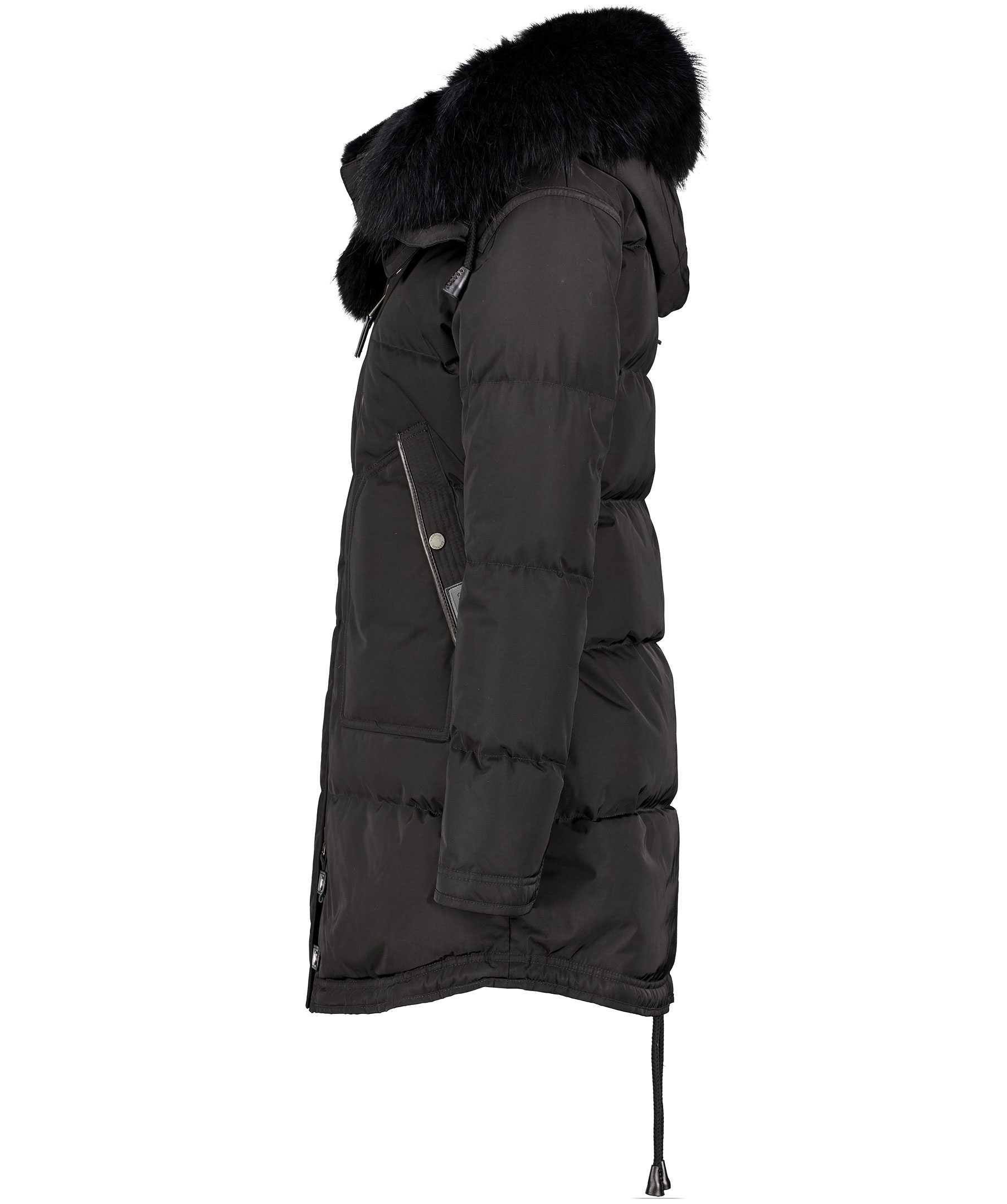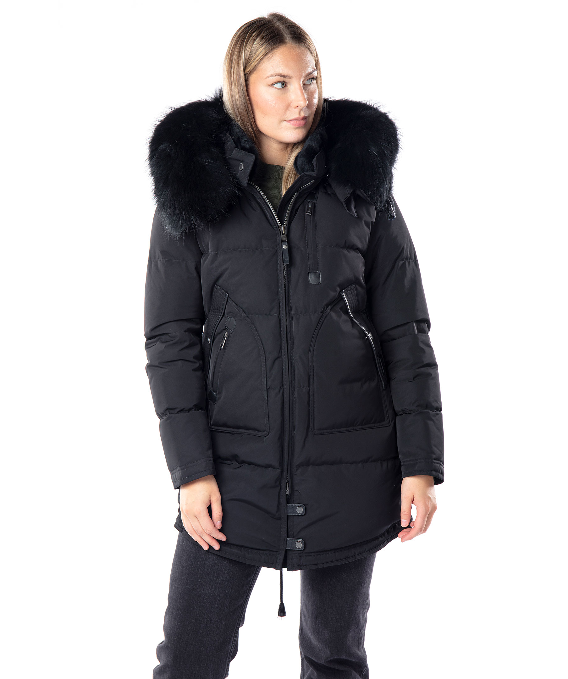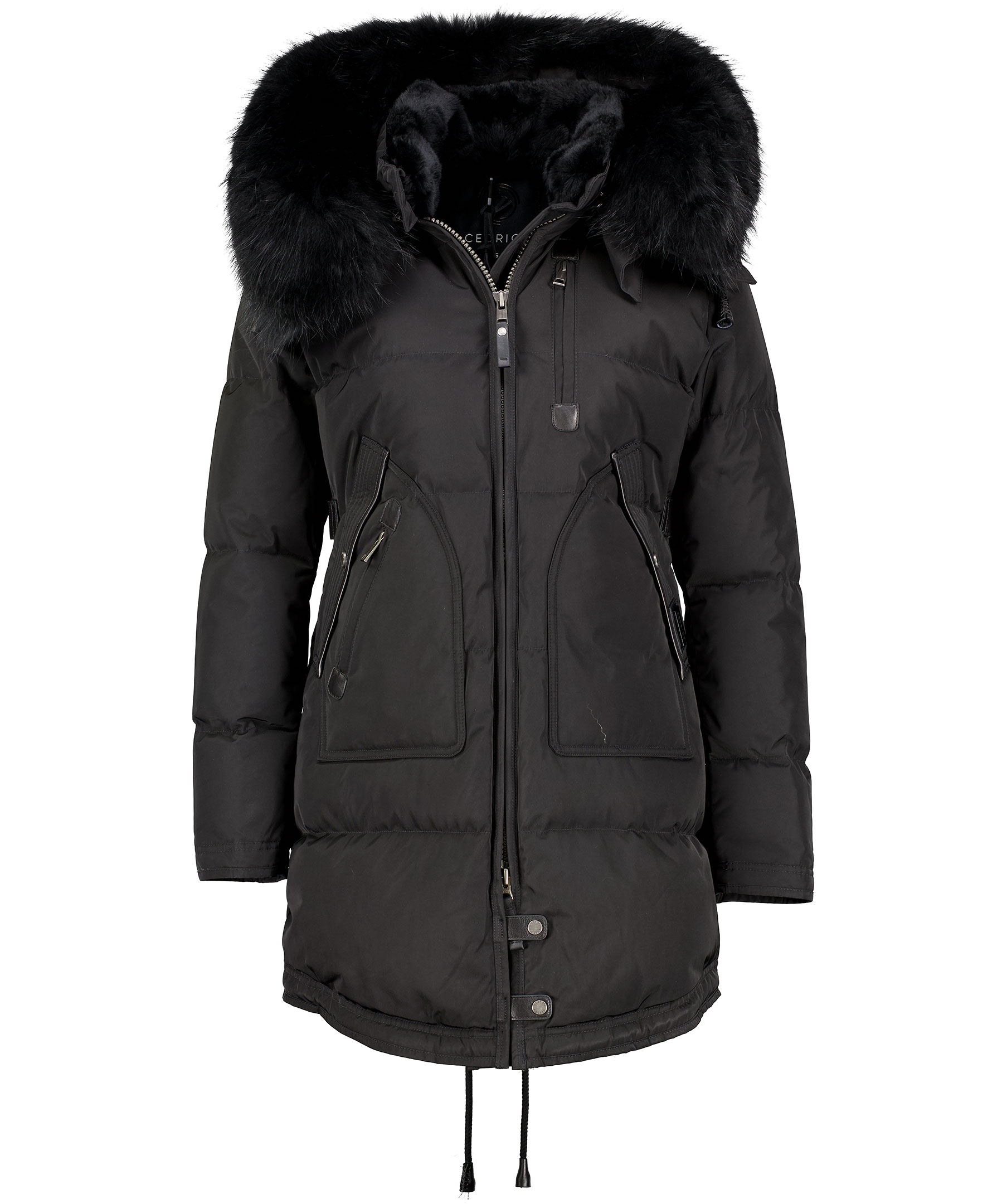 Svart, längre dunjacka med huva från det Norska märket Cedrico. Jackan har löstagbar huva samt svart pälskrage som är fodrad med tvättbjörn och kaninpäls. Tvåvägsdragkedja och två snedställda fickor med ficklock och knapp samt en ficka med dragkedja. En bröstficka med dragkedja. Samtliga fickor har skinndetaljer samt även skinndetaljer i sidan av jackan samt vid knappar längs ner fram på jackan. Dragsko finns längst ner baktill på jackan. Färgen på pälsen kan variera. Modellen är 175 cm lång och bär storlek S. TIPS! Ånga pälsen för att få den stor och fluffig.