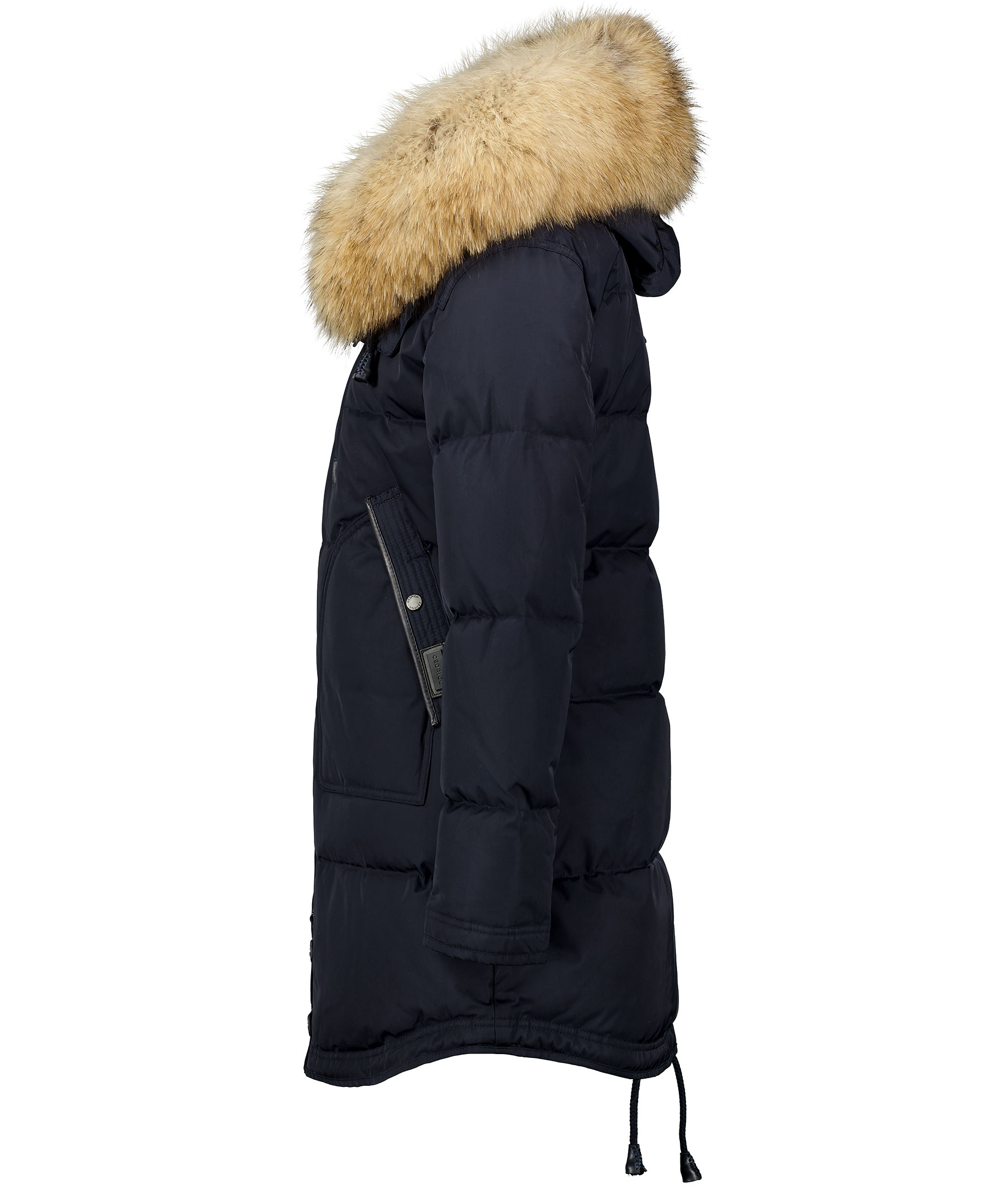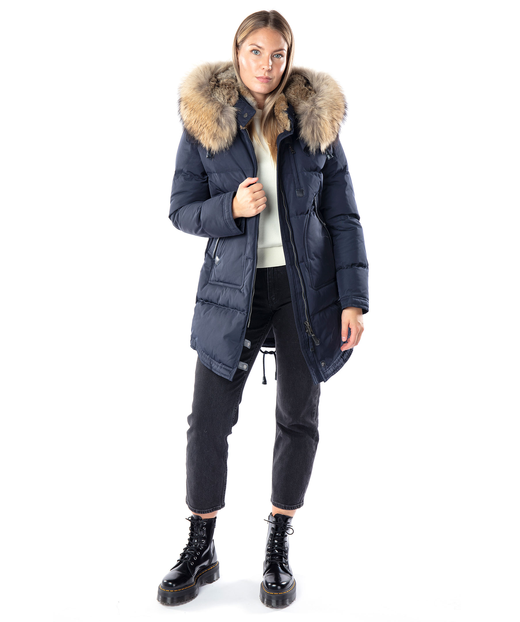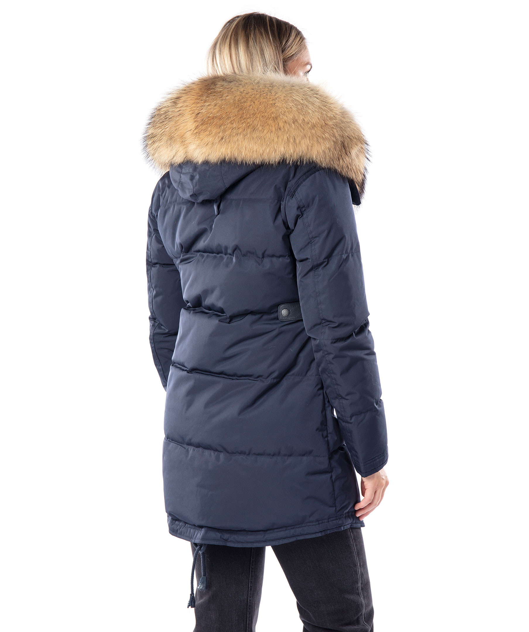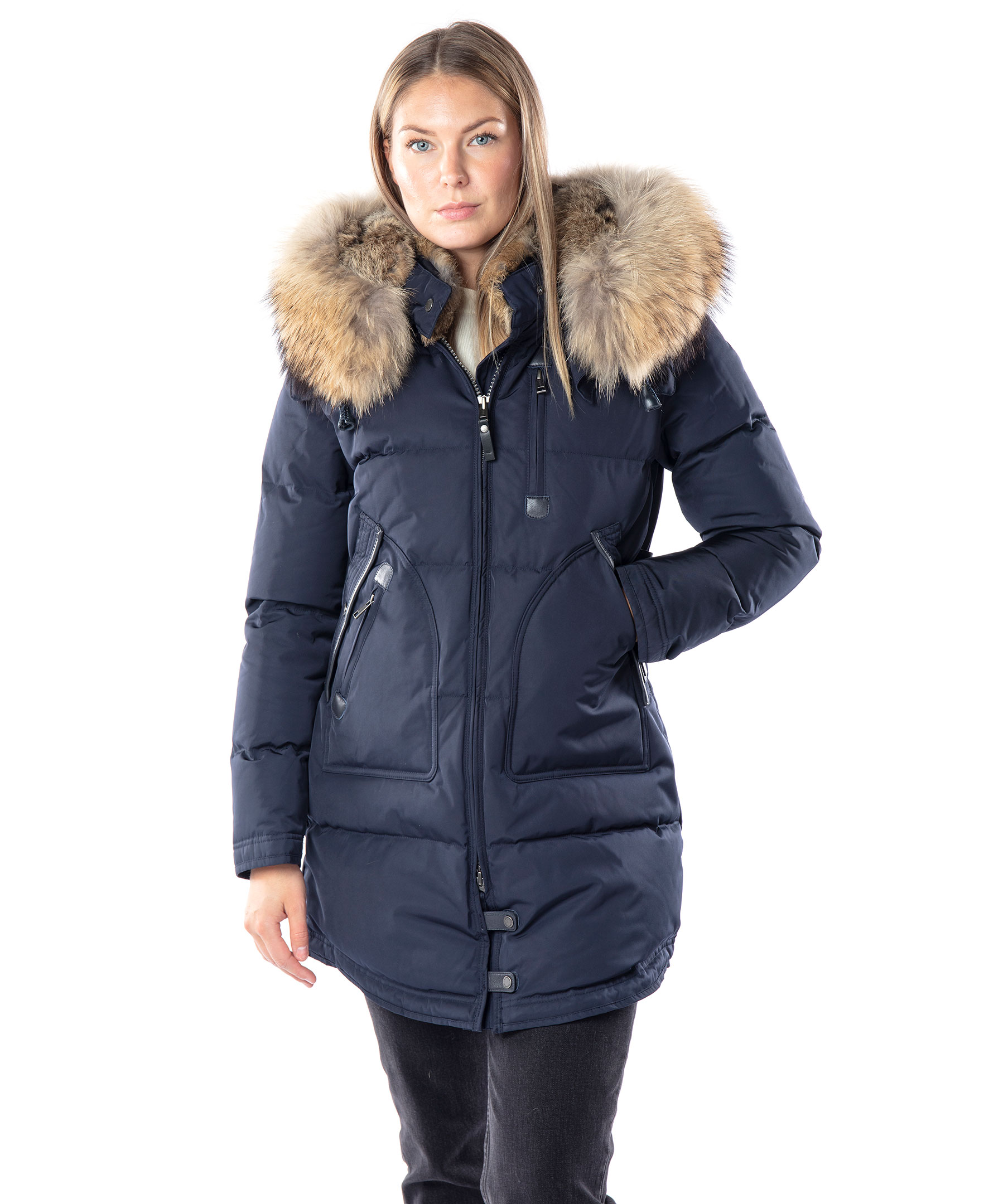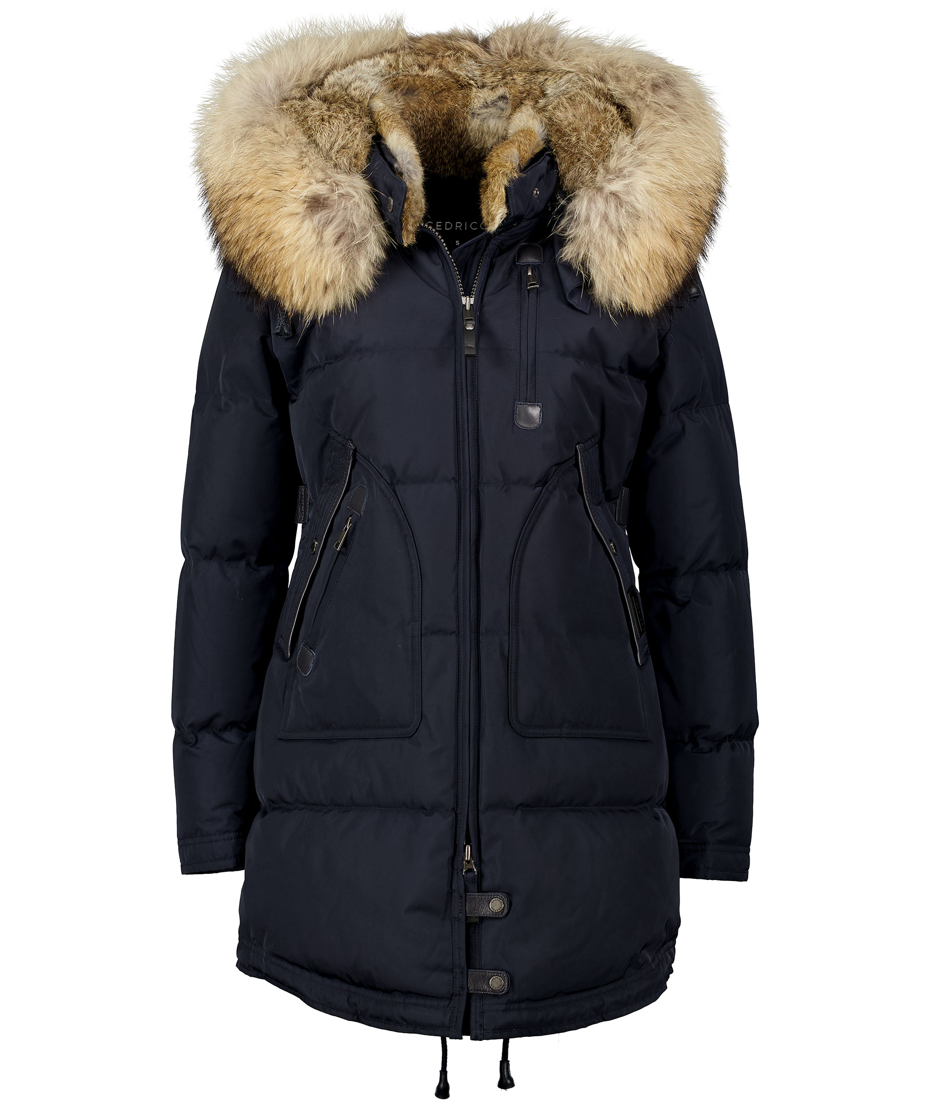 Marinblå, längre dunjacka med luva från det Norska märket Cedrico. Jackan har en avtagbar luva som är fodrad med tvättbjörn och kaninpäls samt har en beige avtagbar pälskrage. Jackan stängs med tvåvägsdragkedja och två knappar längs ner. Snedställda framfickor med ficklock och knapp, en ficka med dragkedja ovanpå den vänstra framfickan och en bröstficka med dragkedja. Detaljer i marinblått läder på fickorna, i sidan av jackan samt vid knappar längs ner fram på jackan. Dolda muddar i ärmslut och dragsko längst ner baktill på jackan. Färgen på pälsen kan variera. Modellen är 175 cm lång och bär storlek S. TIPS! Ånga pälsen för att få den stor och fluffig. OBS! Naturpälsar är unika och kan skilja sig från bilden. * Flera praktiska fickor * Avtagbar luva * Tvåvägsdragkedja
