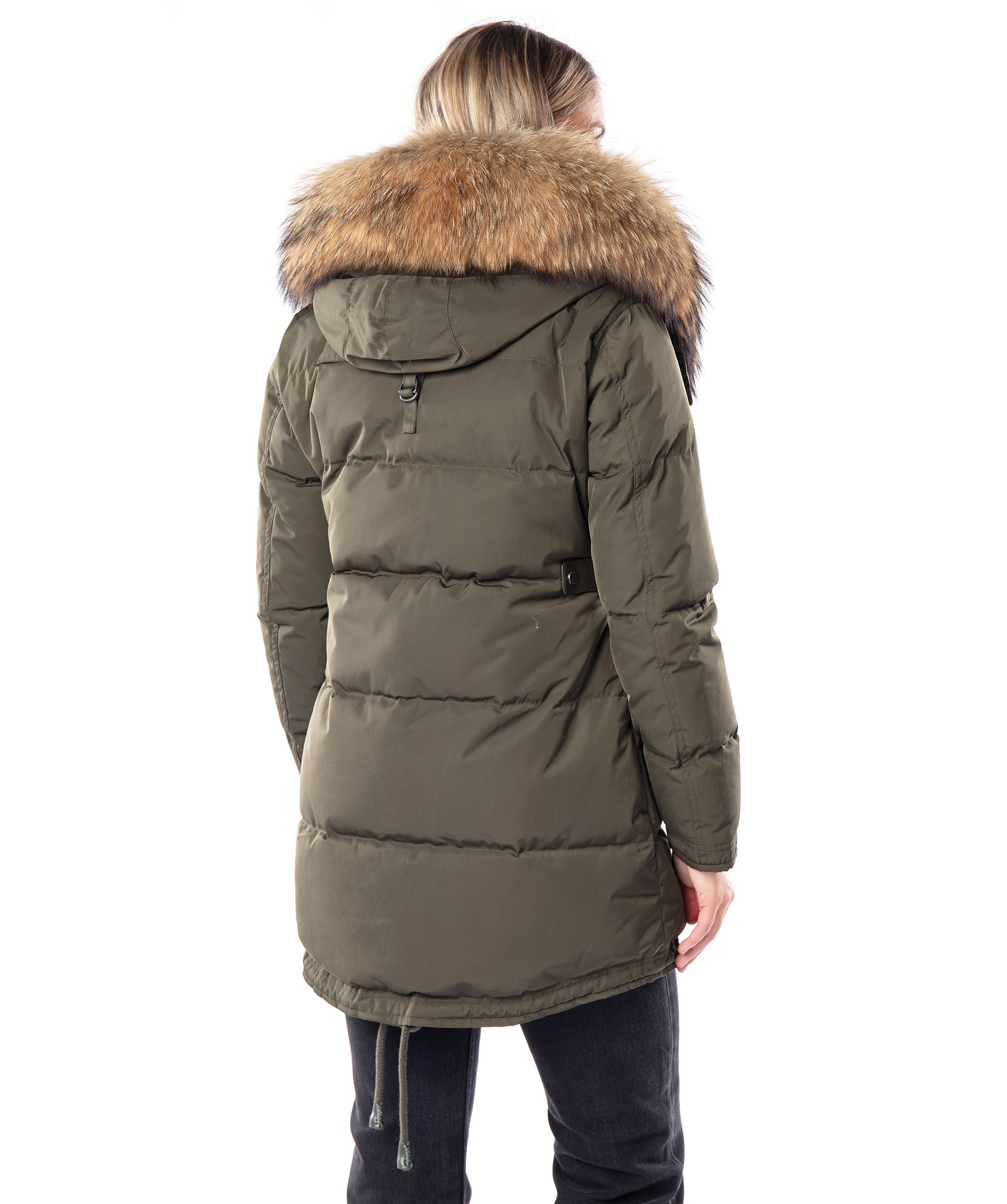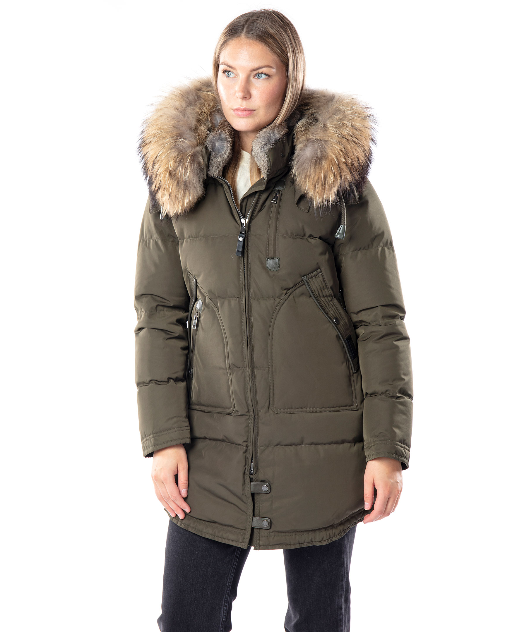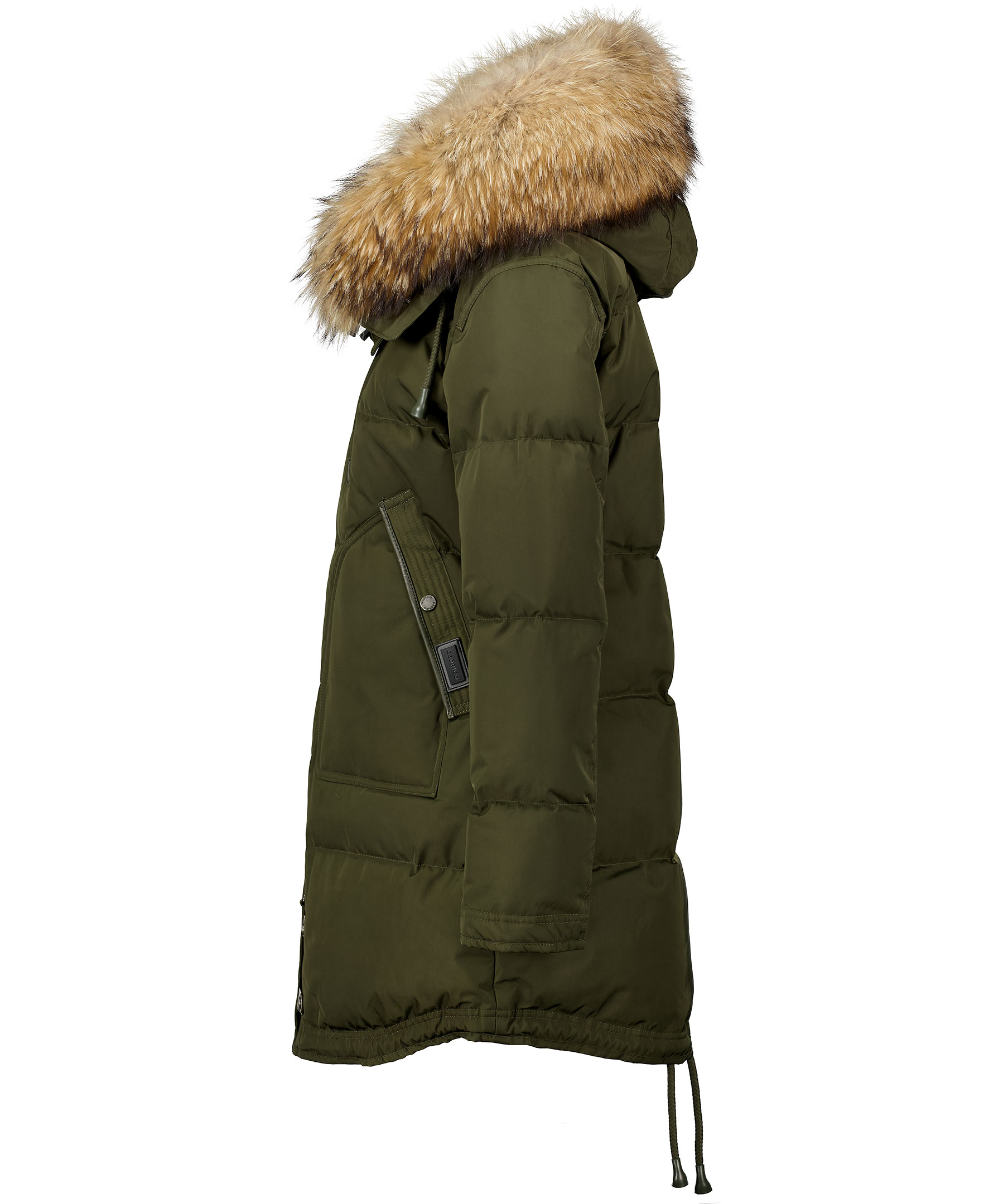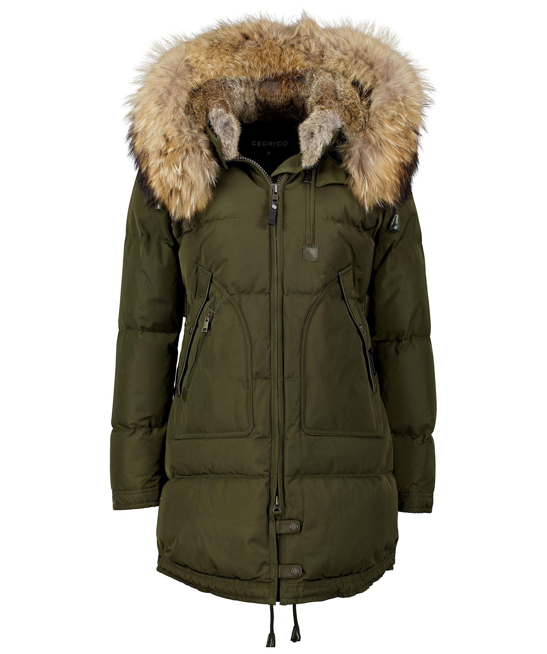 Olivgrön, längre dunjacka med luva från det Norska märket Cedrico. Jackan har en avtagbar luva som är fodrad med tvättbjörn och kaninpäls samt har en beige avtagbar pälskrage. Jackan stängs med tvåvägsdragkedja och två knappar längs ner. Snedställda framfickor med ficklock och knapp, en ficka med dragkedja ovanpå den vänstra framfickan och en bröstficka med dragkedja. Detaljer iolivgrönt läder på fickorna, i sidan av jackan samt vid knappar längs ner fram på jackan. Dolda muddar i ärmslut och dragsko längst ner baktill på jackan. Färgen på pälsen kan variera. Modellen är 175 cm lång och bär storlek S. TIPS! Ånga pälsen för att få den stor och fluffig. OBS! Naturpälsar är unika och kan skilja sig från bilden.