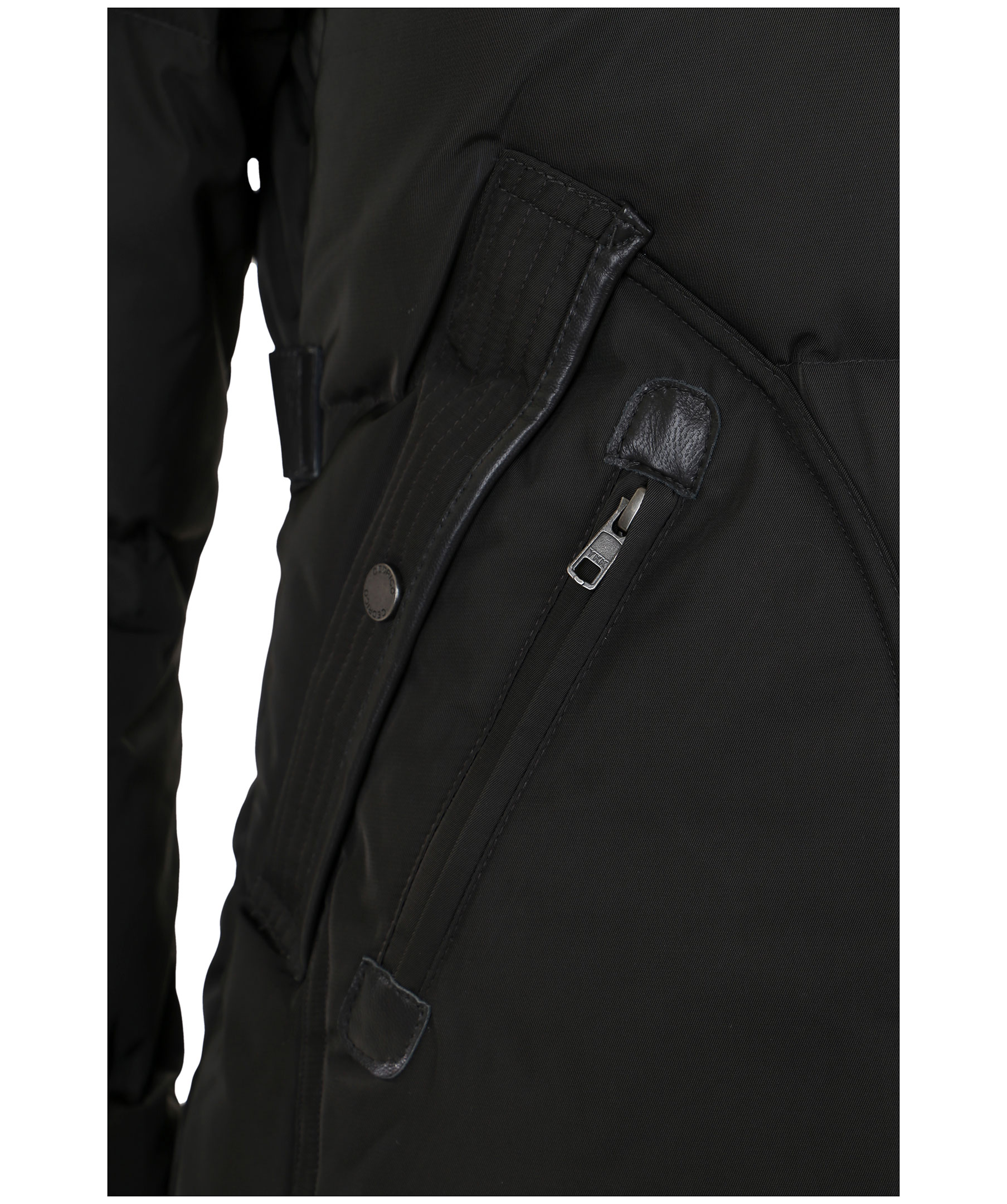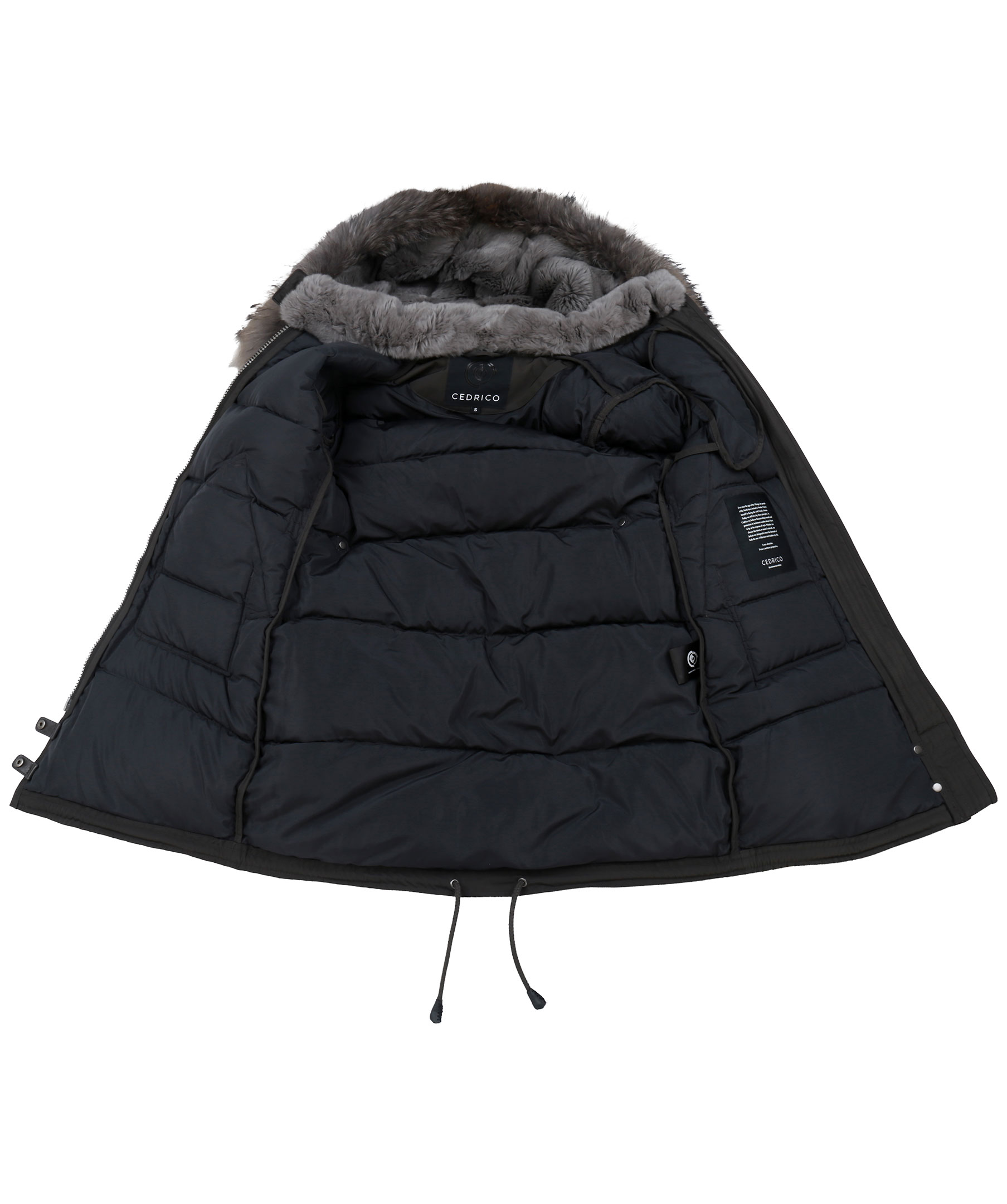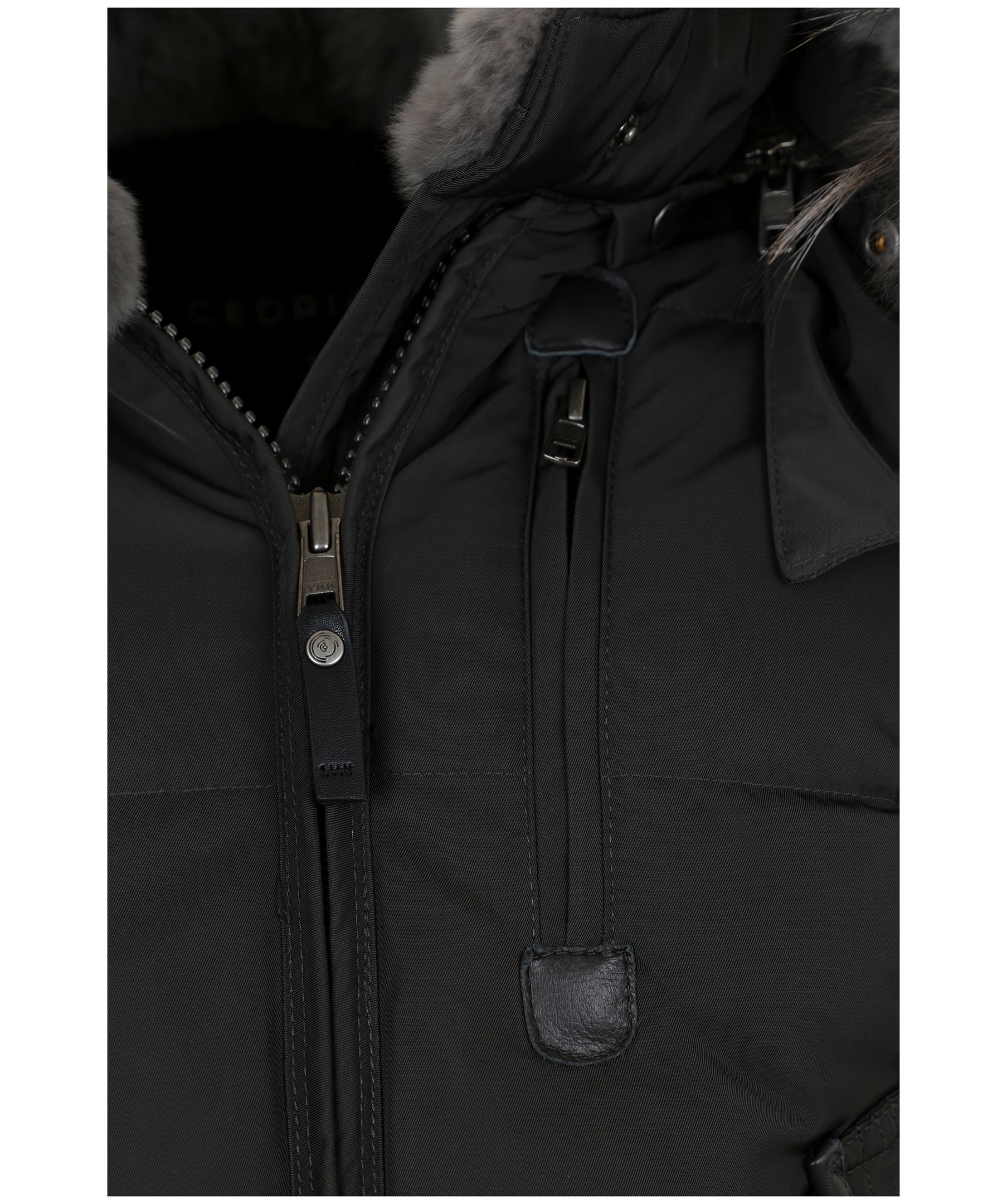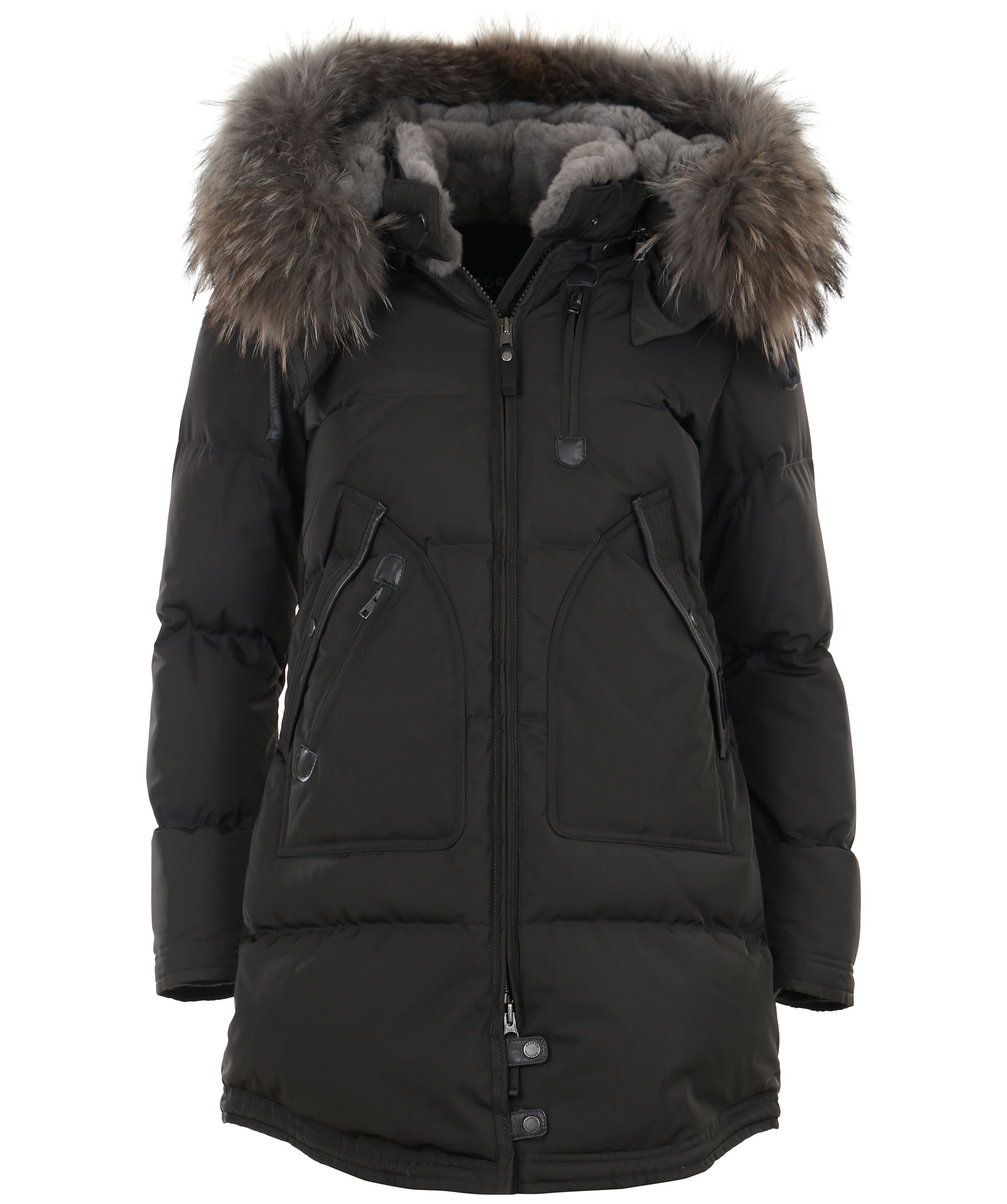 Grå, snygg längre dunjacka med huva från det Norska märket Cedrico. Jackan har löstagbar huva samt pälskrage som är fodrad med kaninpäls. Tvåvägsdragkedja och två snedställda fickor med ficklock och knapp samt en ficka med dragkedja. En bröstficka med dragkedja. Samtliga fickor har skinndetaljer samt även skinndetaljer i sidan av jackan samt vid knappar längs ner fram på jackan. Dragsko finns längst ner baktill på jackan.