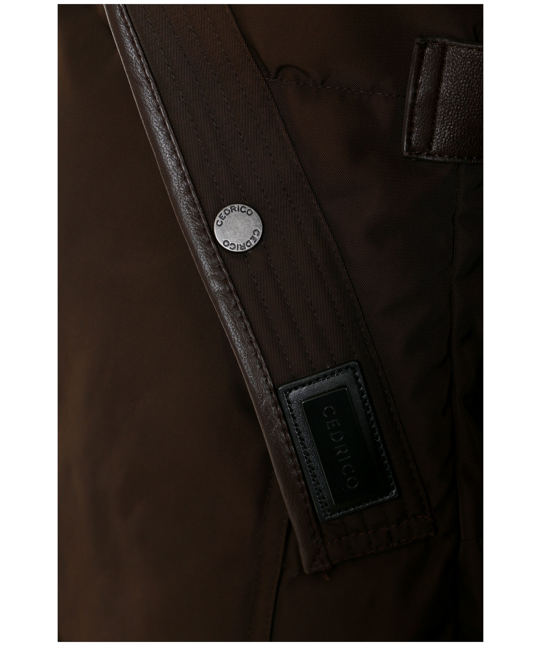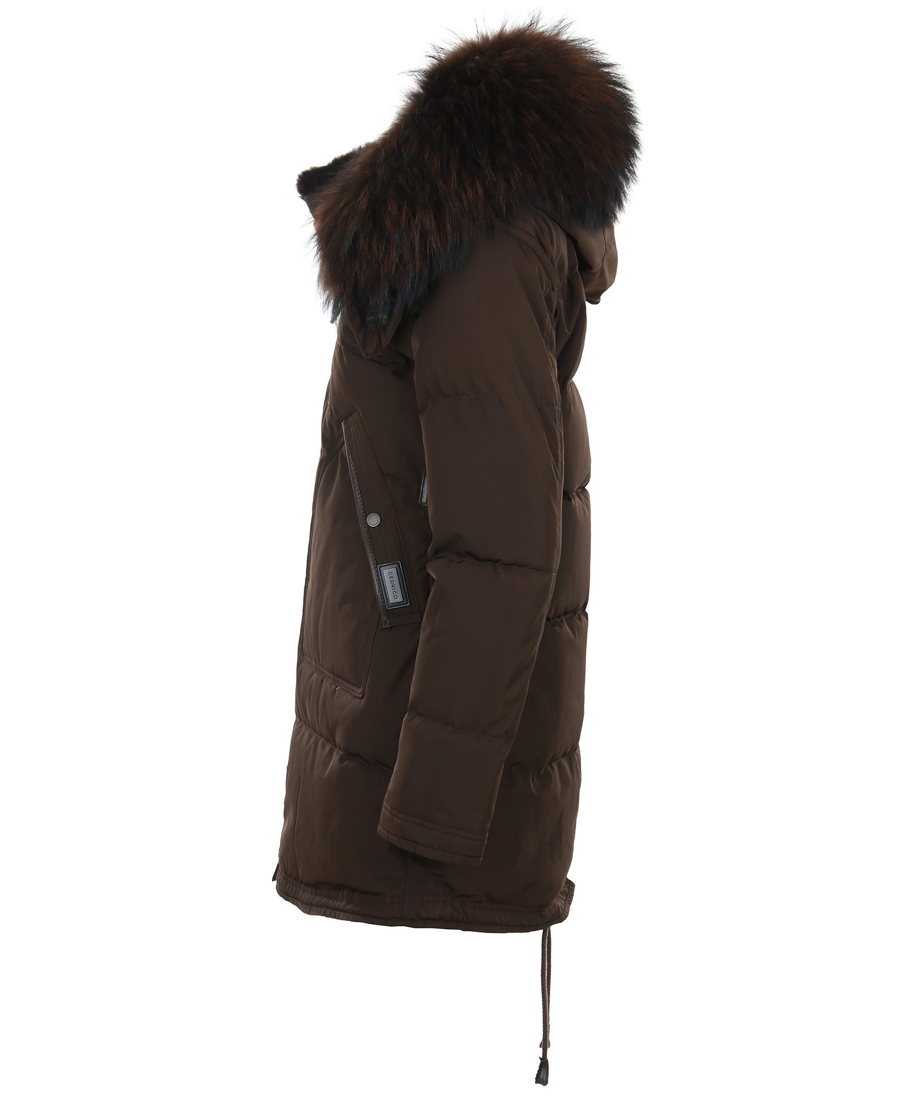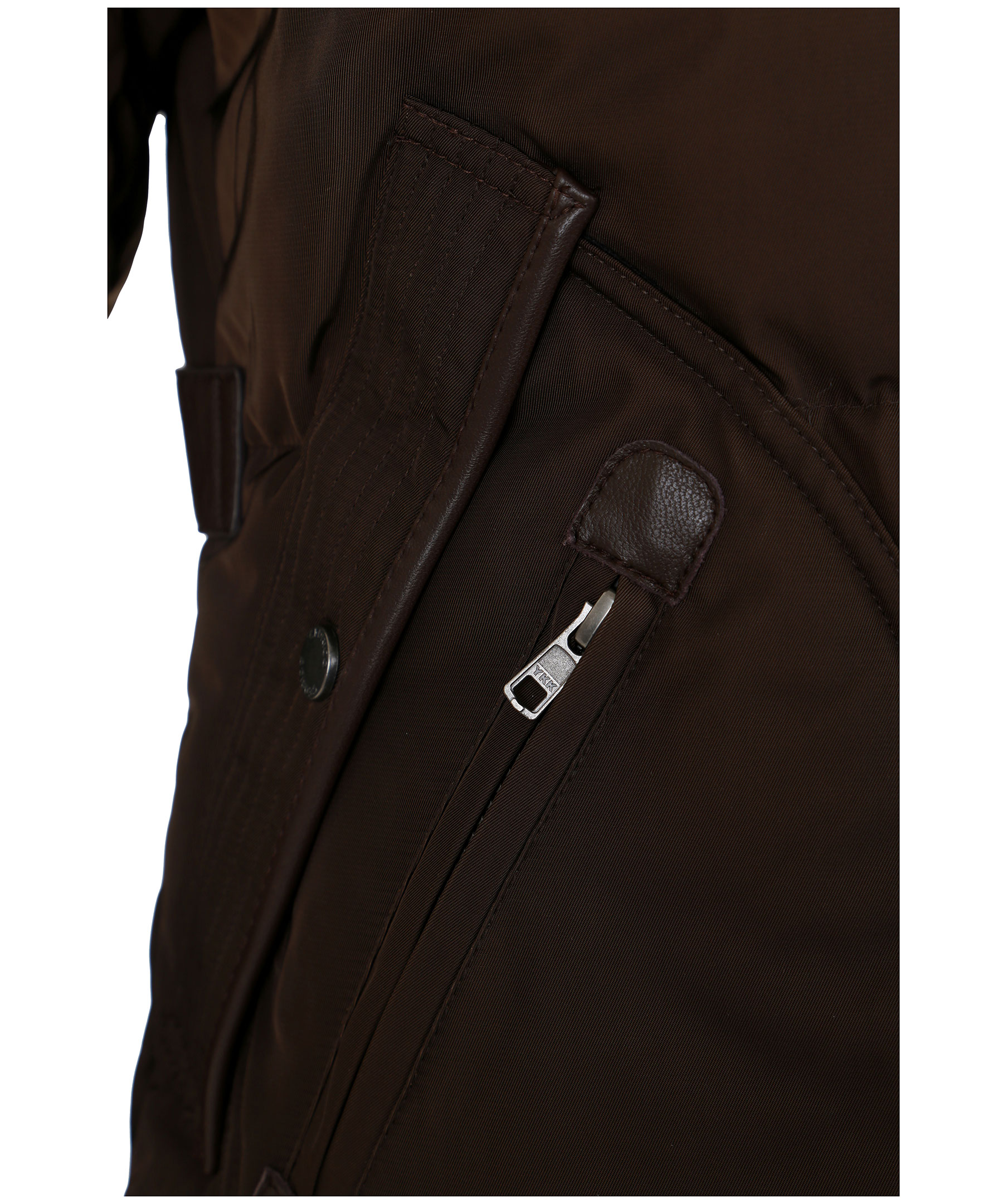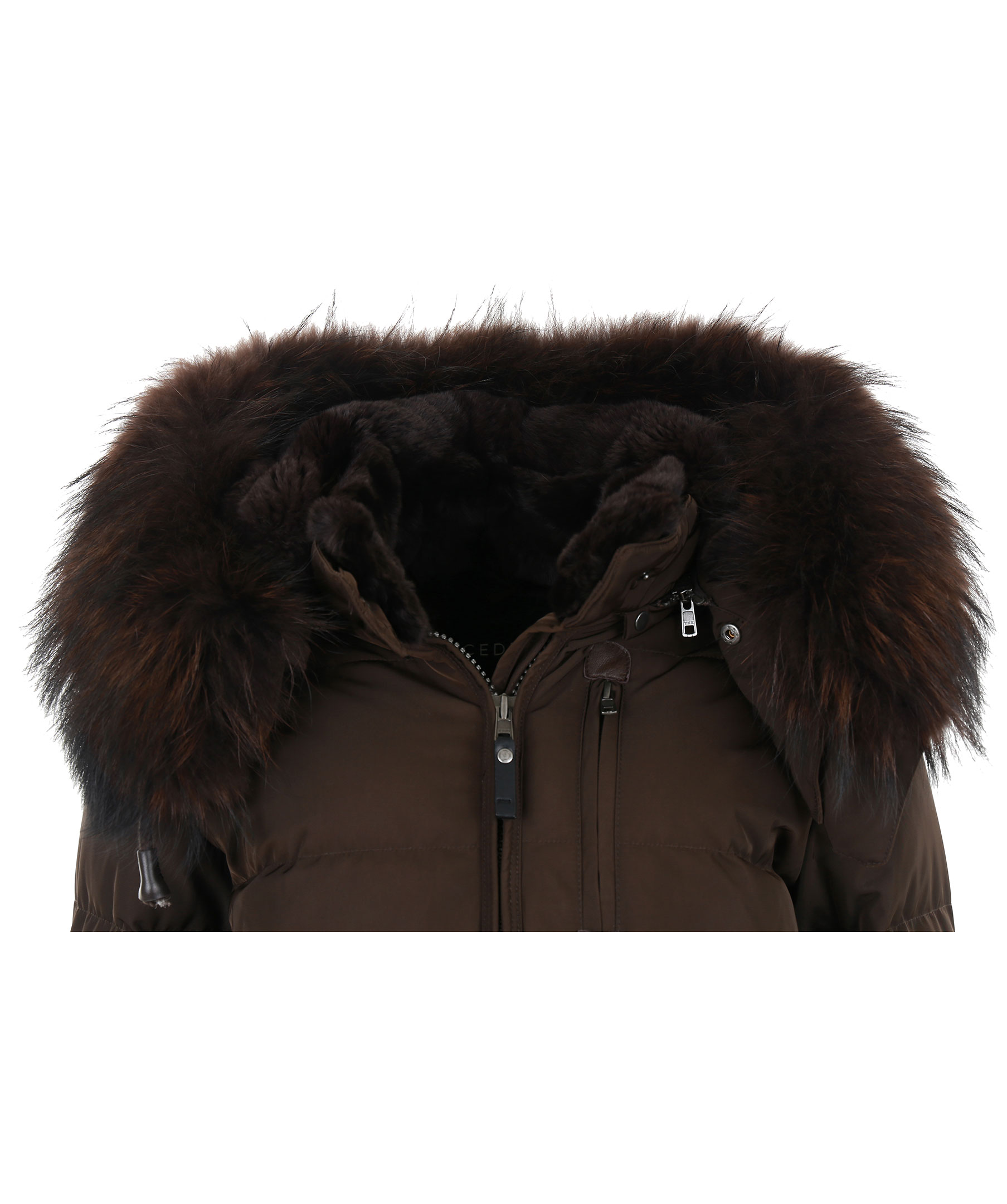 Brun, snygg längre dunjacka med huva från det Norska märket Cedrico. Jackan har löstagbar huva samt pälskrage som är fodrad med kaninpäls. Tvåvägsdragkedja och två snedställda fickor med ficklock och knapp samt en ficka med dragkedja. En bröstficka med dragkedja. Samtliga fickor har skinndetaljer samt även skinndetaljer i sidan av jackan samt vid knappar längs ner fram på jackan. Dragsko finns längst ner baktill på jackan.