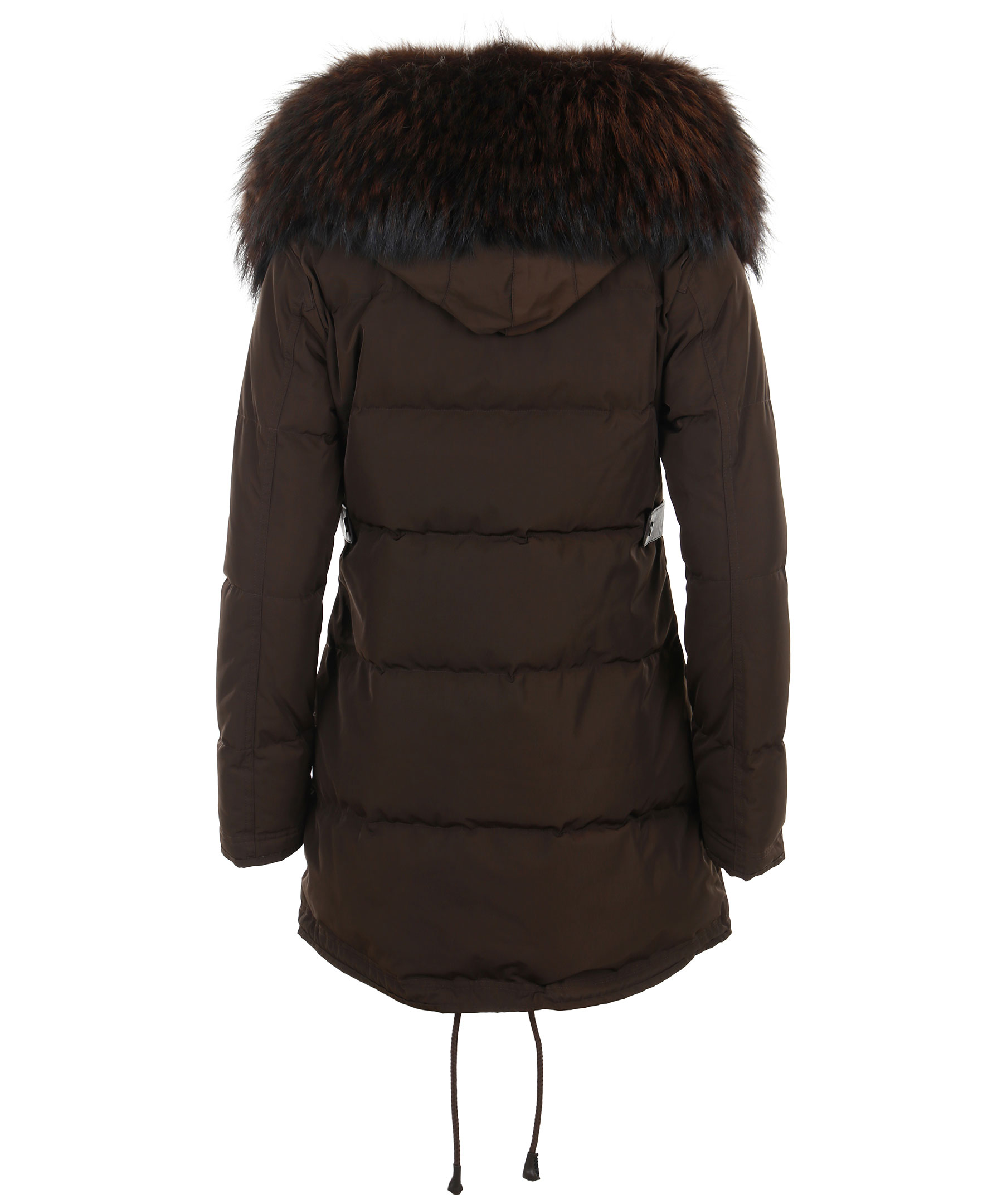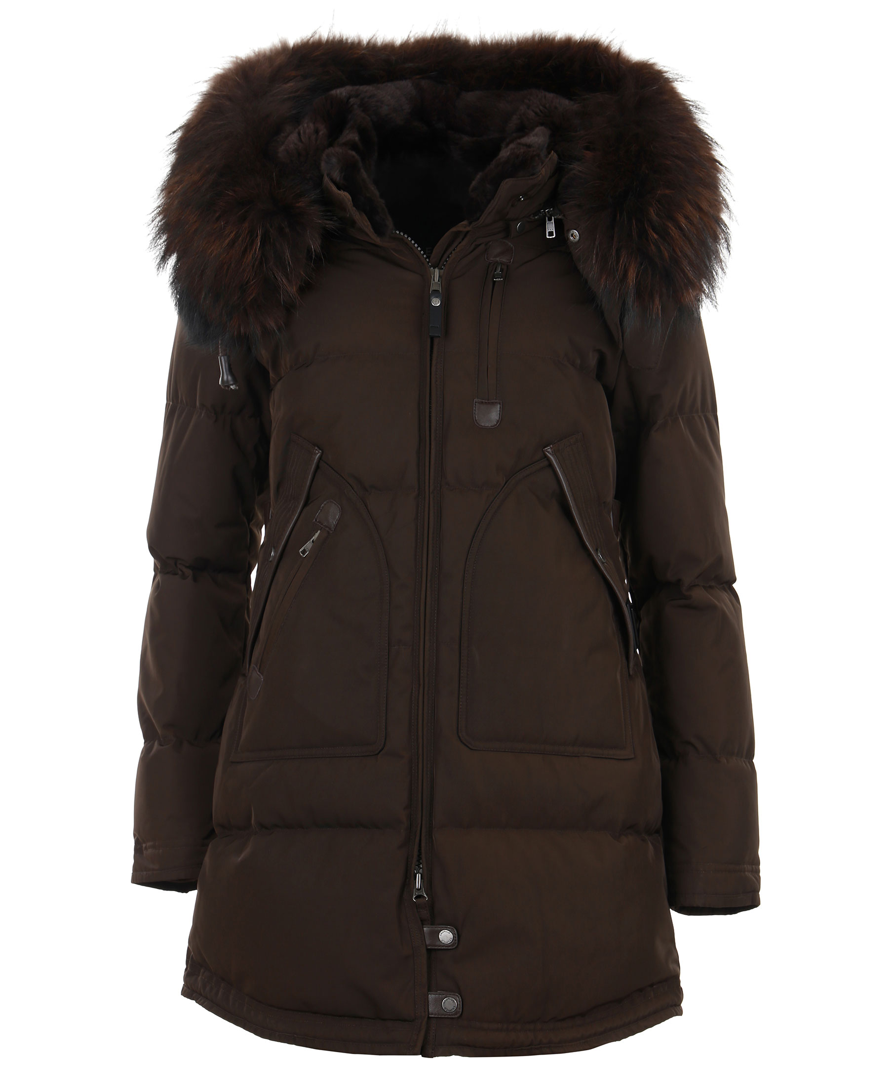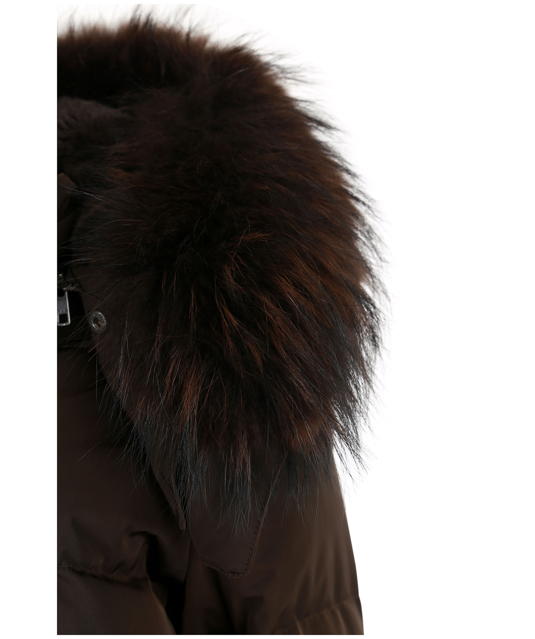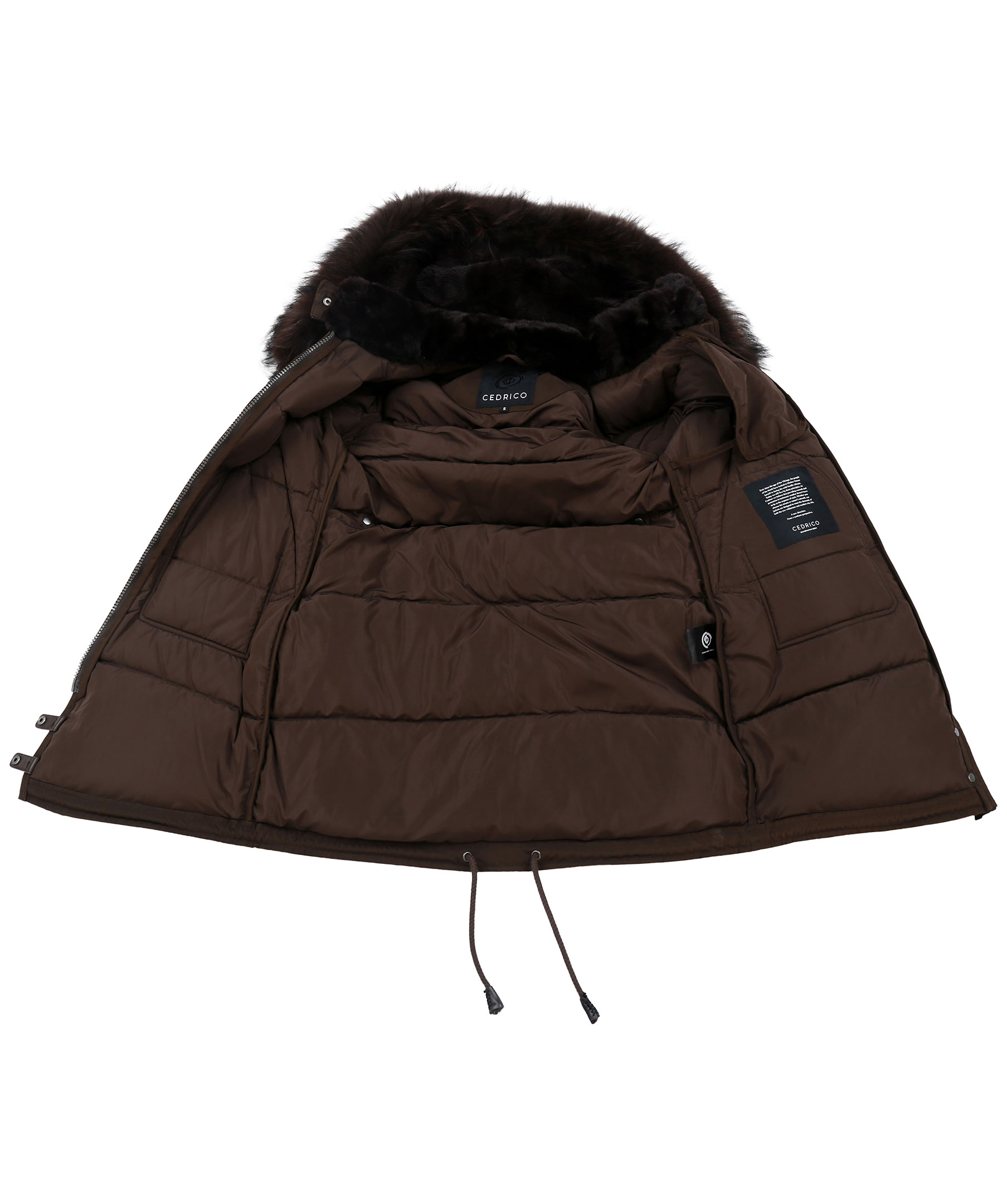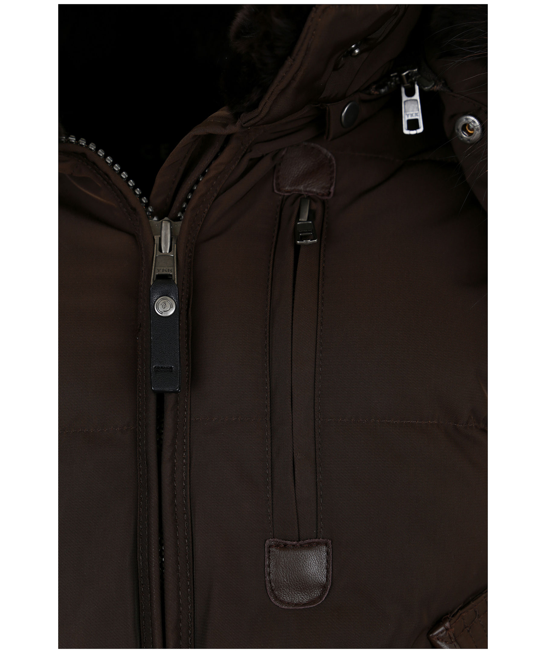 Brun, snygg längre dunjacka med huva från det Norska märket Cedrico. Jackan har löstagbar huva samt pälskrage som är fodrad med kaninpäls. Tvåvägsdragkedja och två snedställda fickor med ficklock och knapp samt en ficka med dragkedja. En bröstficka med dragkedja. Samtliga fickor har skinndetaljer samt även skinndetaljer i sidan av jackan samt vid knappar längs ner fram på jackan. Dragsko finns längst ner baktill på jackan.
