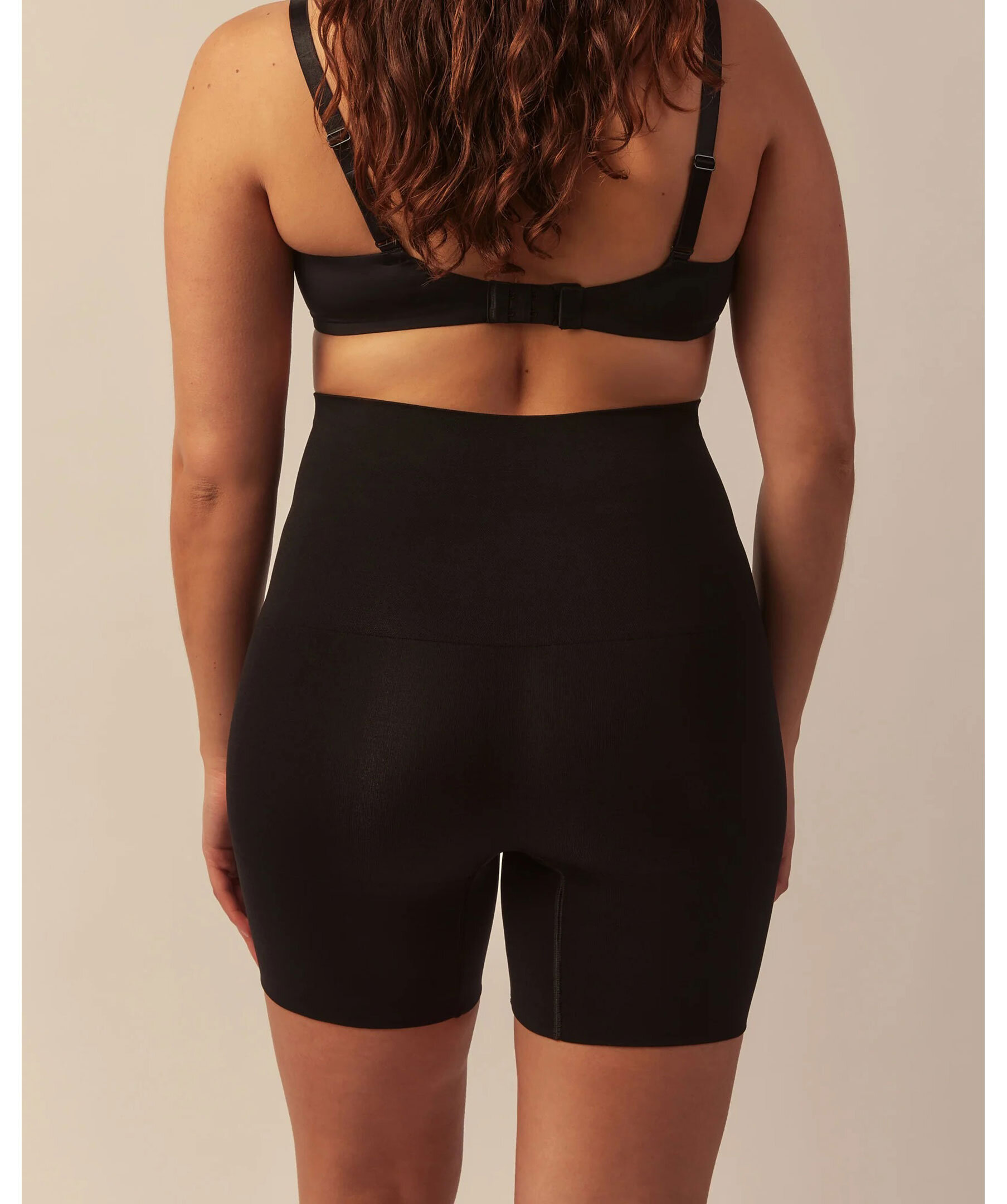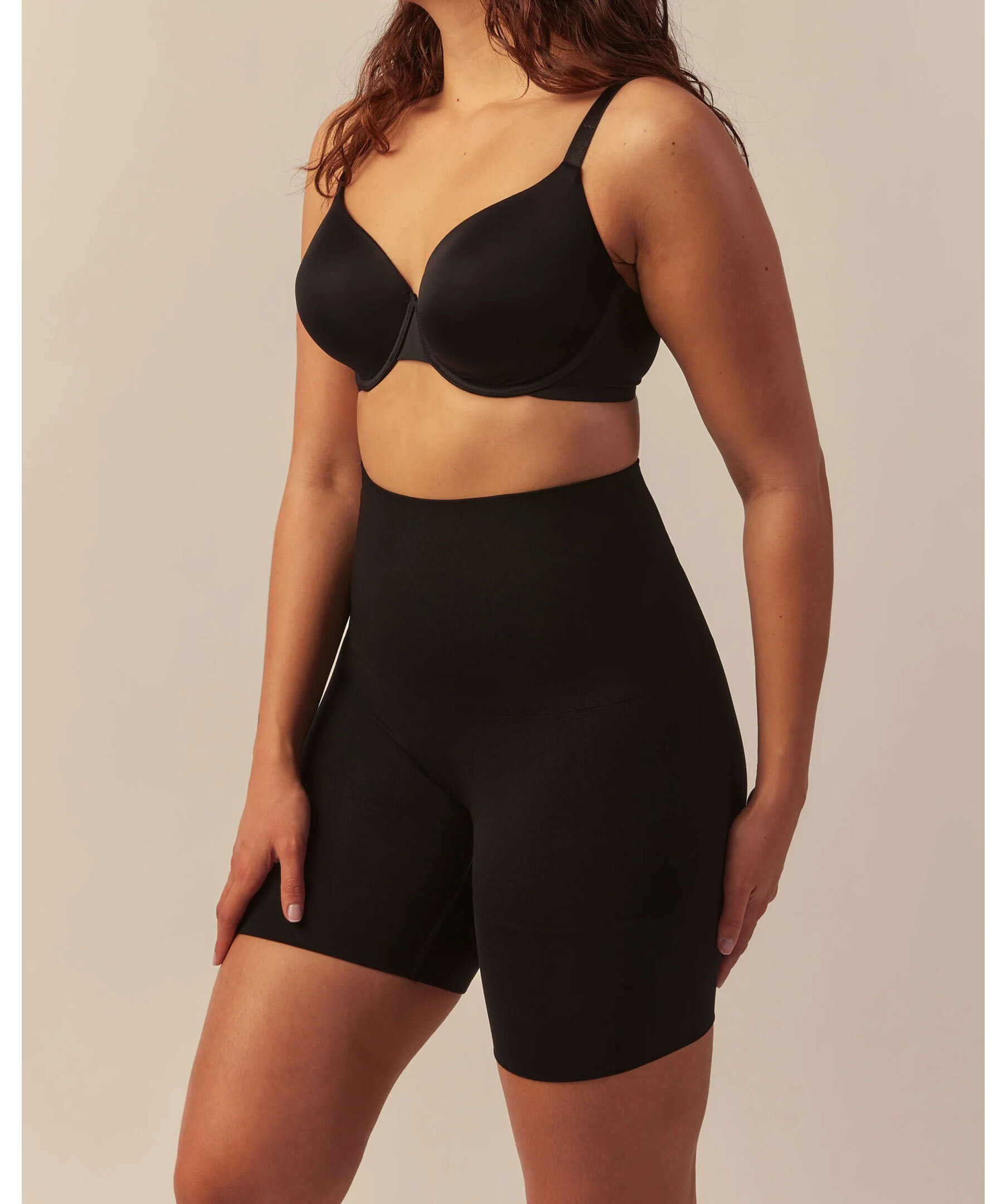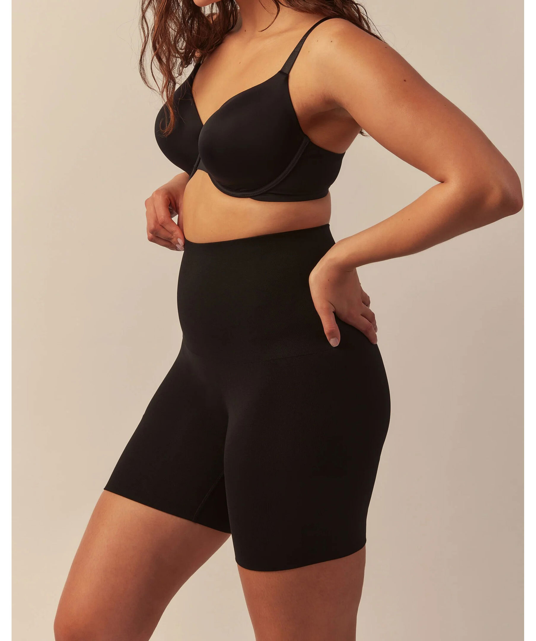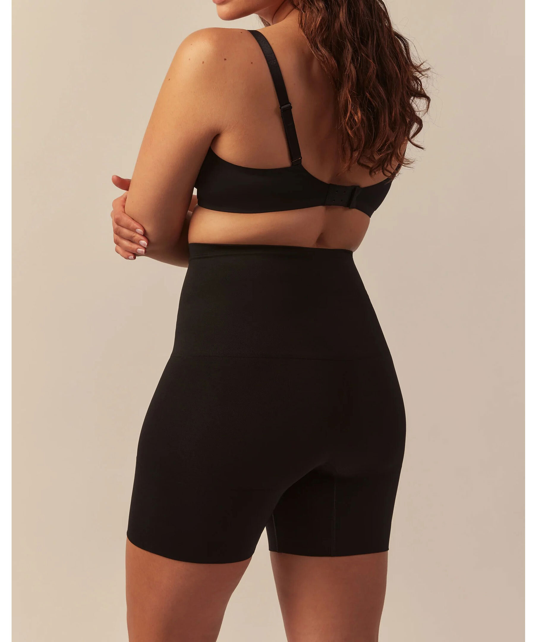 Svarta högmidjade shorts som ger lätt formande stöd för mage, lår och rumpa. Designade för osynlig användning under klänningar eller byxor, de lyfter och slätar samtidigt som de är mjuka, lätta och andas.