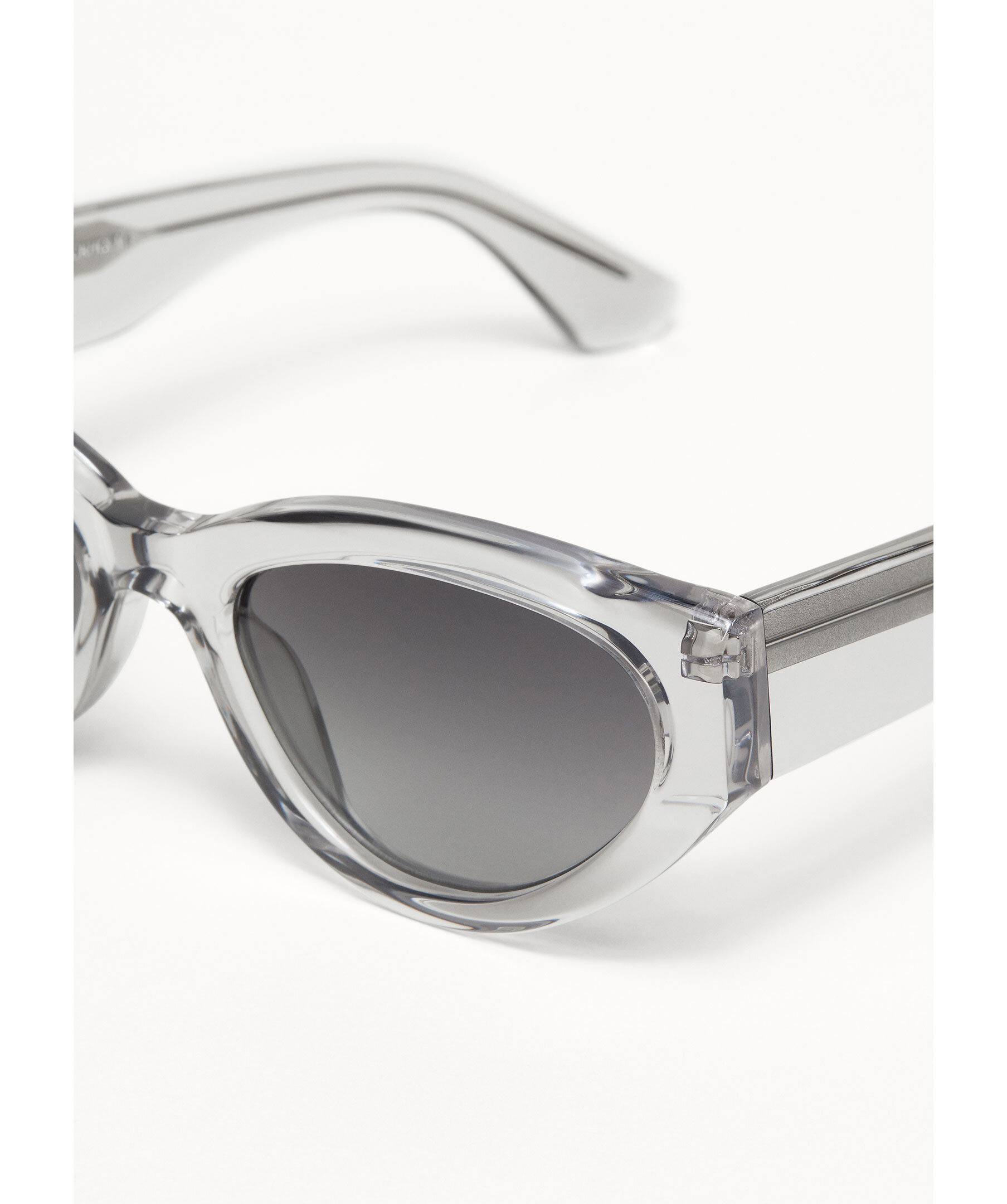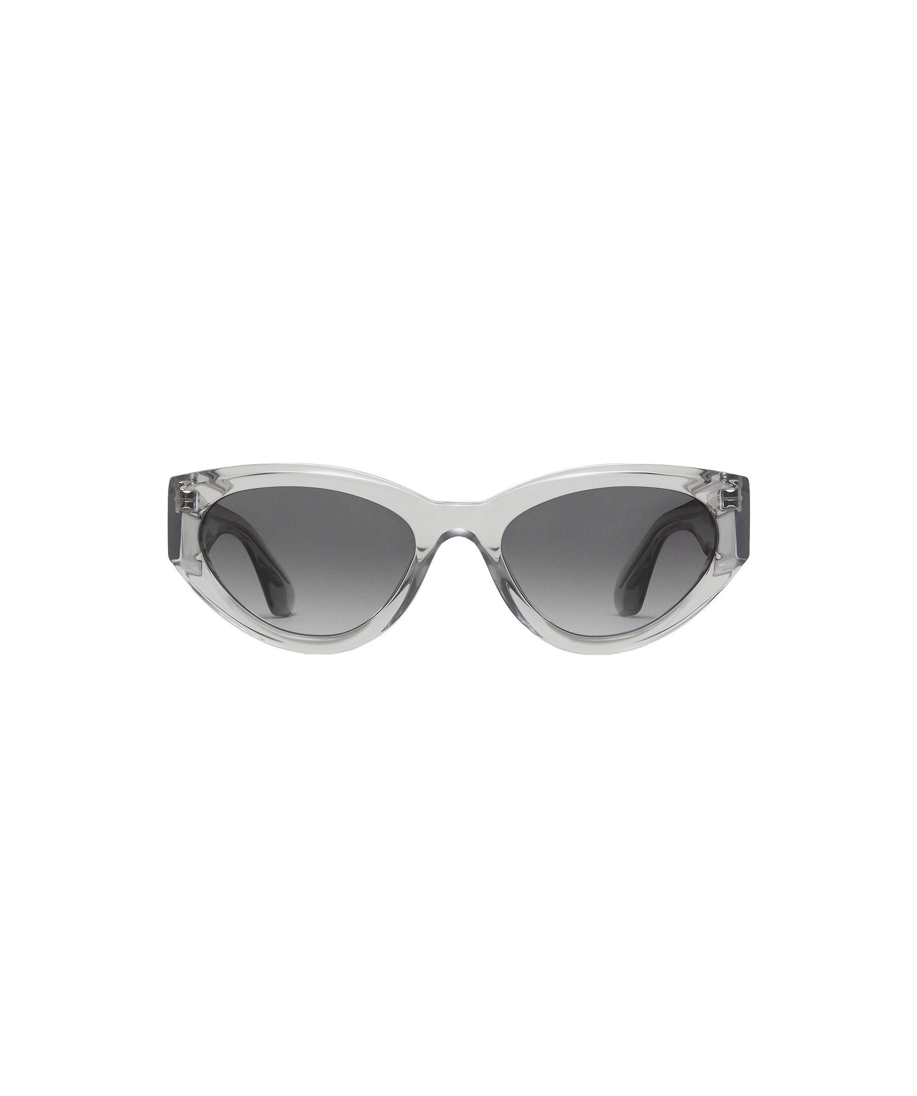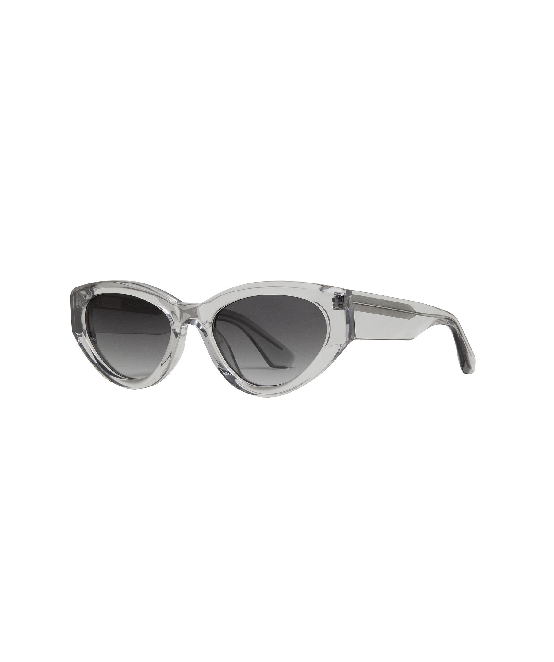Gråa, transparenta solglasögon i modell 06 från Chimi. 06 är en modern kattöga med fyrkantiga vingar. Utrustad med mjukt rundade UV-skyddande CR39-linser.
