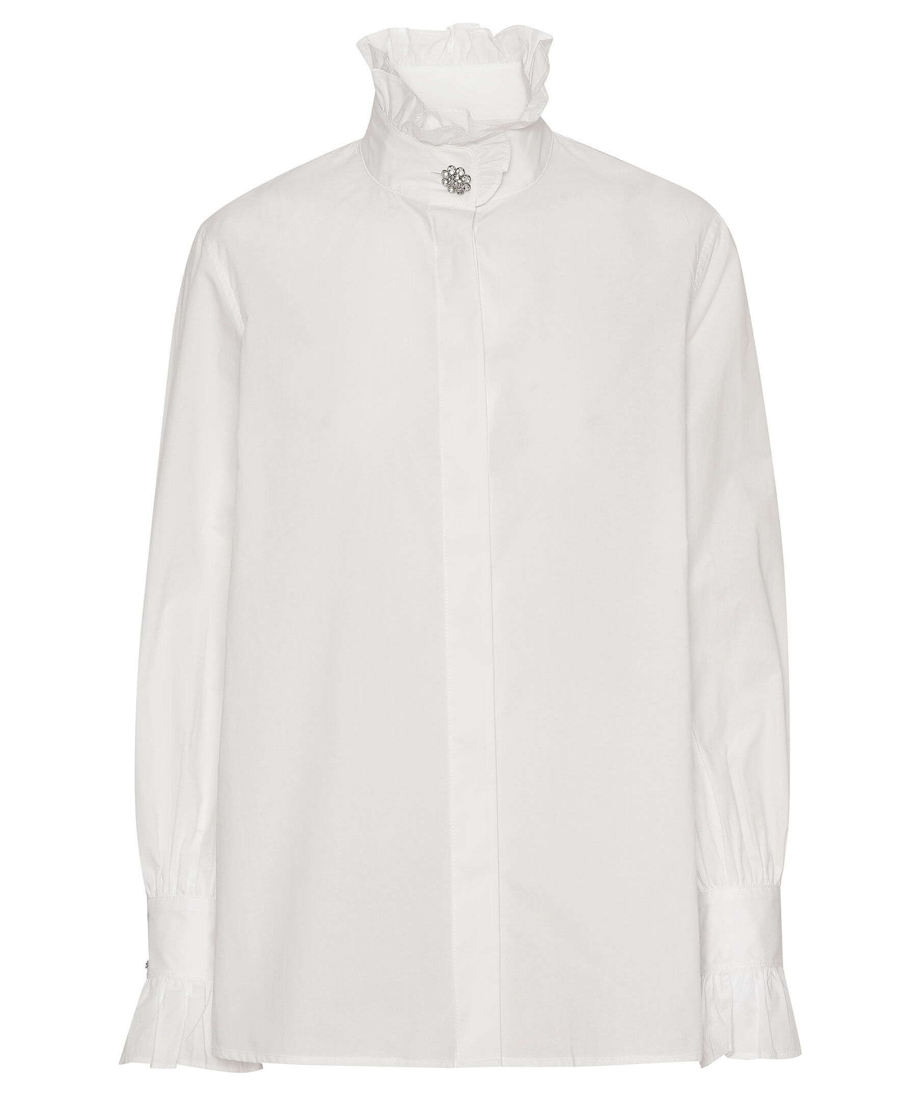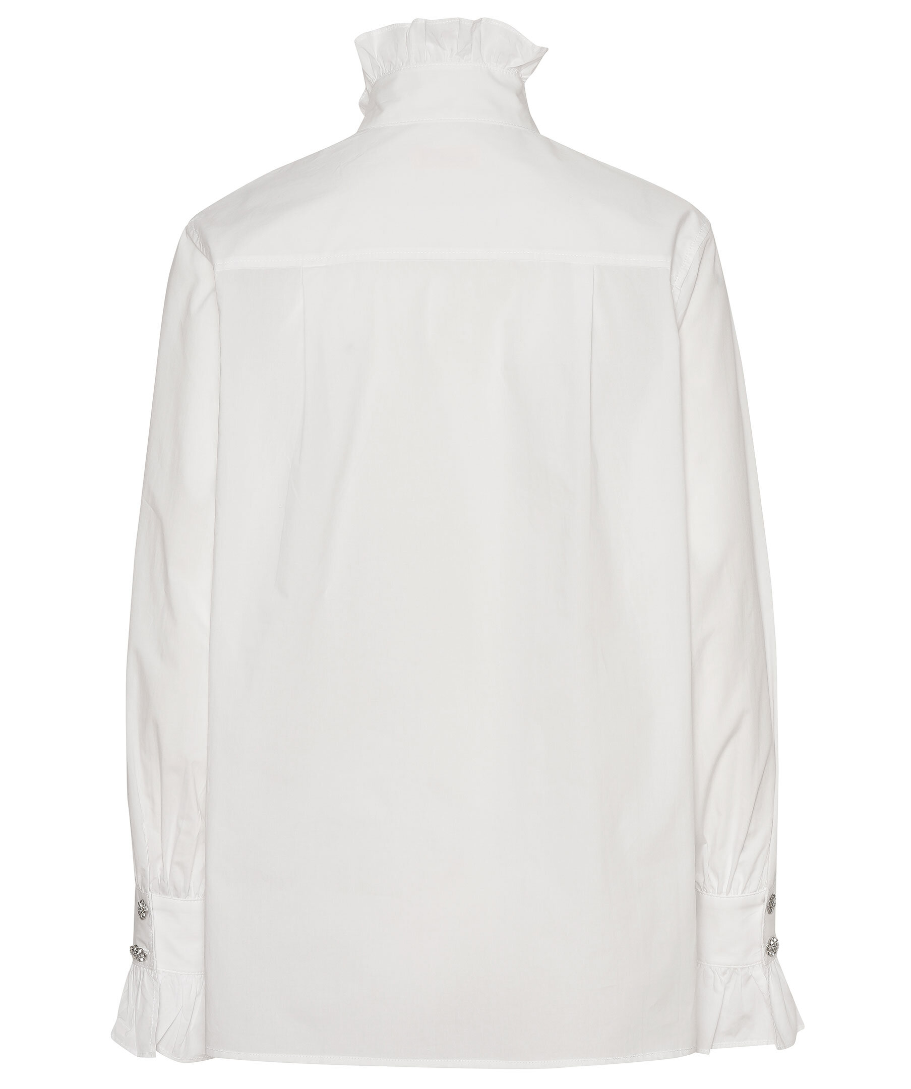 Vit poplinblus från Custommade i ekologiskt bomull. Hög krage, volang detaljer på kragen och ärmslut.