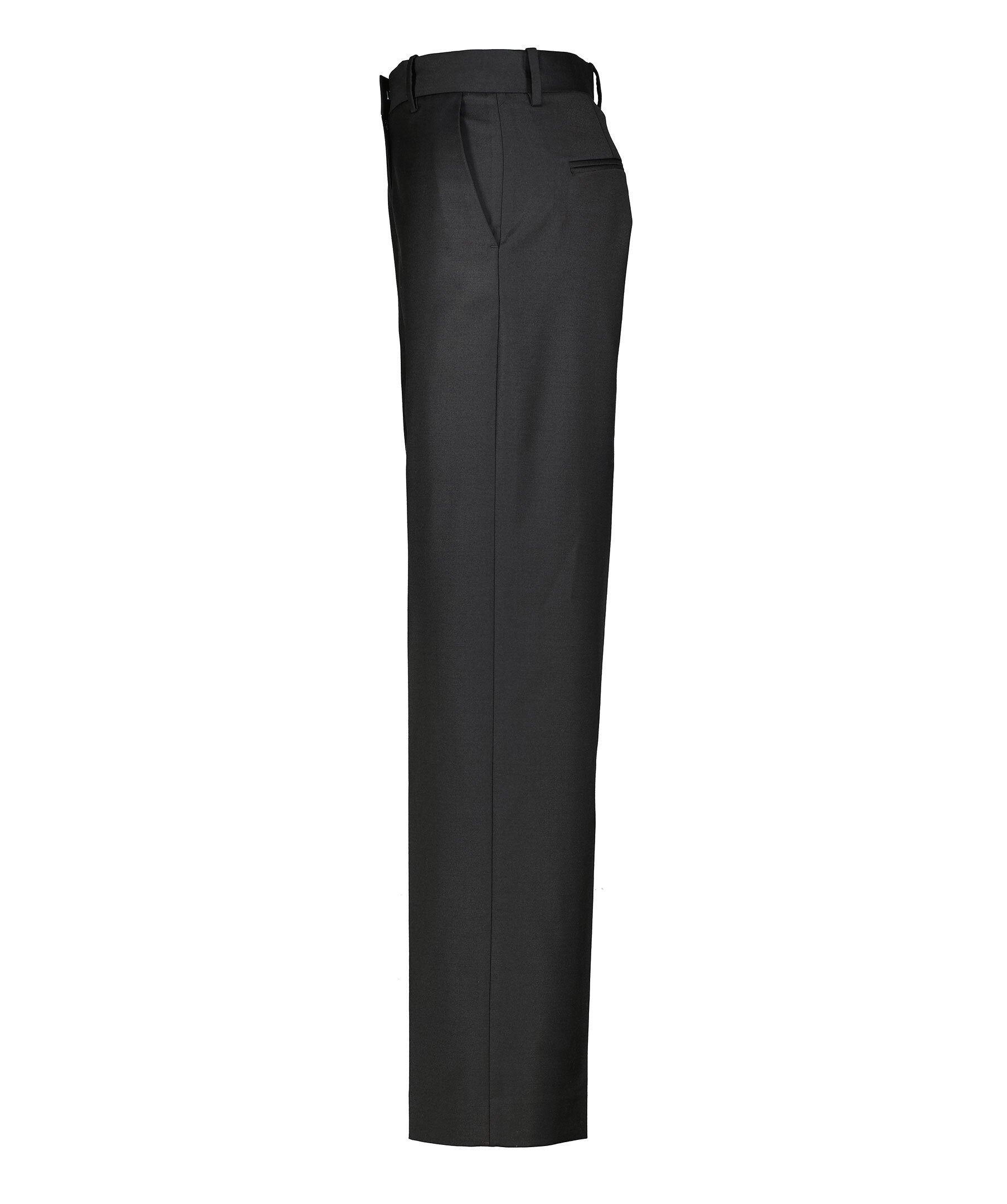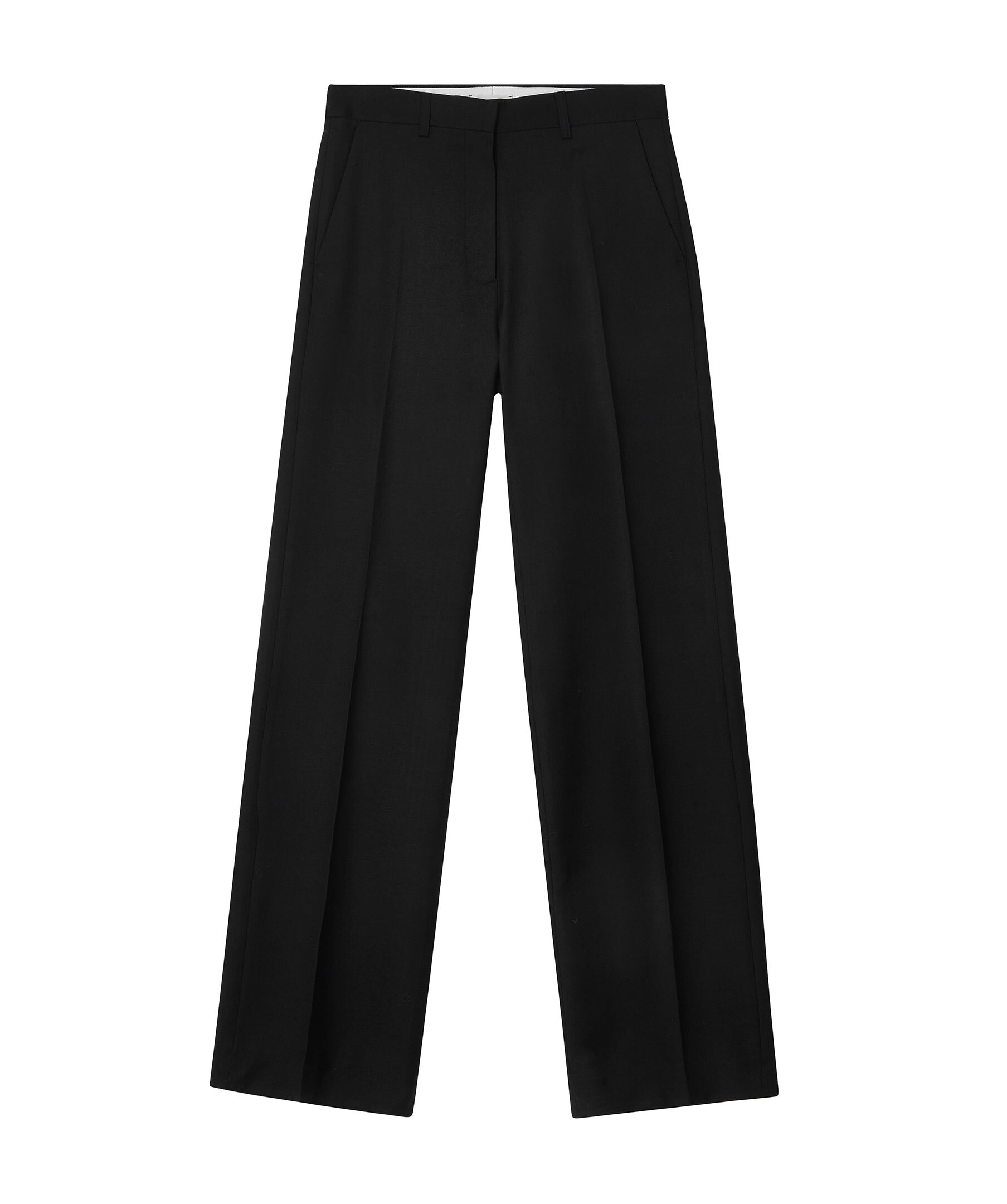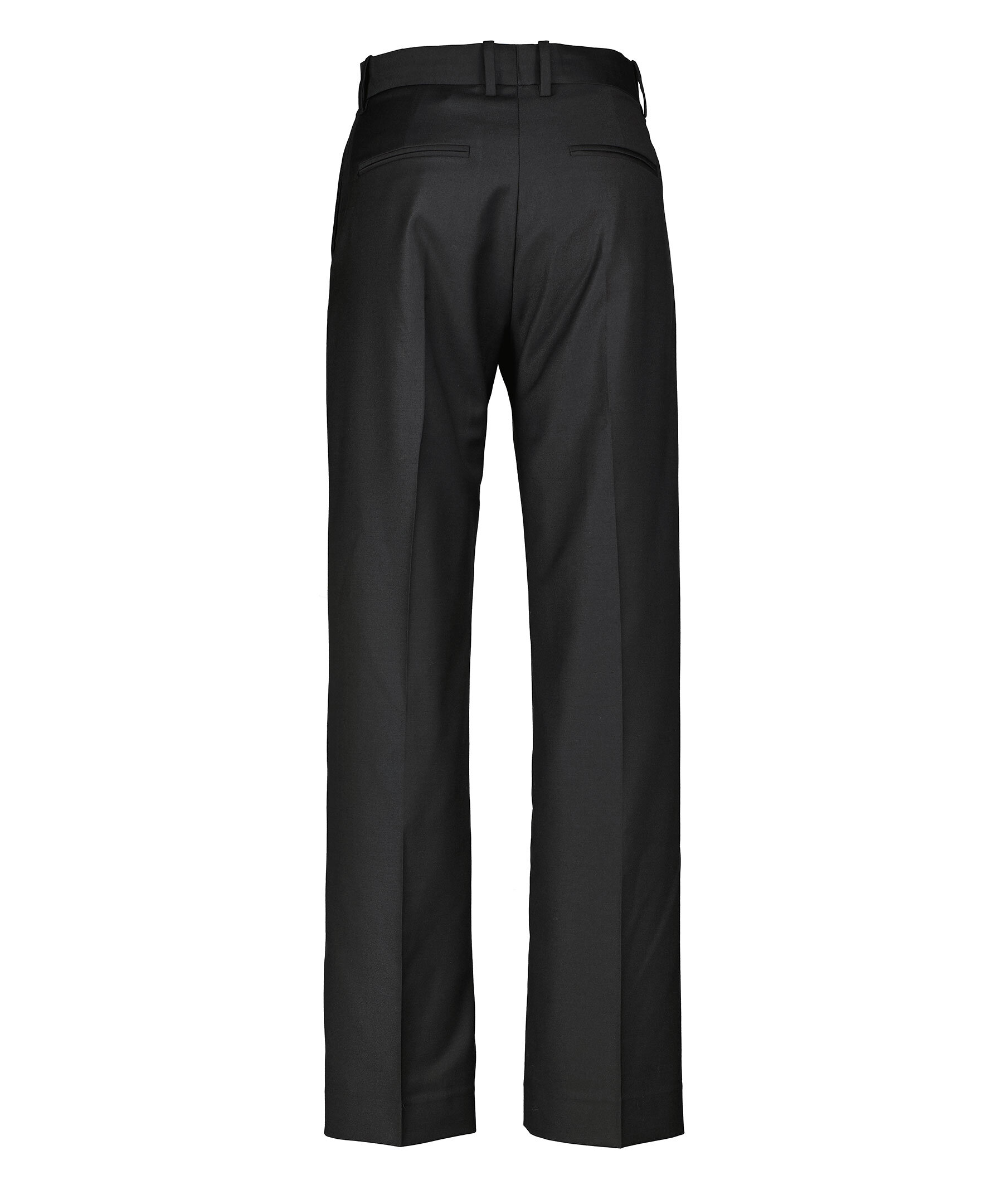 Svarta kostymbyxor från Dagmar. Byxorna har låg midja med bälteshällor, pressveck fram och bak samt två sidfickor och två passpoalfickor bak. Tillverkade i en ullblandning.