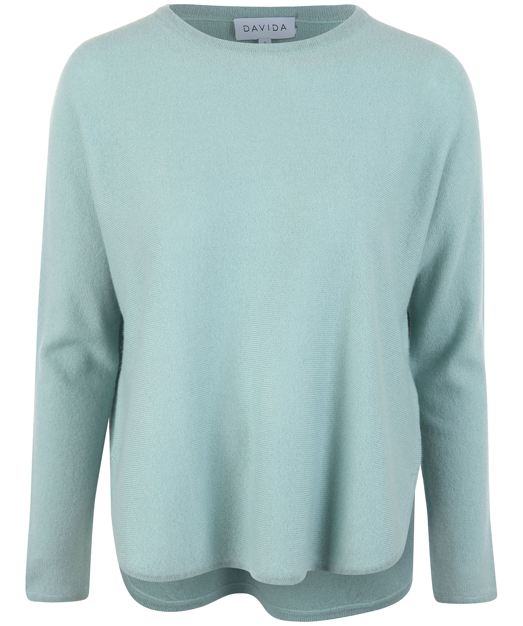 Ljusgrön finstickad sweatshirt i en avslappnad passform från Davida, gjord i 100% mjukt kashmir. Tröjan har slits på sidorna och är rundade kanter nertill. Ribbstickade muddar.