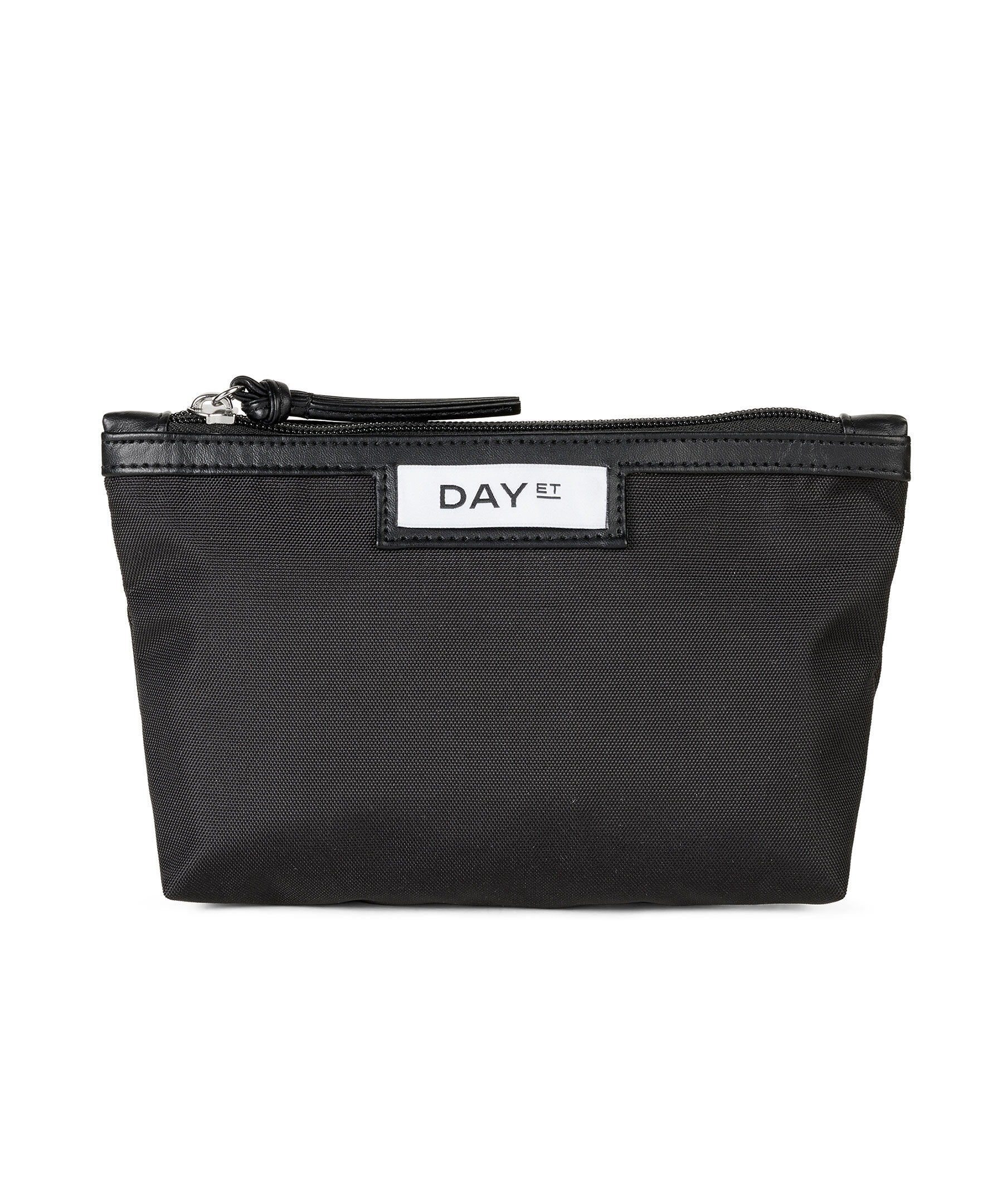 Svart necessär i vävt material från Day ET. Huvudfacket stängs med dragkedja. Tillverkad i Nylon. Lapp med logotyp framtill. Detaljer i läder. Necessärens mått: H: 13cm W: 18cm D: 4cm.