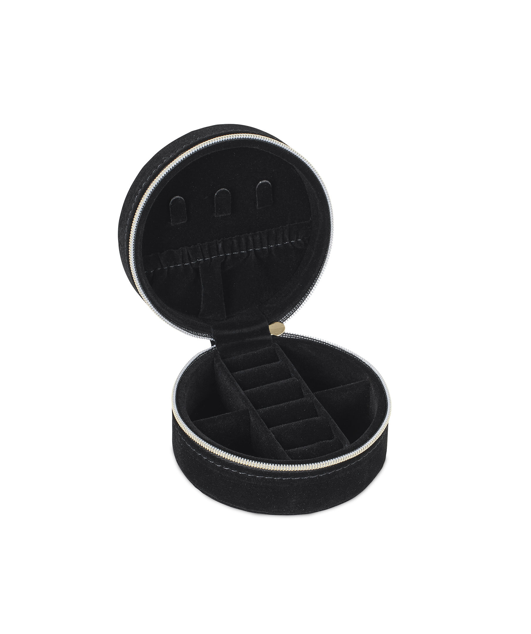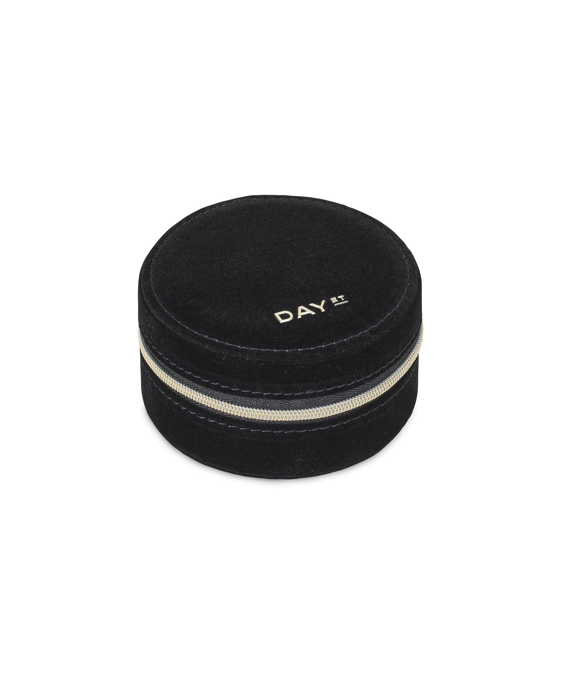 Svart, runt smyckesskrin från Day ET. Huvudfacket stängs med guldfärgad dragkedja. Guldfärgad logotyp i metall. Flera innerfack för olika sorters smycken. Mått: H: 5,2cm W: 9,2cm D: 9,2cm.
