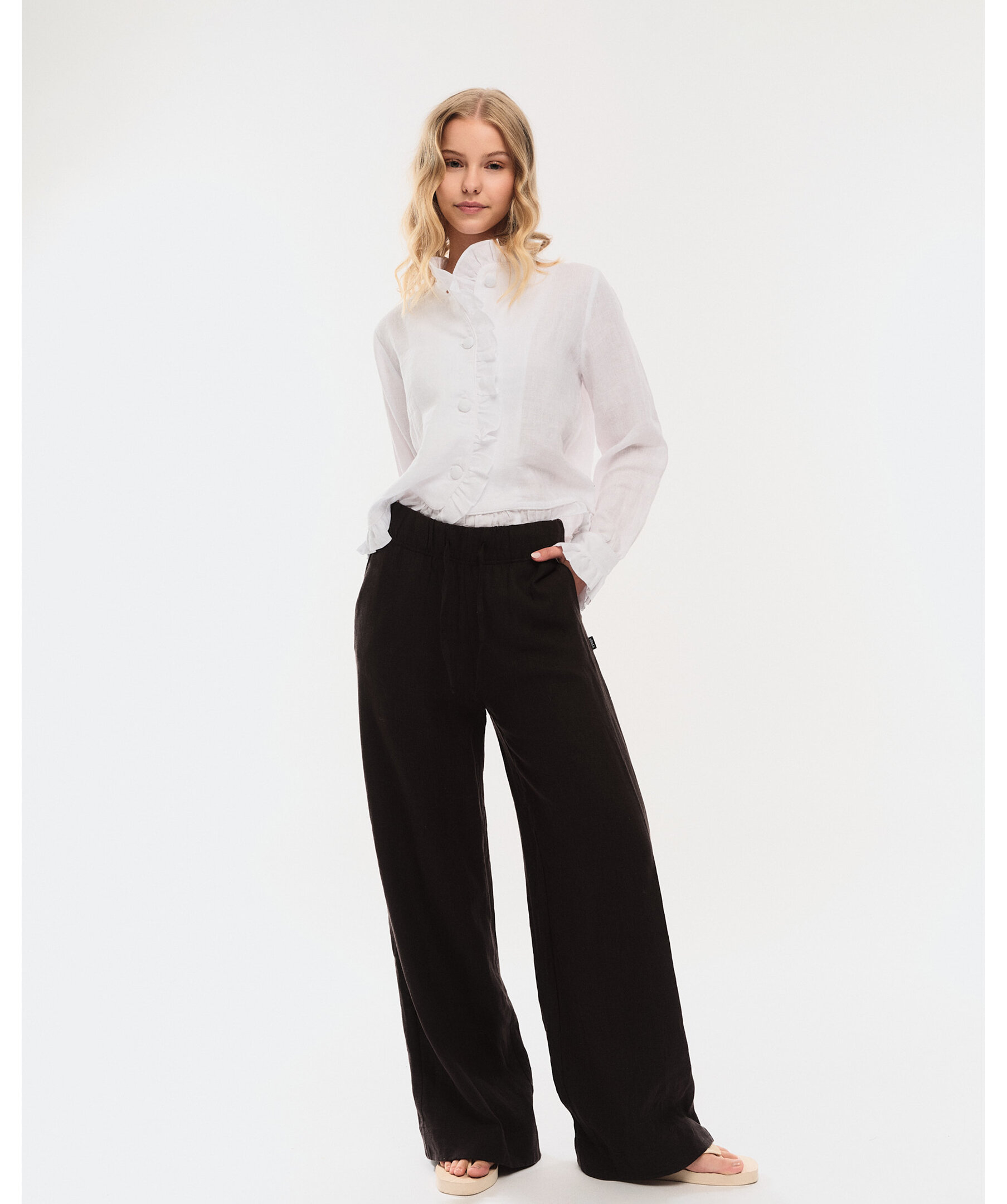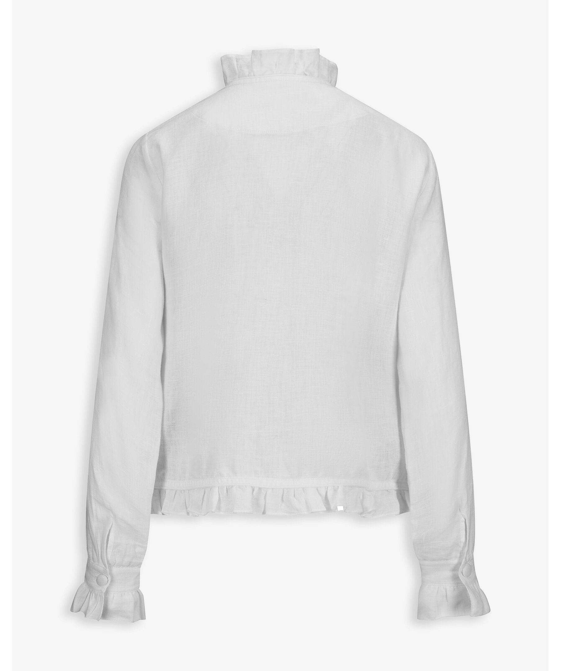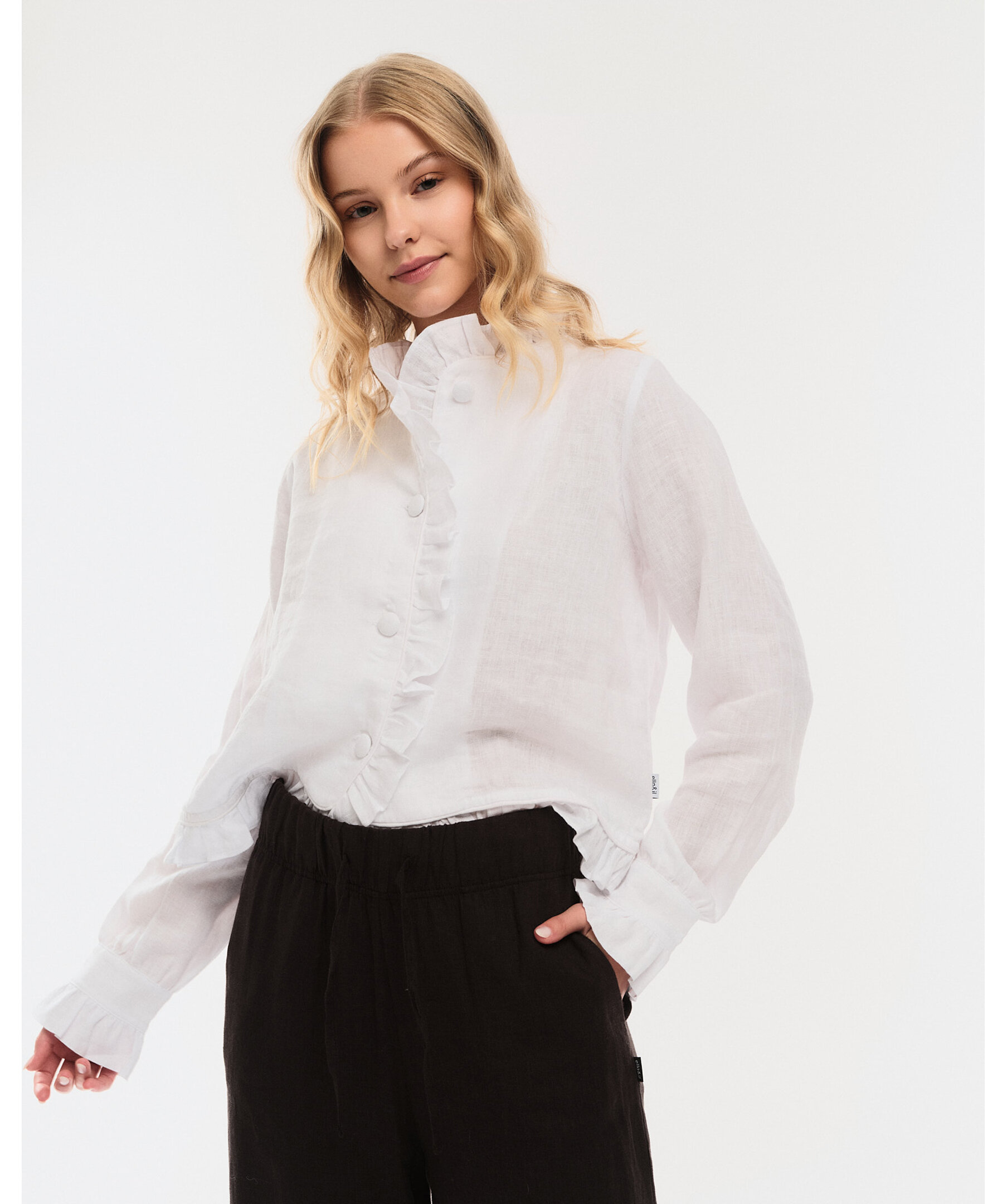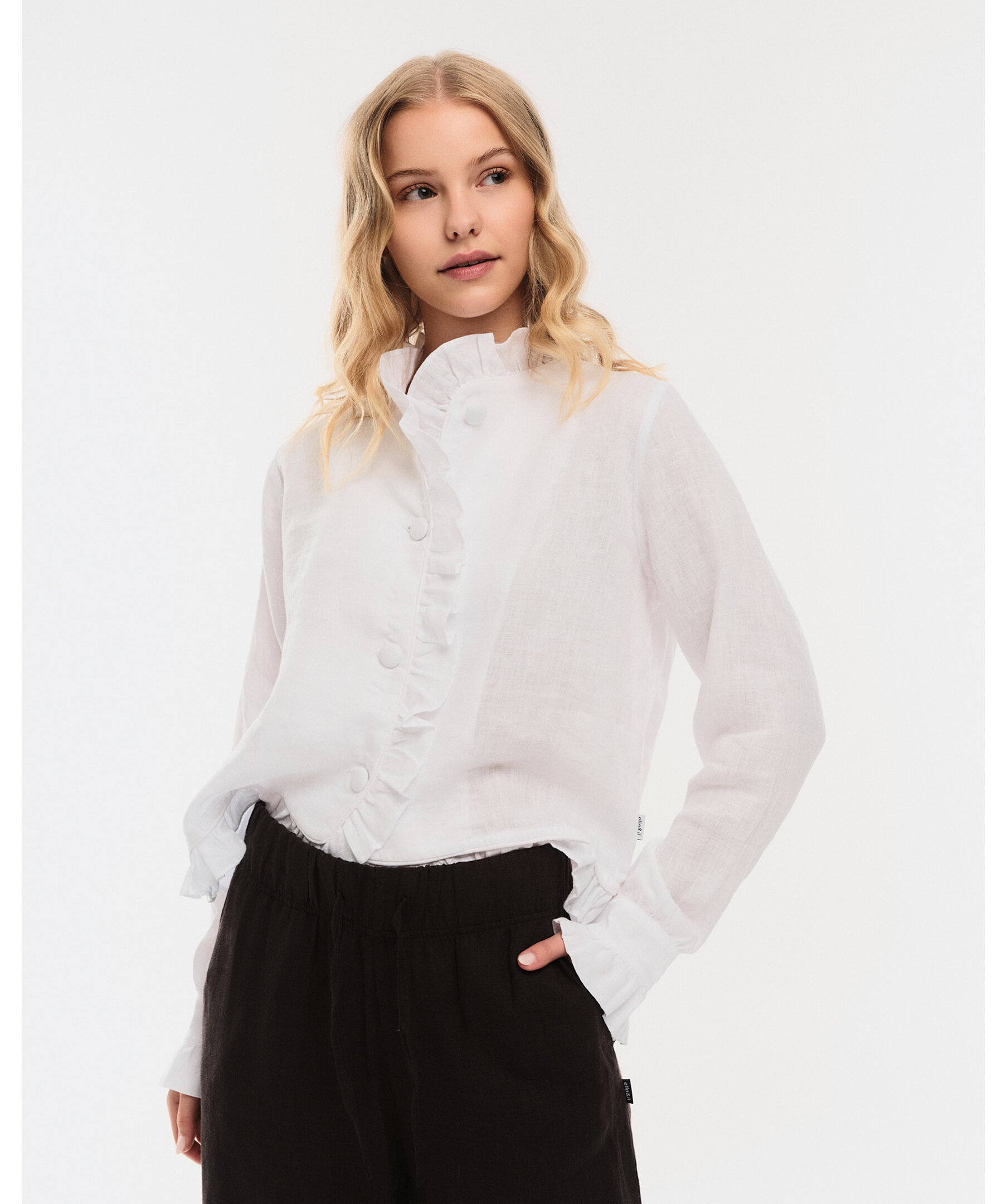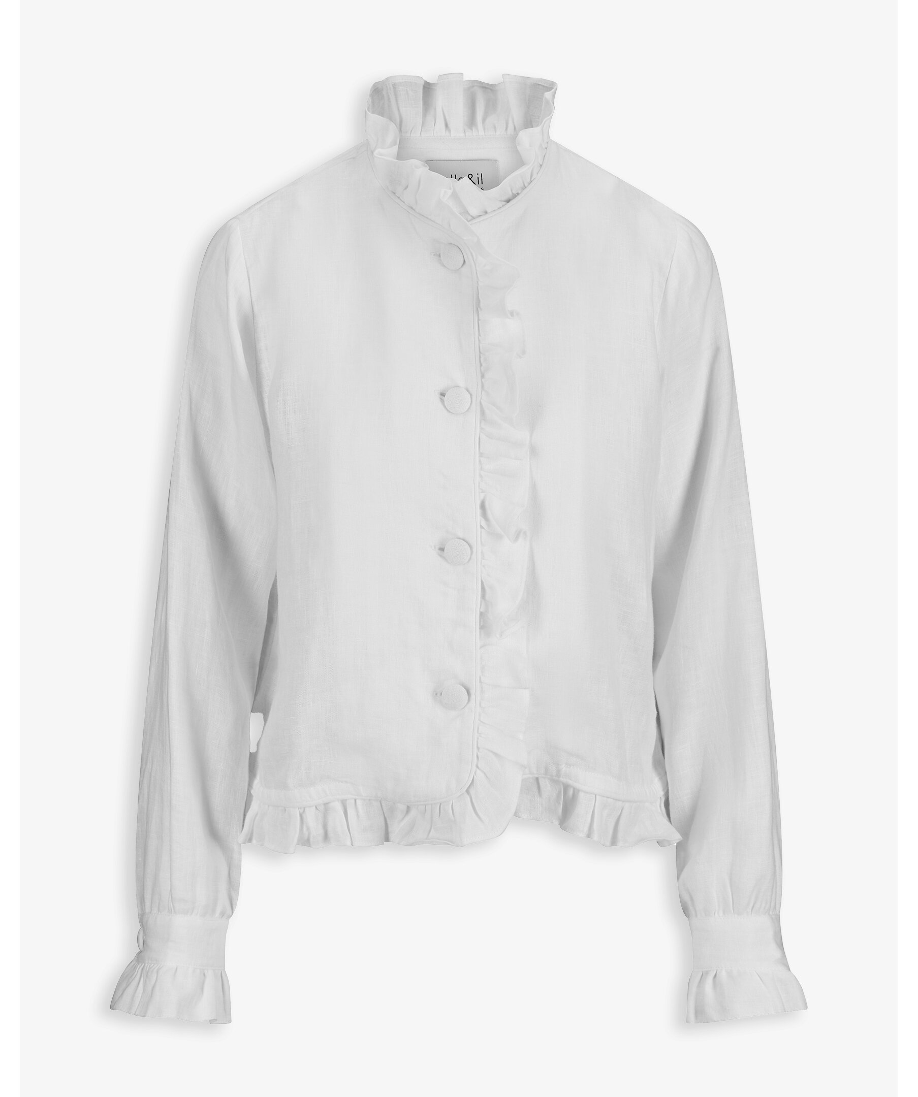 Betty Linen Jacket från ella&il är en lätt och elegant jacka i 100% linne. Den har klassisk knäppning framtill och är vackert dekorerad med fina volangkanter längs kanter och krage som ger en feminin touch. De knäppta manschetterna ger en sofistikerad finish och gör den perfekt för stilren lager-på-lager under varmare säsonger.