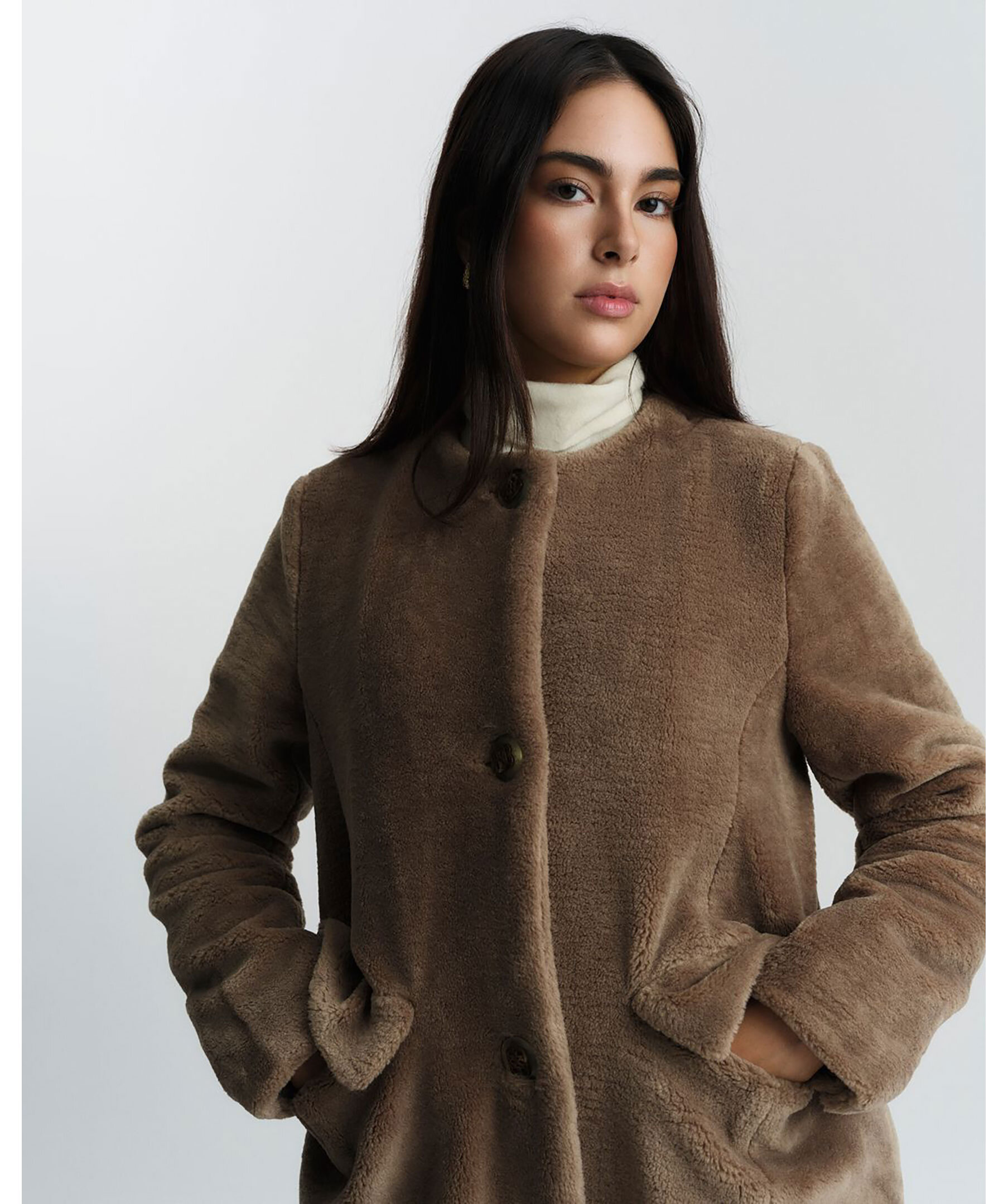 Lång och elegant kappa från ella&il tillverkad i mjuk fuskpäls. Kappan har en frontknäppning med tre knappar, praktiska fickor framtill och på sidorna kombineras med en slits bak som ger ökad rörelsefrihet.