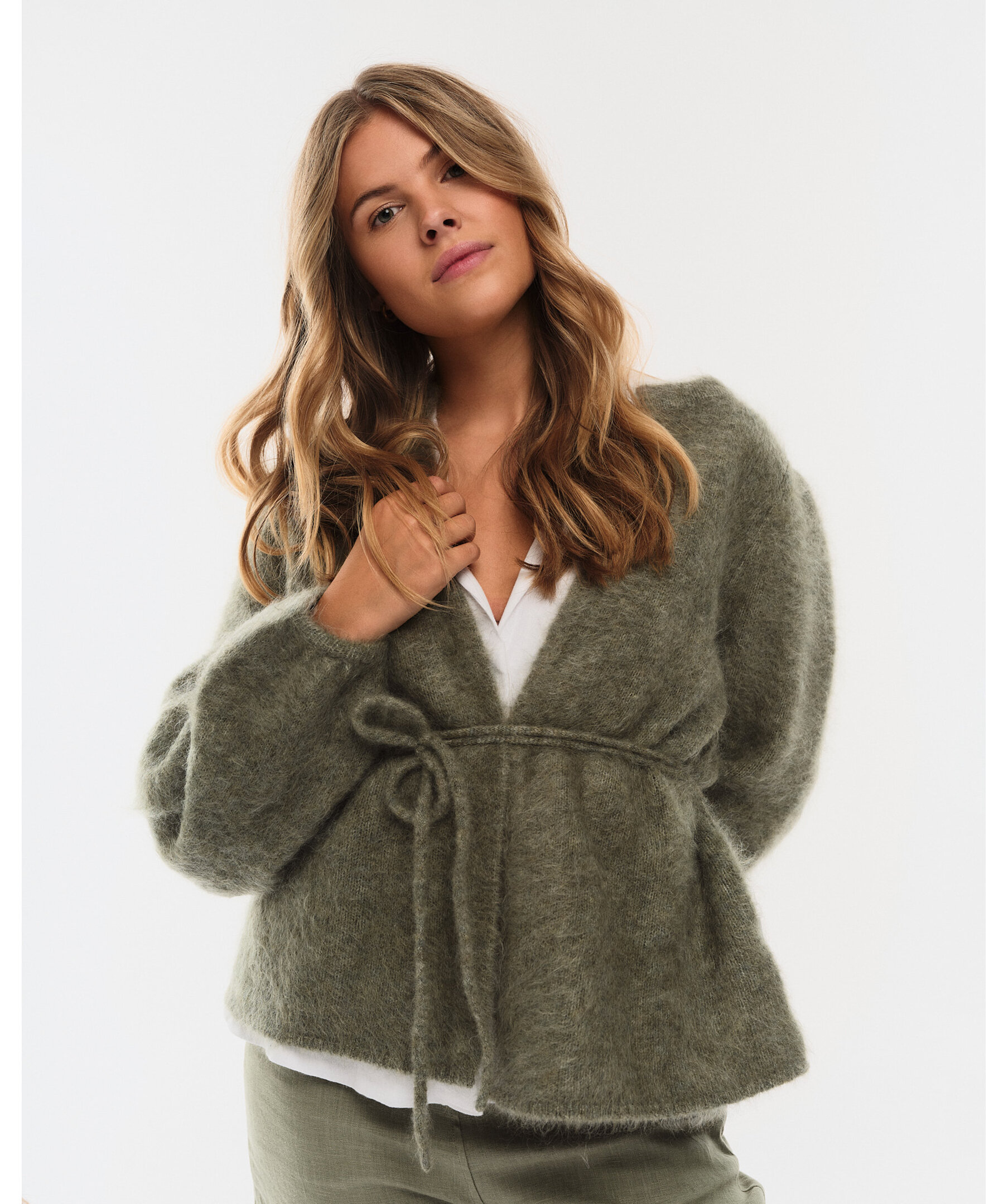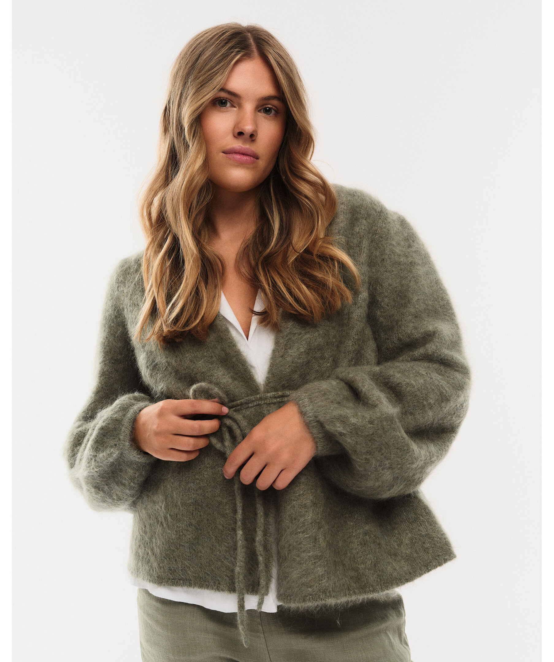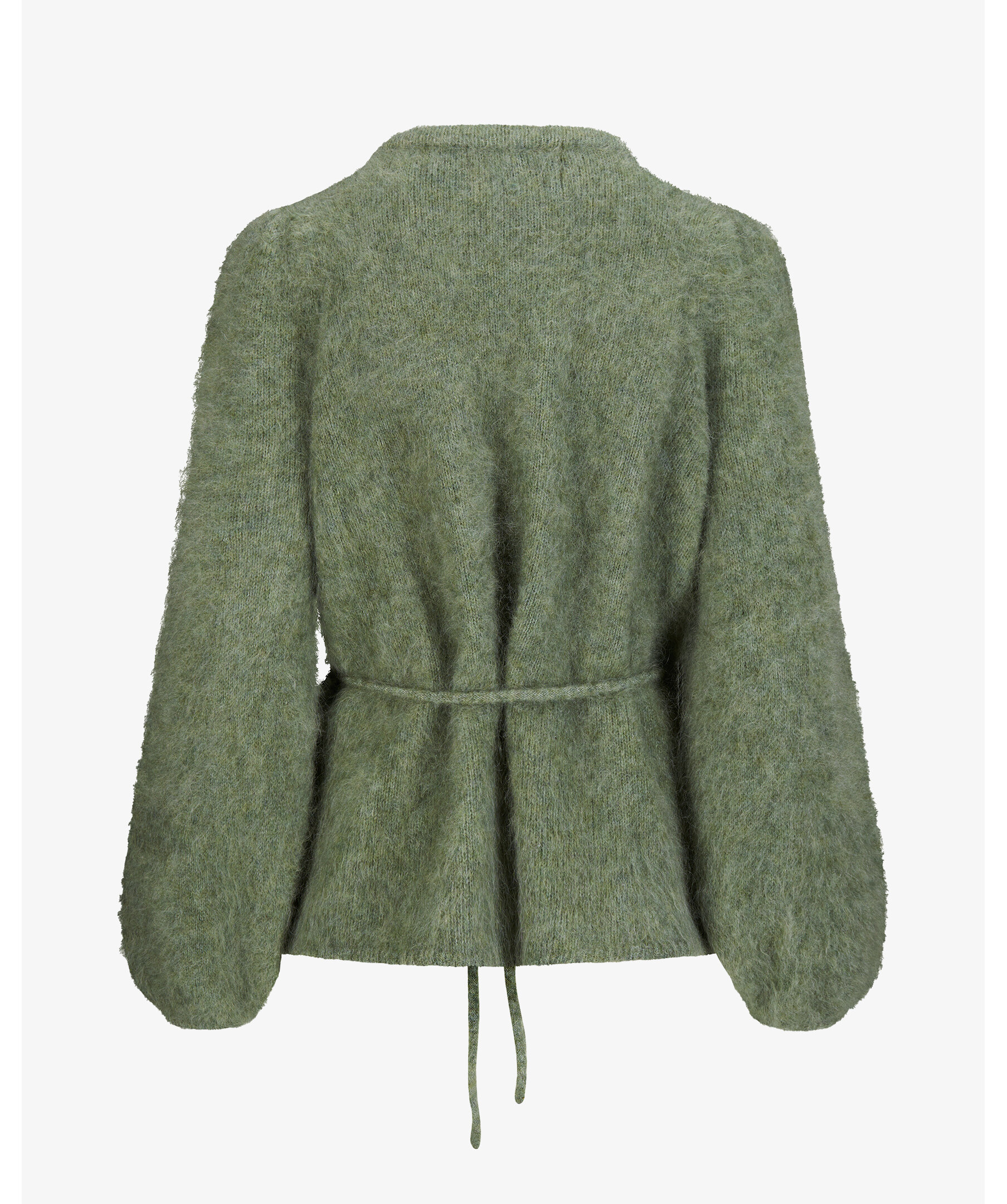 Grön, stickad omlottkofta från ella&il. Koftan har ett justerbart knytbälte i midjan och ribbstickad kanter. Tillverkad i en mohairblandning.