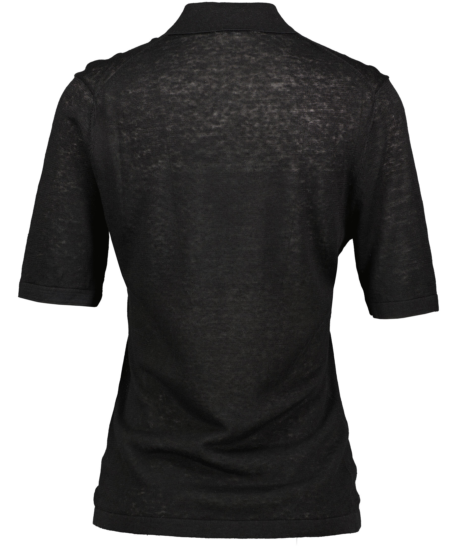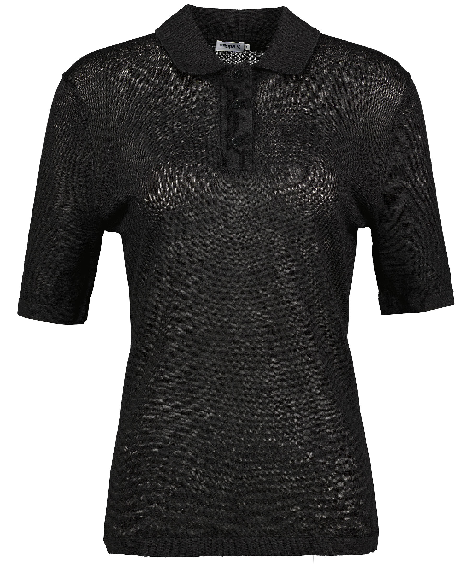 Tunn, svart pikétröja i linne från Filippa K. Tillverkad i 100% linne. Klassisk krage, mörka knappar, korta ärmar.