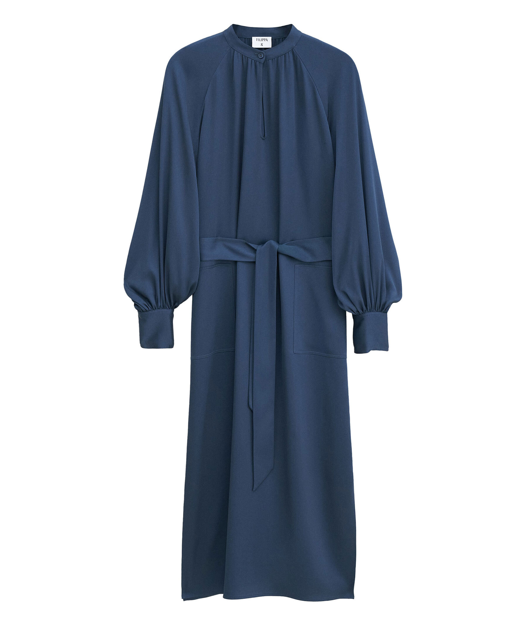 Duvblå långärmad klänning från Filippa K. Klänningen har ett midjebälte och är gjord i en avslappnad passform. Midi-längd, tillverkad i ett glänsande draperad Naia™-acetatblandning. Designad med raglanärmar, midjebälte och sidfickor. Ofodrad.