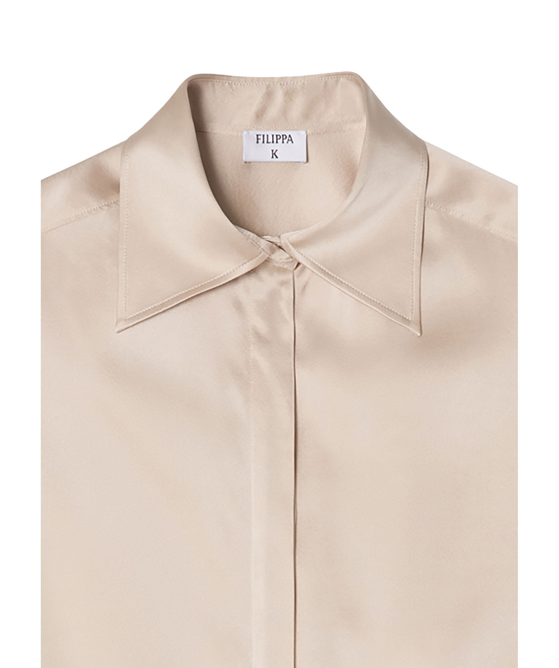 Beige silkblus från Filippa K. Blusen stängs med dolda knappar och har korta, droppade axlar. Tillverkad i en silkblandning.
