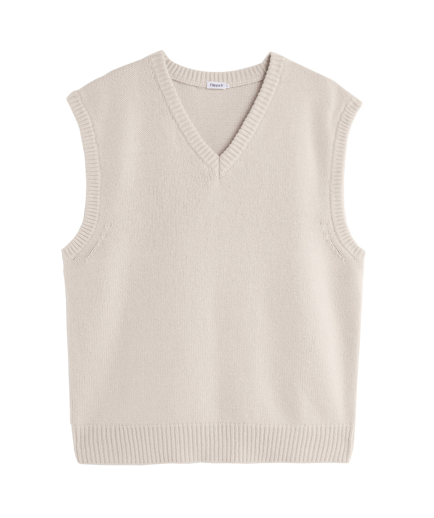 Ljusbeige stickad väst i en avslappnad passform från Filippa K. Västen är gjord i en blandning av ull och kashmir. V-ringad hals, breda axlar och ribbstickade muddar. Vill man ha en tajtare passform rekommenderar vi att gå ner en storlek.
