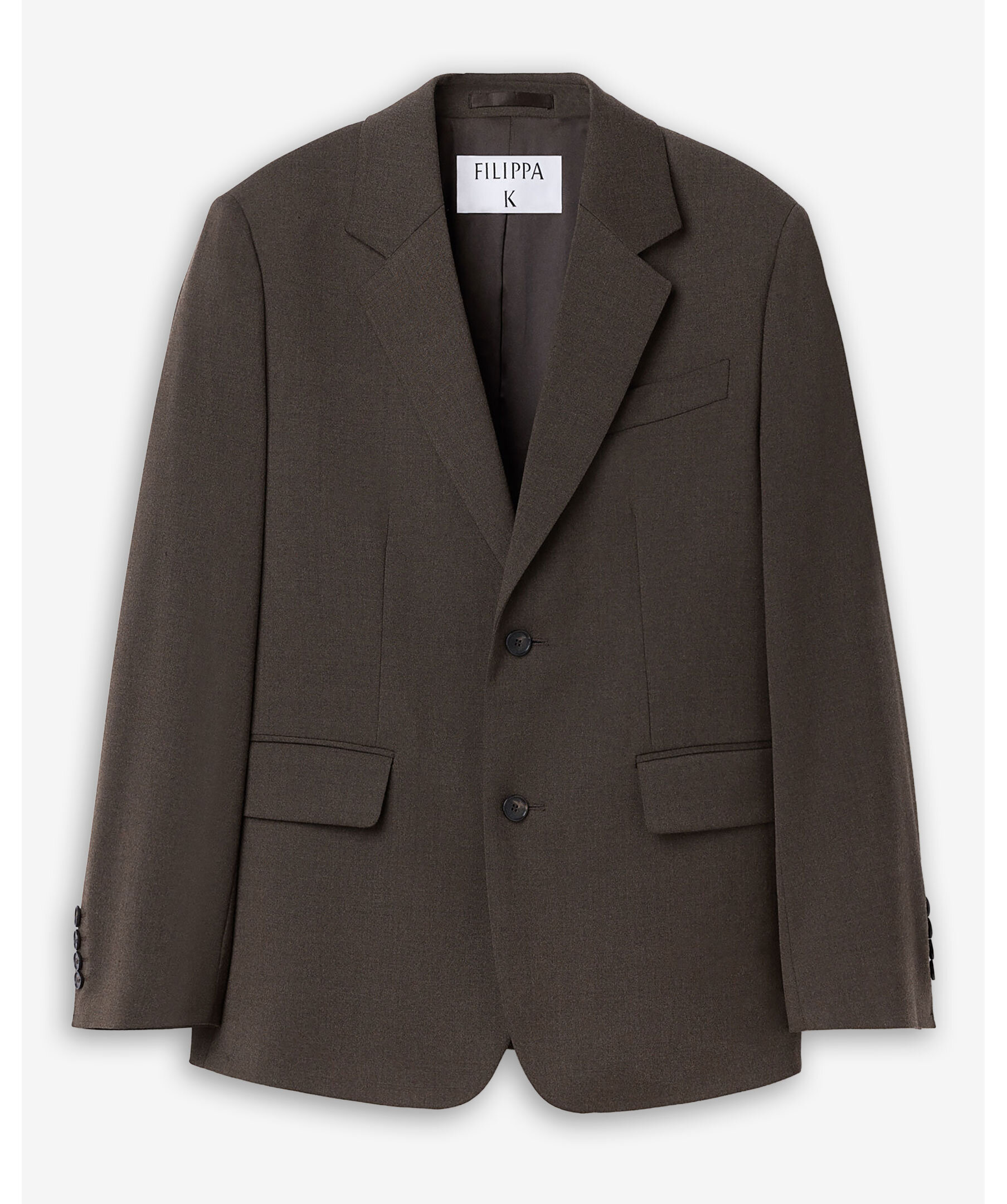Delilah Blazer från Filippa K är en skräddad kavaj i färgen Walnut Brown. Kavajen har en single-breasted design med två knappar framtill, jetted flap-fickor och knäppmanschetter med fyra knappar. Den är fullt fodrad, har center back vent och tillverkad i merinoull och återvunnen polyester med lätt stretch.