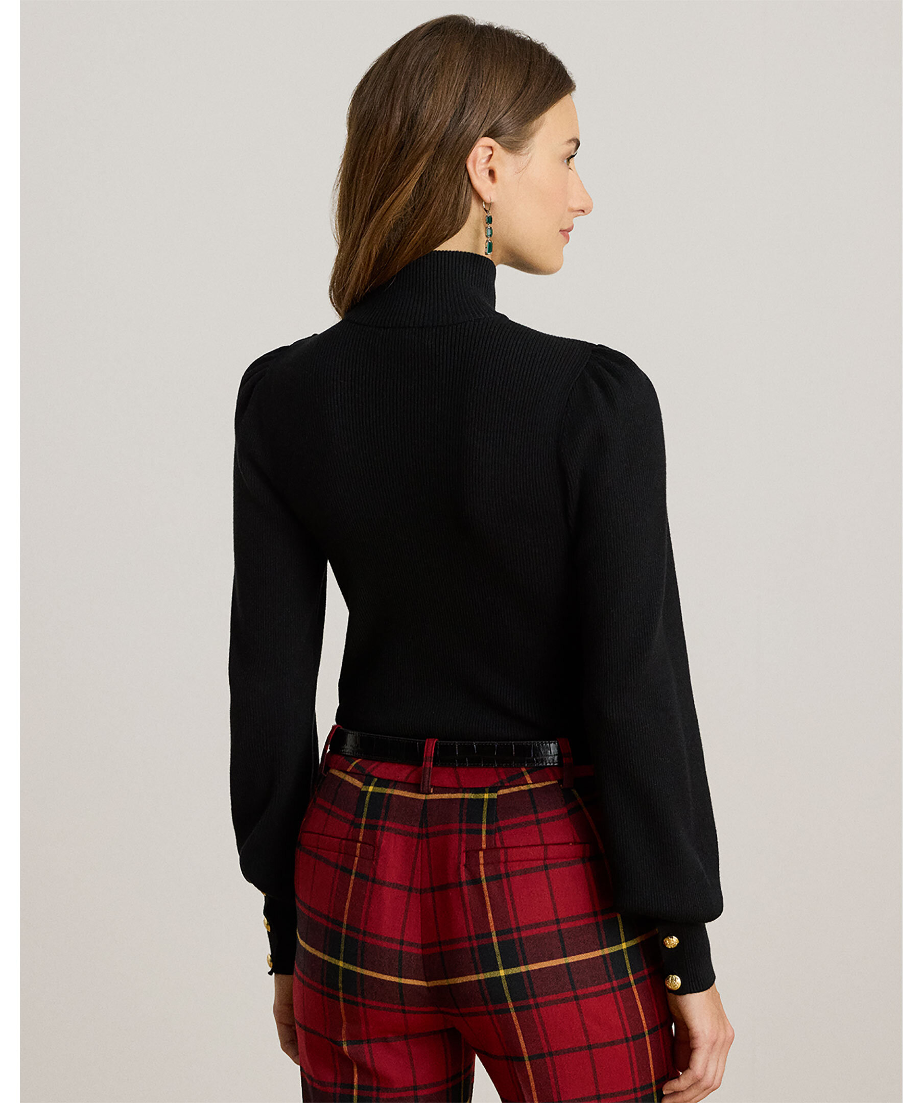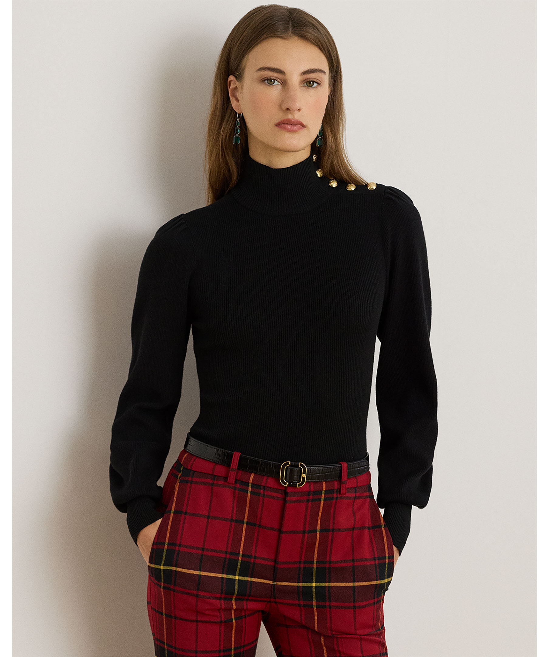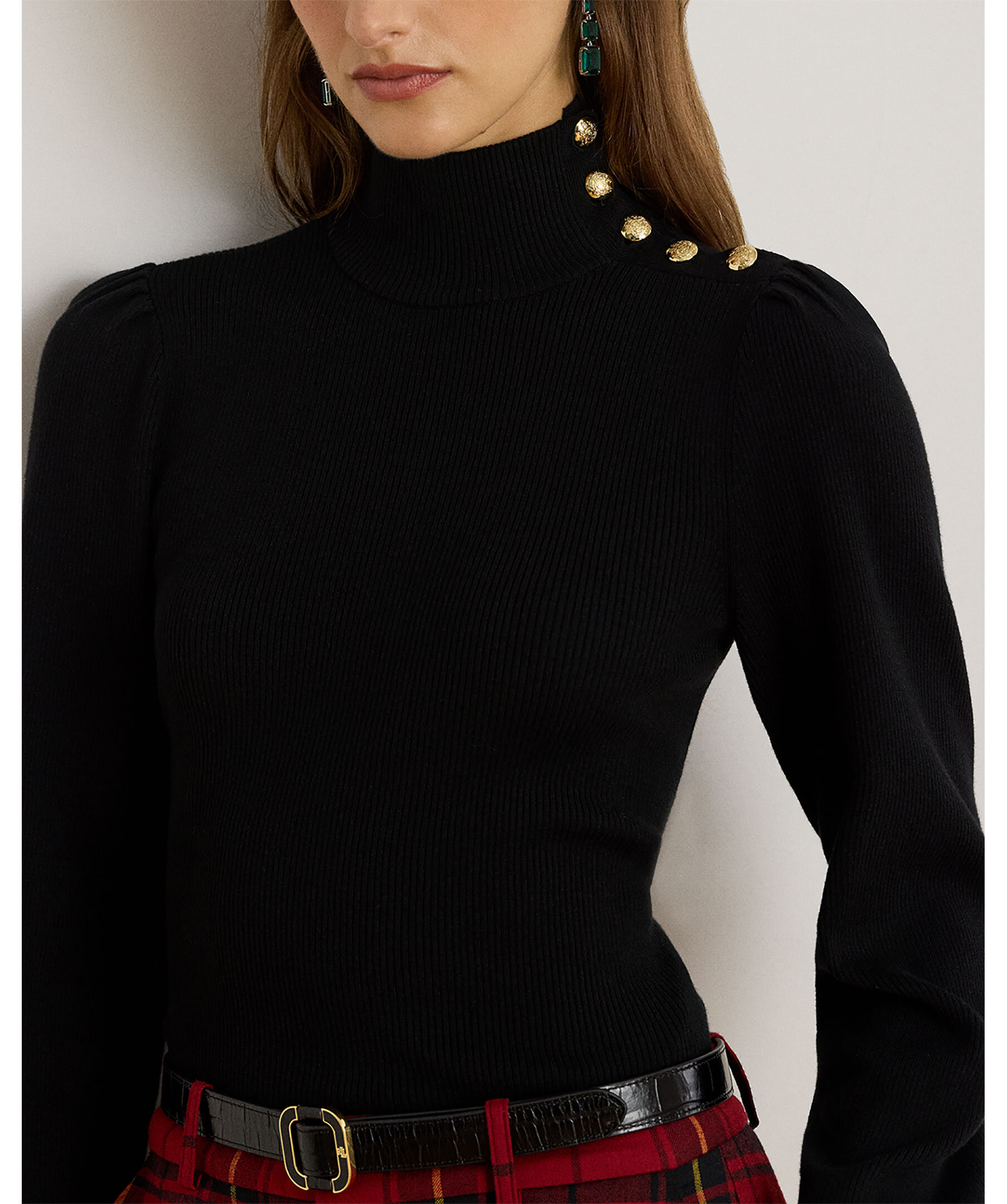 Svart polotröja från Lauren Ralph Lauren. Tröjan har ballongärmar med knappar på ena axeln. Den är stickad i en mjuk bomullsblandning och har en slim fit som slutar vid höften. Perfekt för både vardag och mer dressade tillfällen, och den stiliga knapplisten vid halsen ger extra finess.