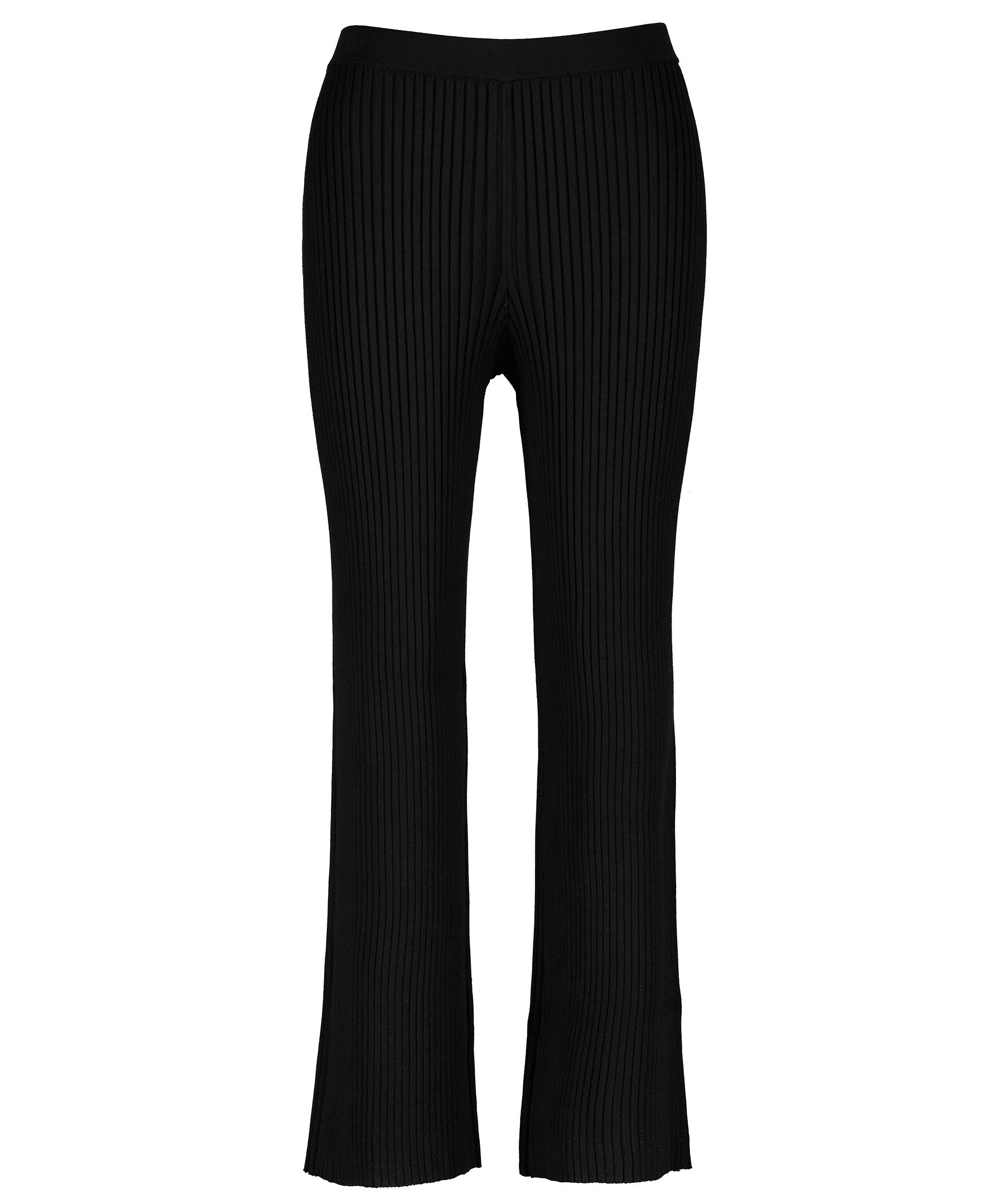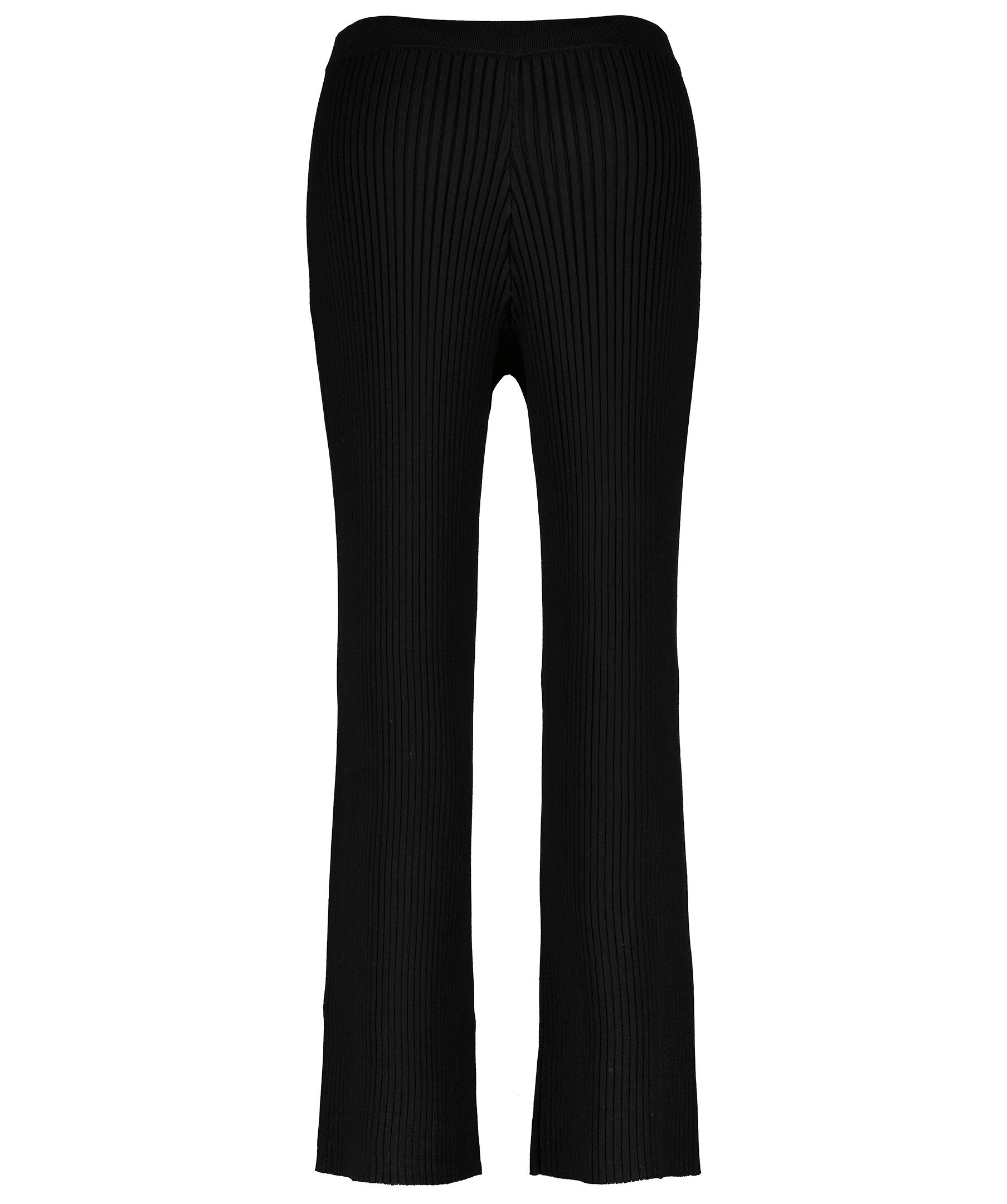Svarta, vida byxor i ribbstickad, hållbart framtagen viskos från Filippa k. Resårmidja och hellång modell med enkelt avslut i nedre fåll.