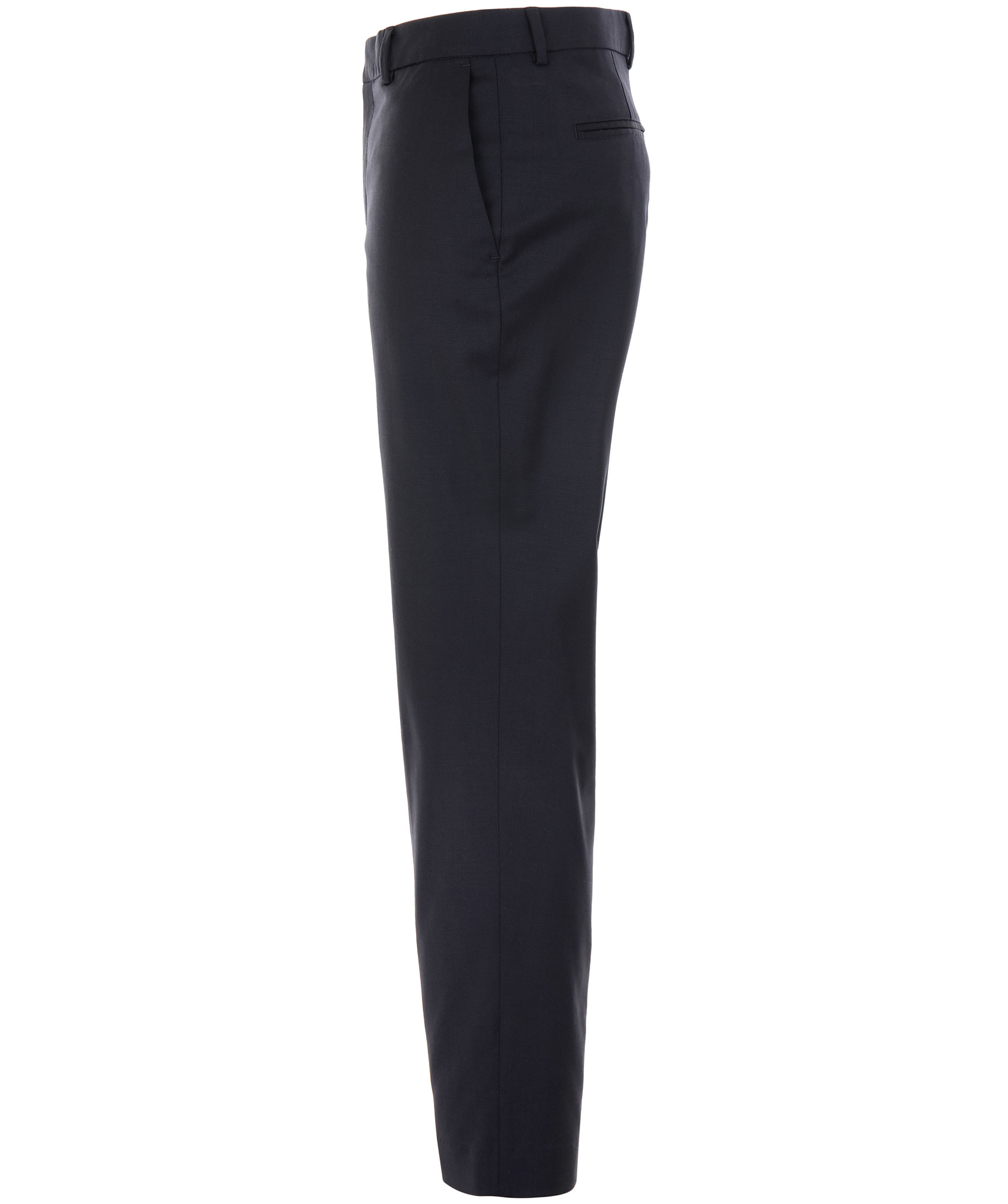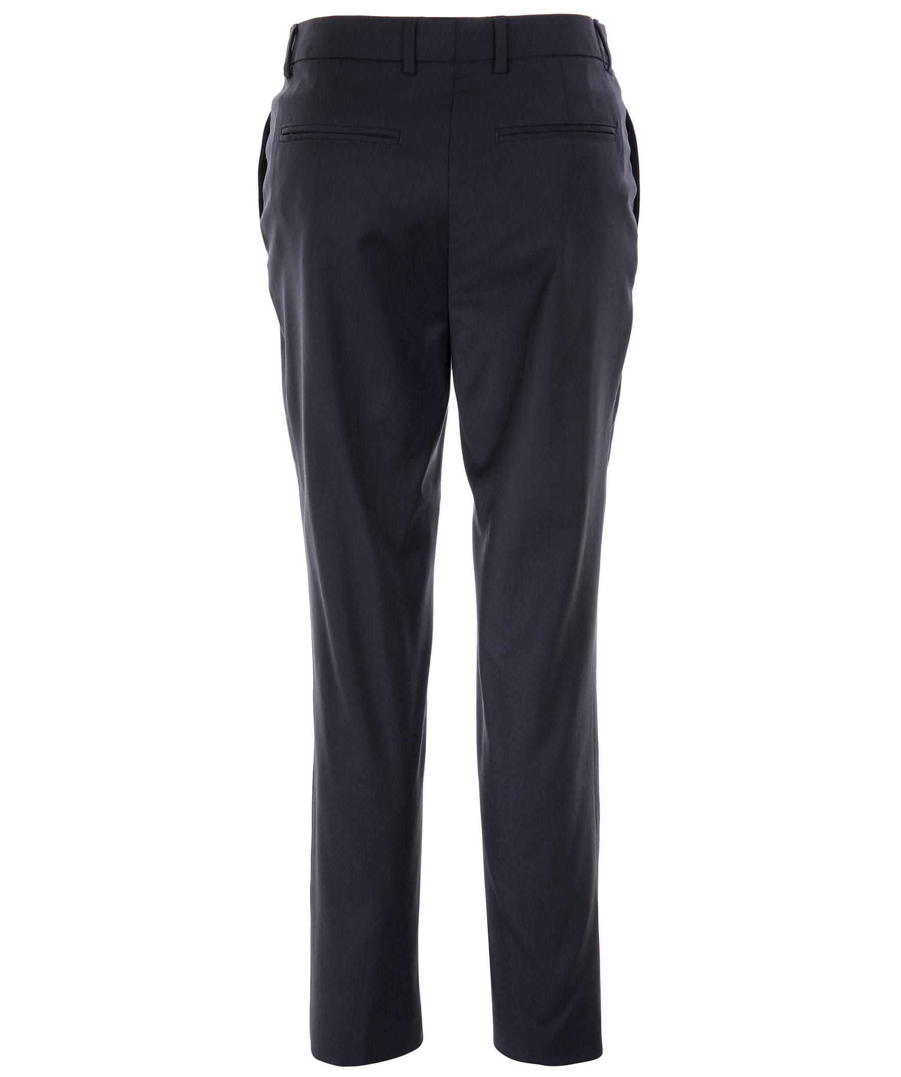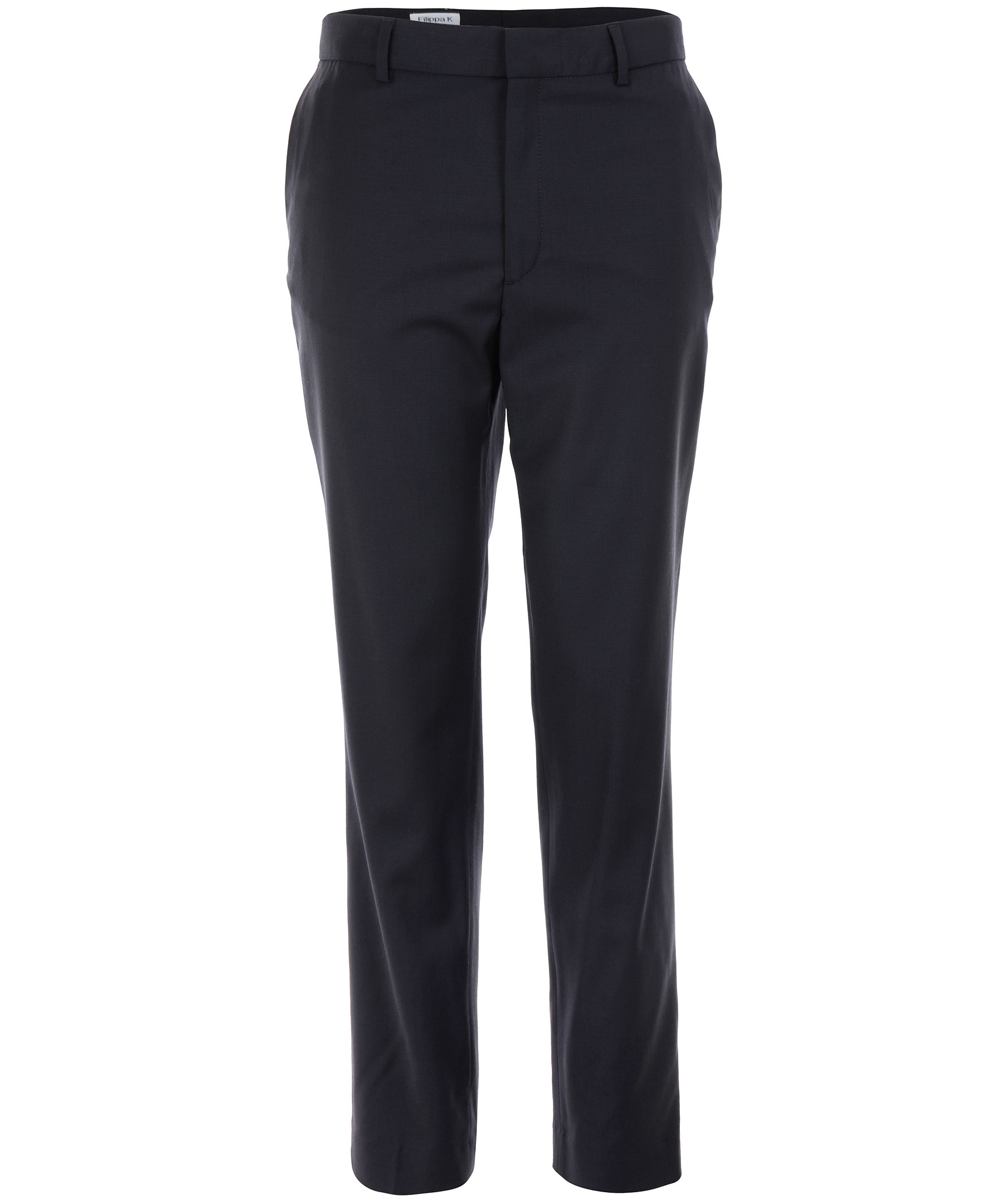 Marinblåa, skräddarsydda kostymbyxor från Filippa K. Tillverkade i yllestretch, har normal passform och något avsmalnande ben i ankellängd. Pressveck fram och bak. Gylf med dragkedja med krok och hyska, och normal midja. Tillverkade i ull och elastan och tyget är vävt i Portugal.