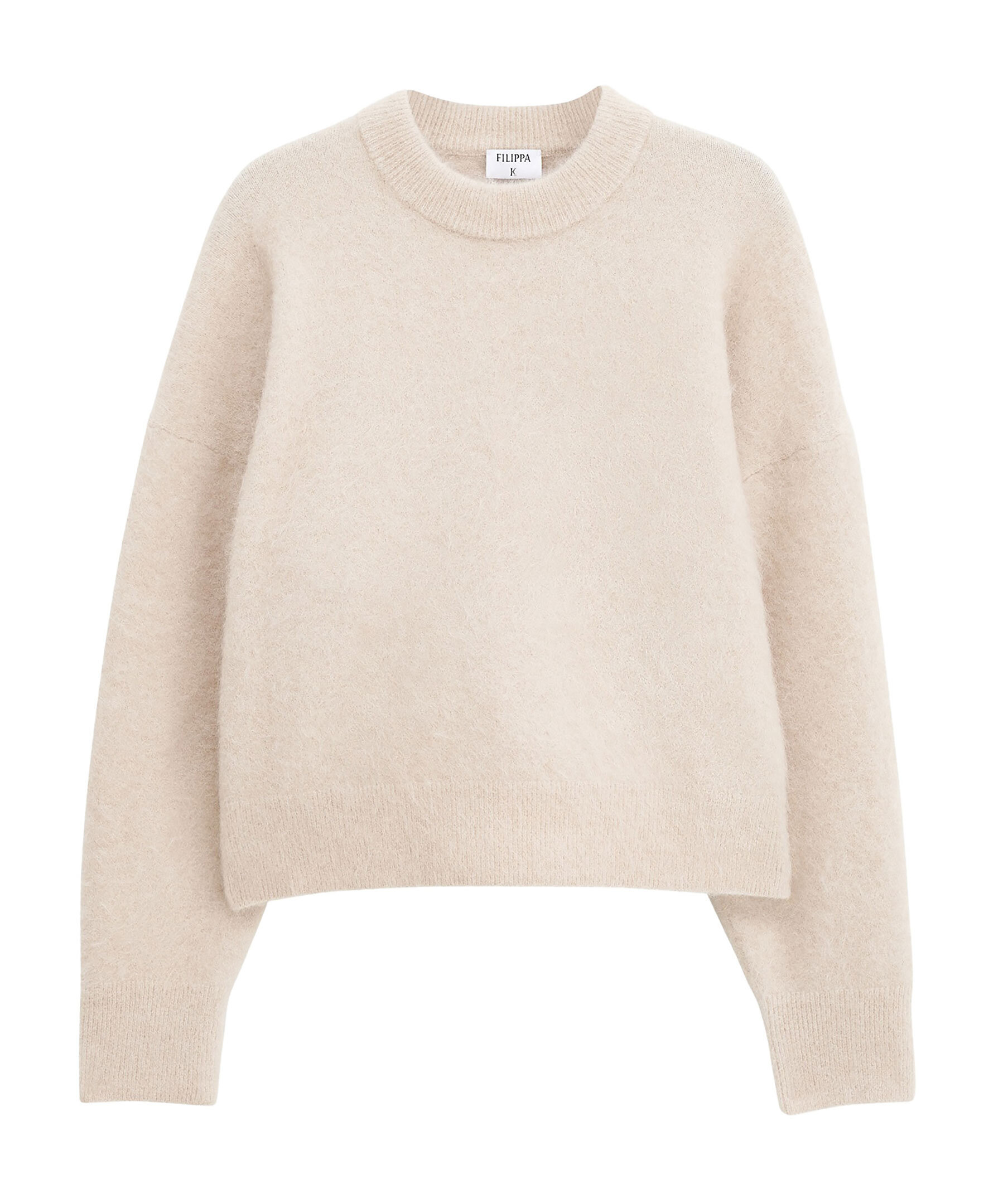 Ljusbeige, fluffig pullover från Filippa K stickad av en mjuk tung alpackaullblandning. Tröjan har en ribbstickad halsringning samt ribbstickade muddar.