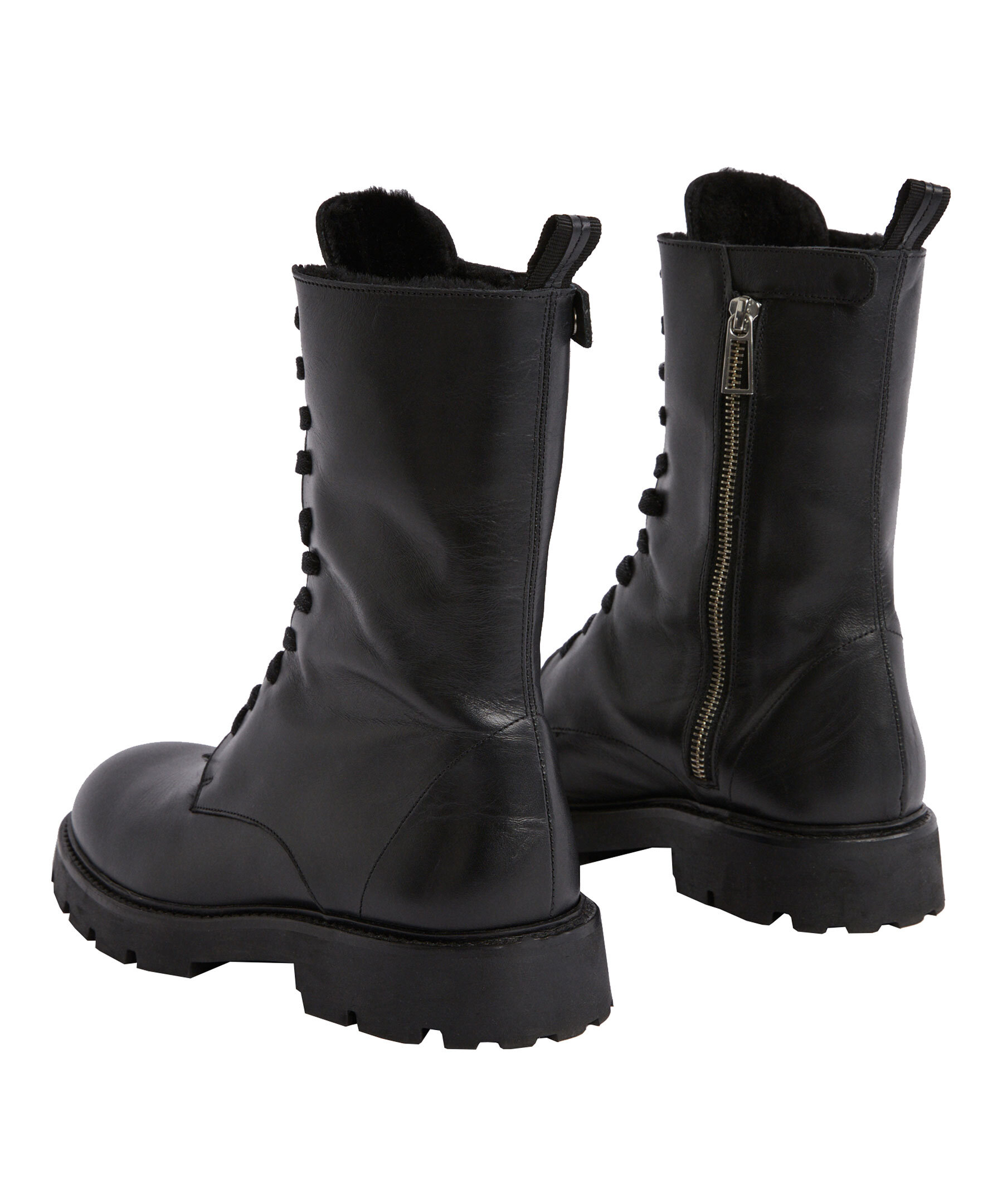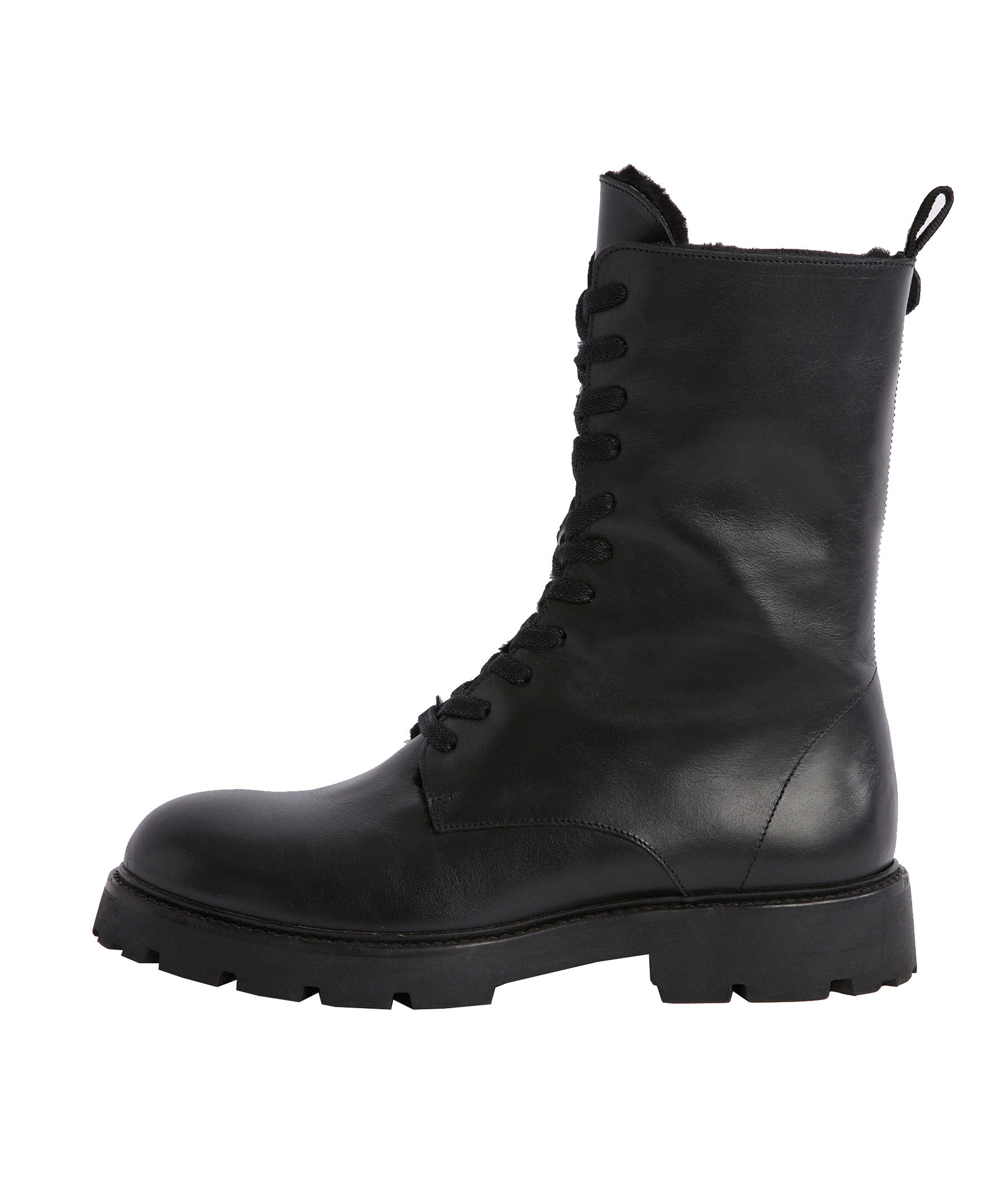 Svarta läderkängor från Filippa K. Elvahålssnörning. Kan stängas med dragkedja och tryckknappar på skons insida. Fodrade med mjuk shearlingpäls för extra värme. Dustbag medföljer.