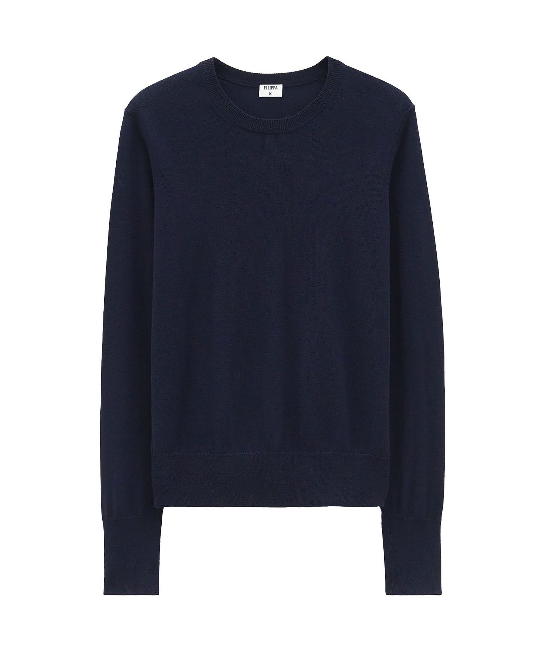Mörkblå stickad tröja från Filippa K. Rundad halsringning och ribbstickade muddar vid ärm och plaggslut. Tillverkad i 100% Ull.