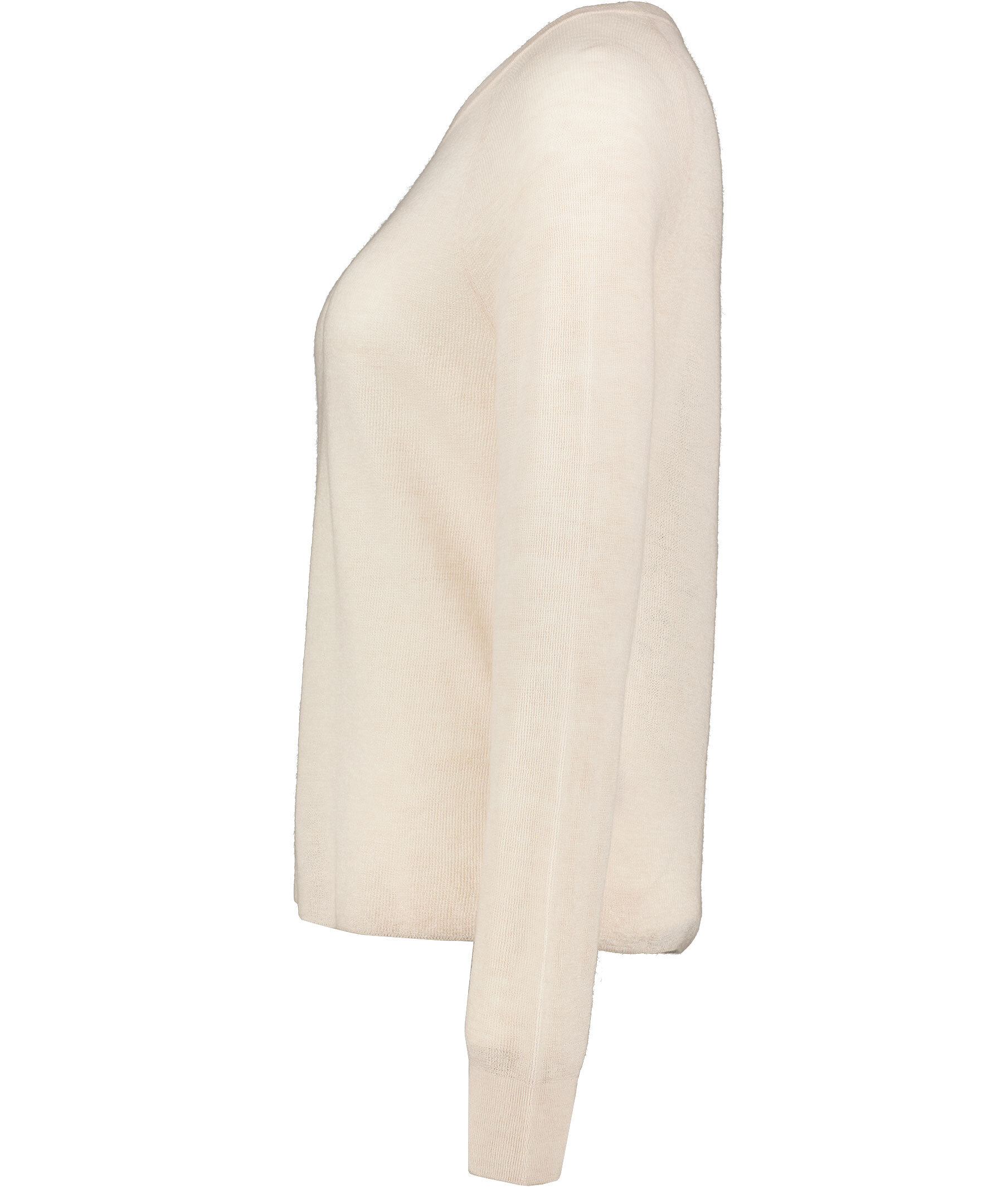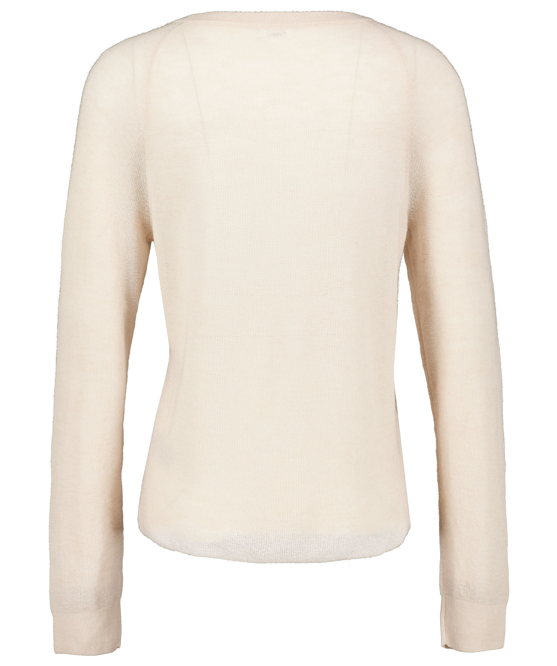 Beige tunt stickad tröja från Filippa K. Rundad hals, ribbstickade muddar, halvgenomskinlig.