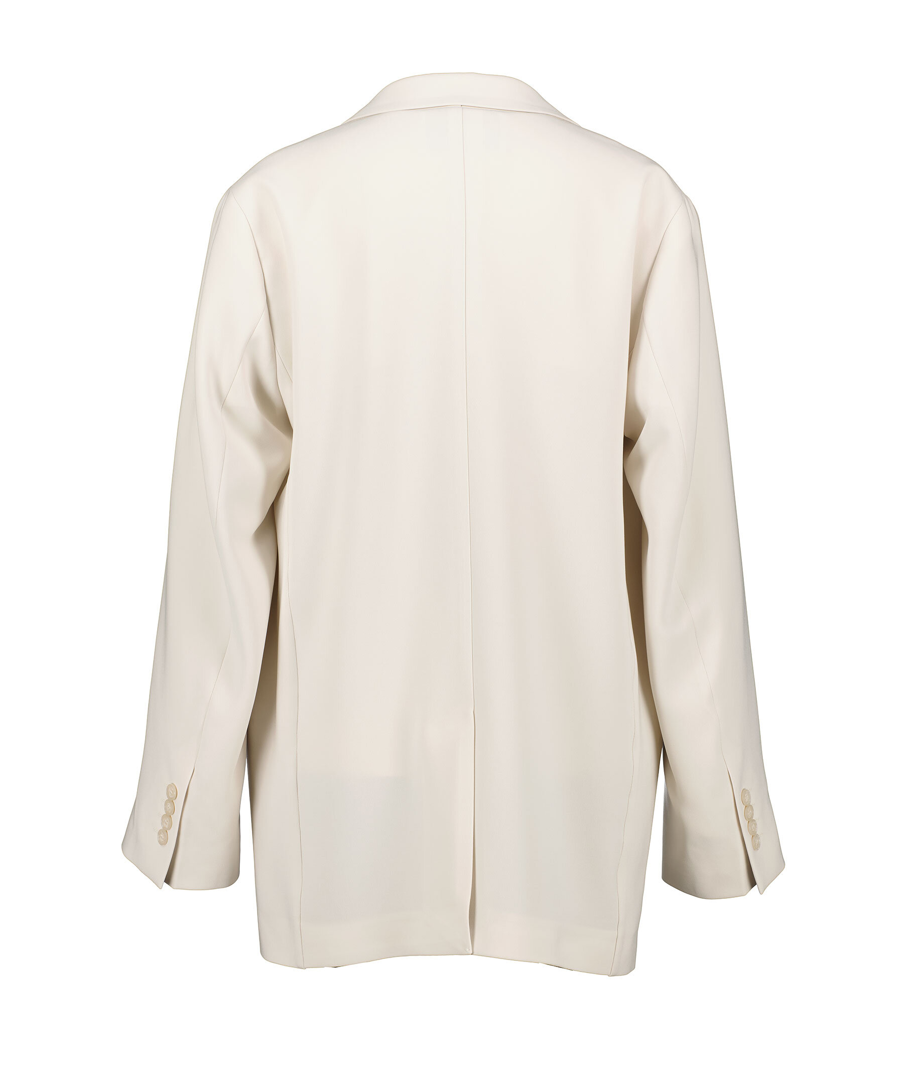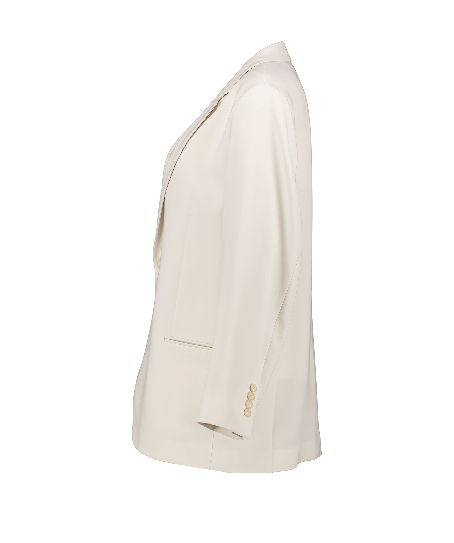 Cremefärgad kavaj från Filippa K. Enkelknäppning fram, går strax nedanför stussen, två passpoal fickor och en innerficka. Kavajen har en ledig passform och är sydd i en medeltjock matt triacetatblandning.