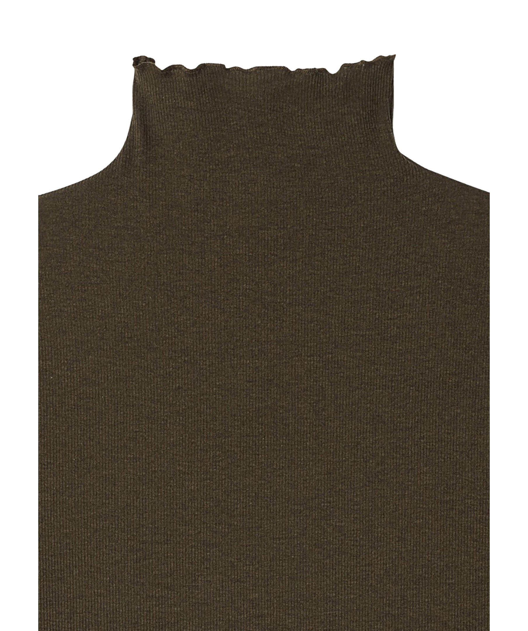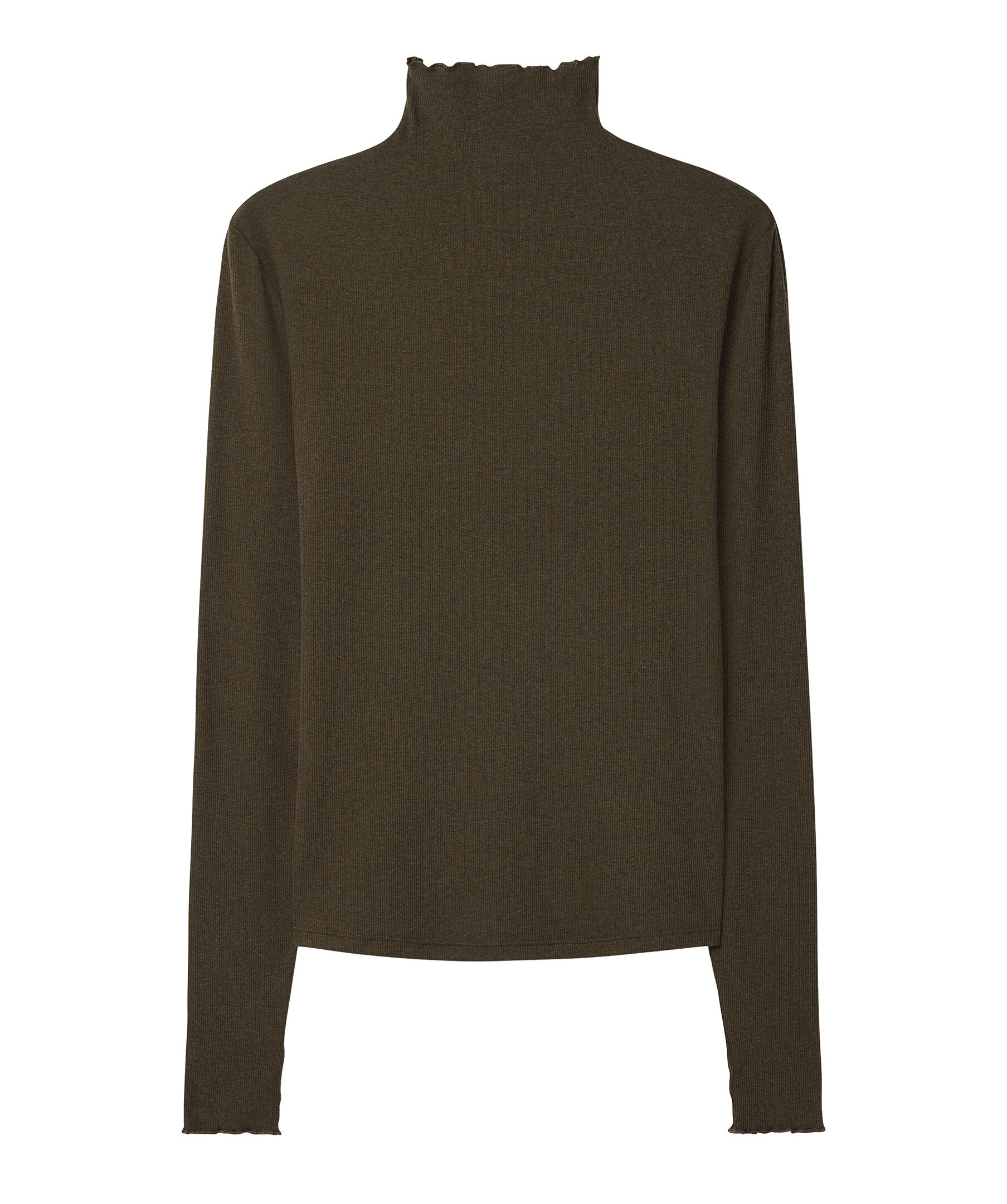 Mörkgrön, ribbstickad polotröja från Filippa K. Tröjan är designad med en halv polokrage, långa ärmar med tumhålsdetalj och veckade kanter. Tillverkad i TENCEL™ och ekologisk bomullsstretch.