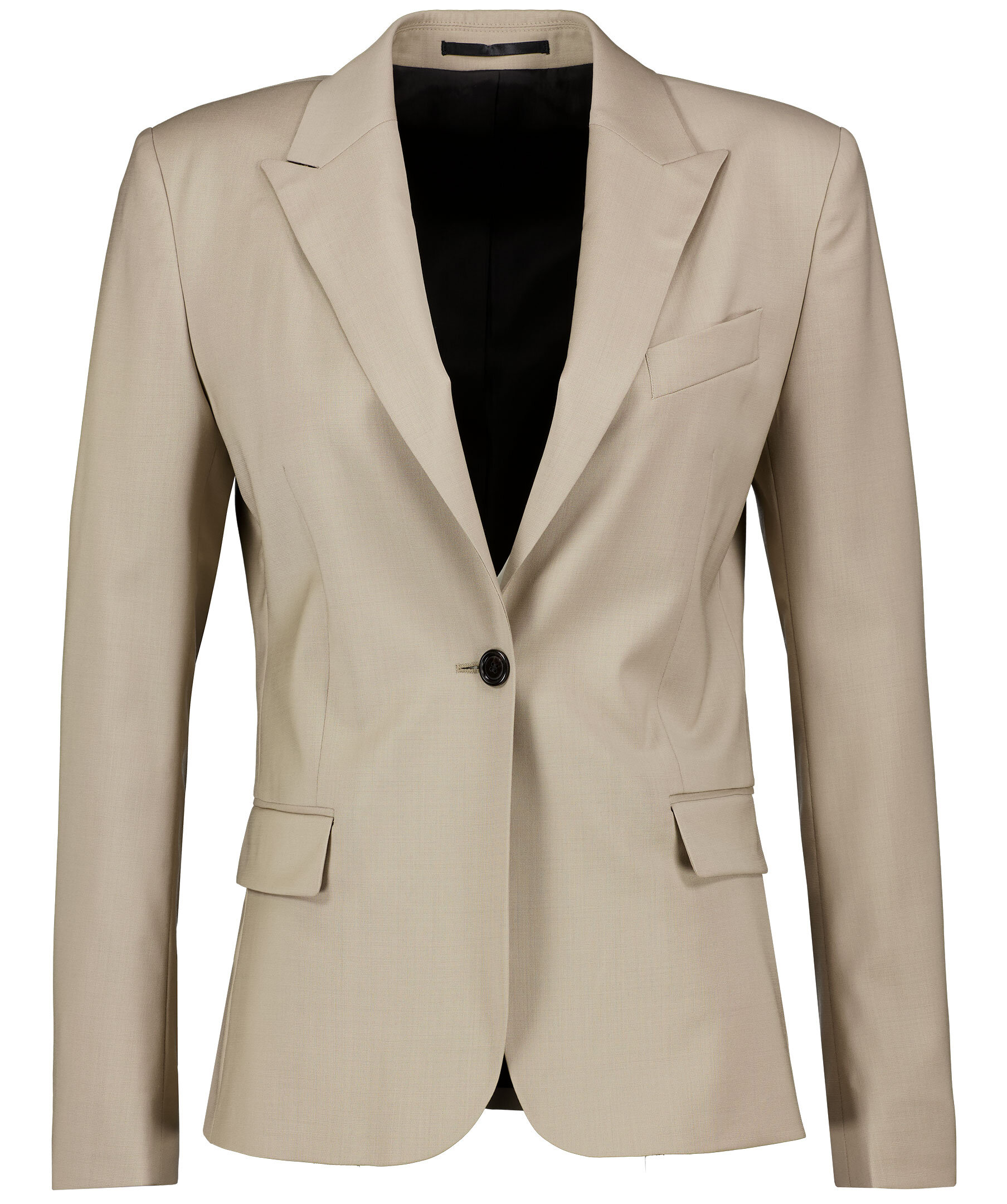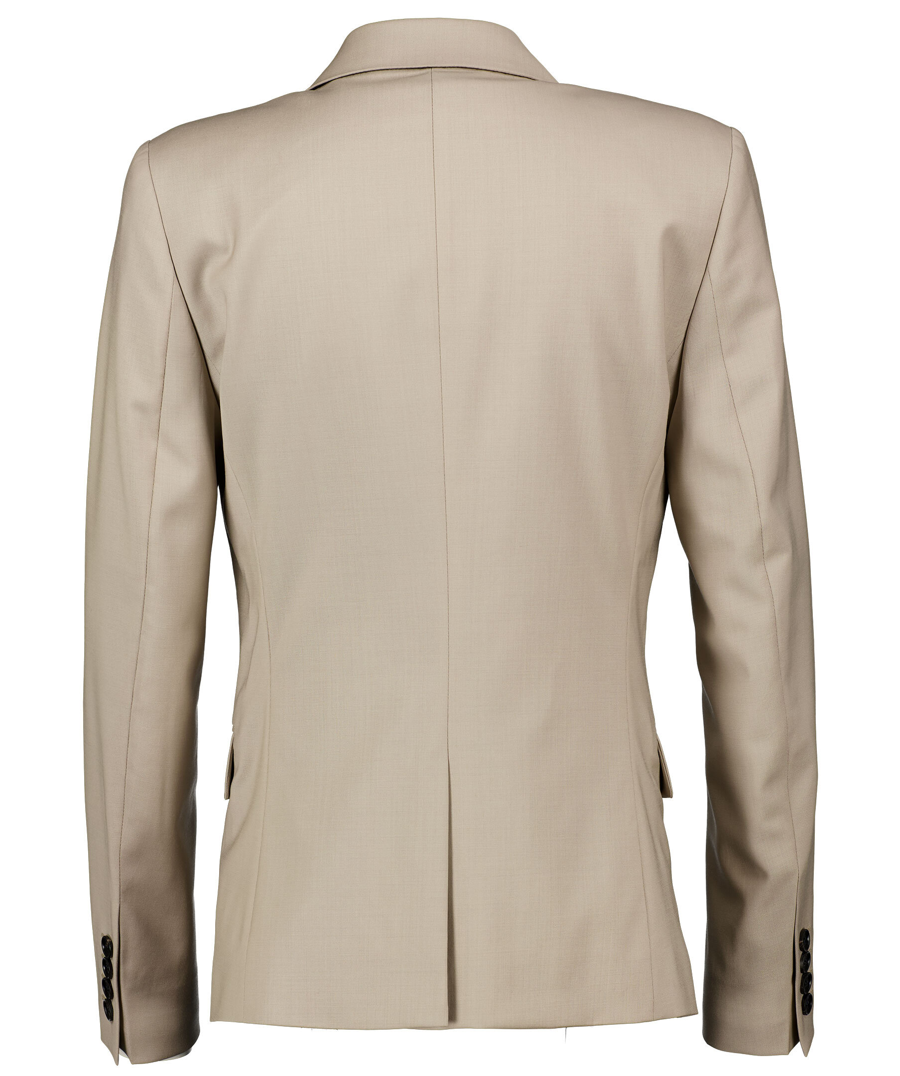 Beige kavaj i stretchig ull med alla klassiska detaljer från Filippa K. Enkelknäppt med en knapp, spetsigt slag, passpoalfickor med lock samt en bröstficka. Slitsen vid manschetterna har knappstängning, och kavajen har ett sprund baktill.