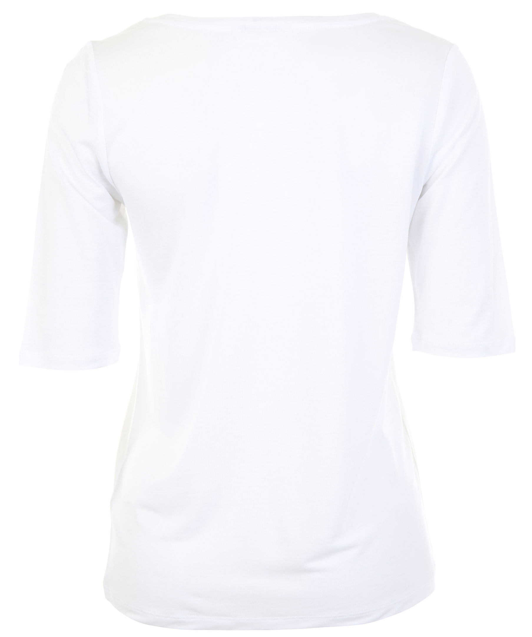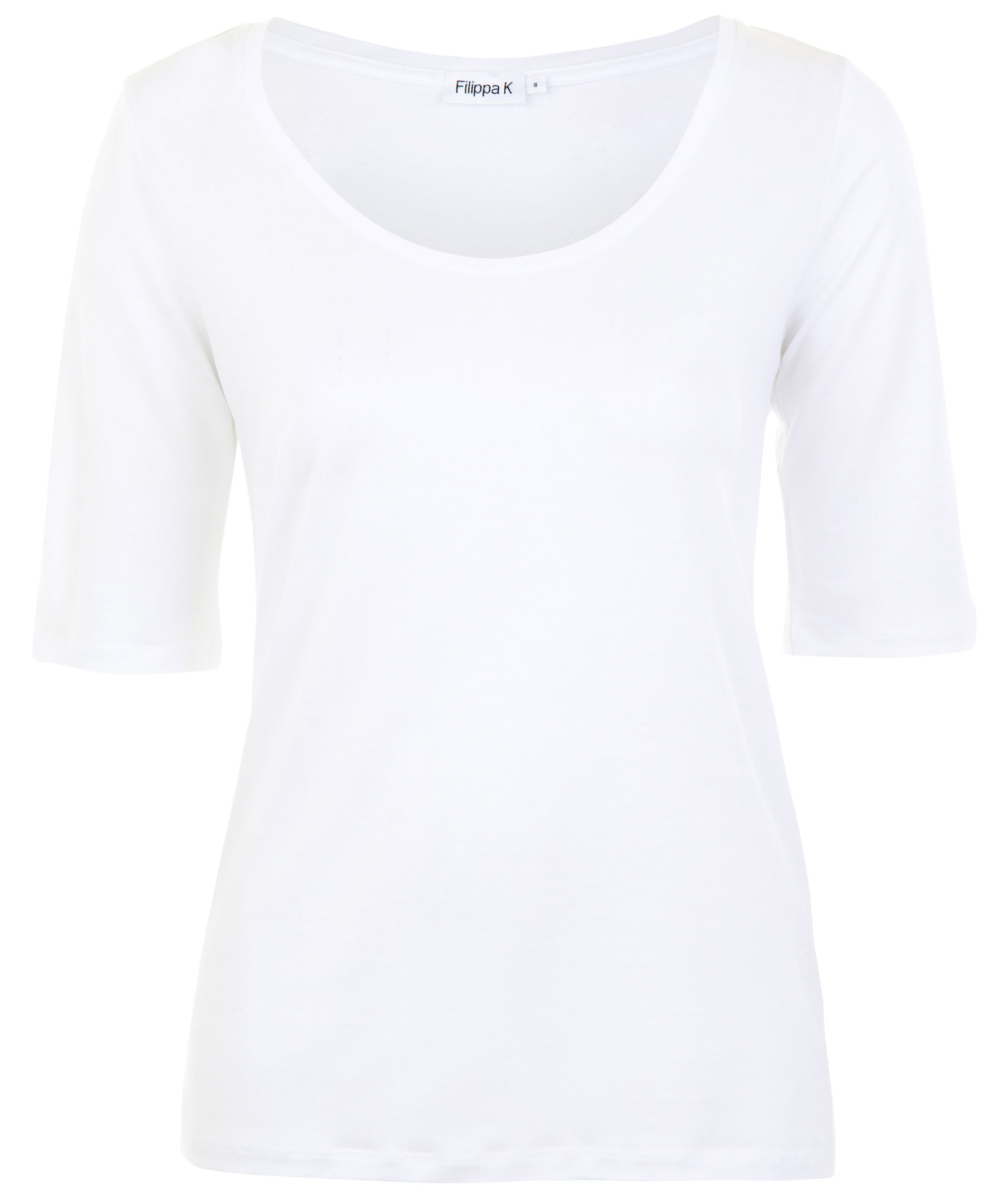 Vit topp av mjuk lyocell med djup halsringning från Filippa K. Armbågslång ärm och rak passform. Det här tidlösa plagget kan användas som ett extra lager eller stoppas ner i en kjol med hög midja. Materialet är vävt i Portugal.