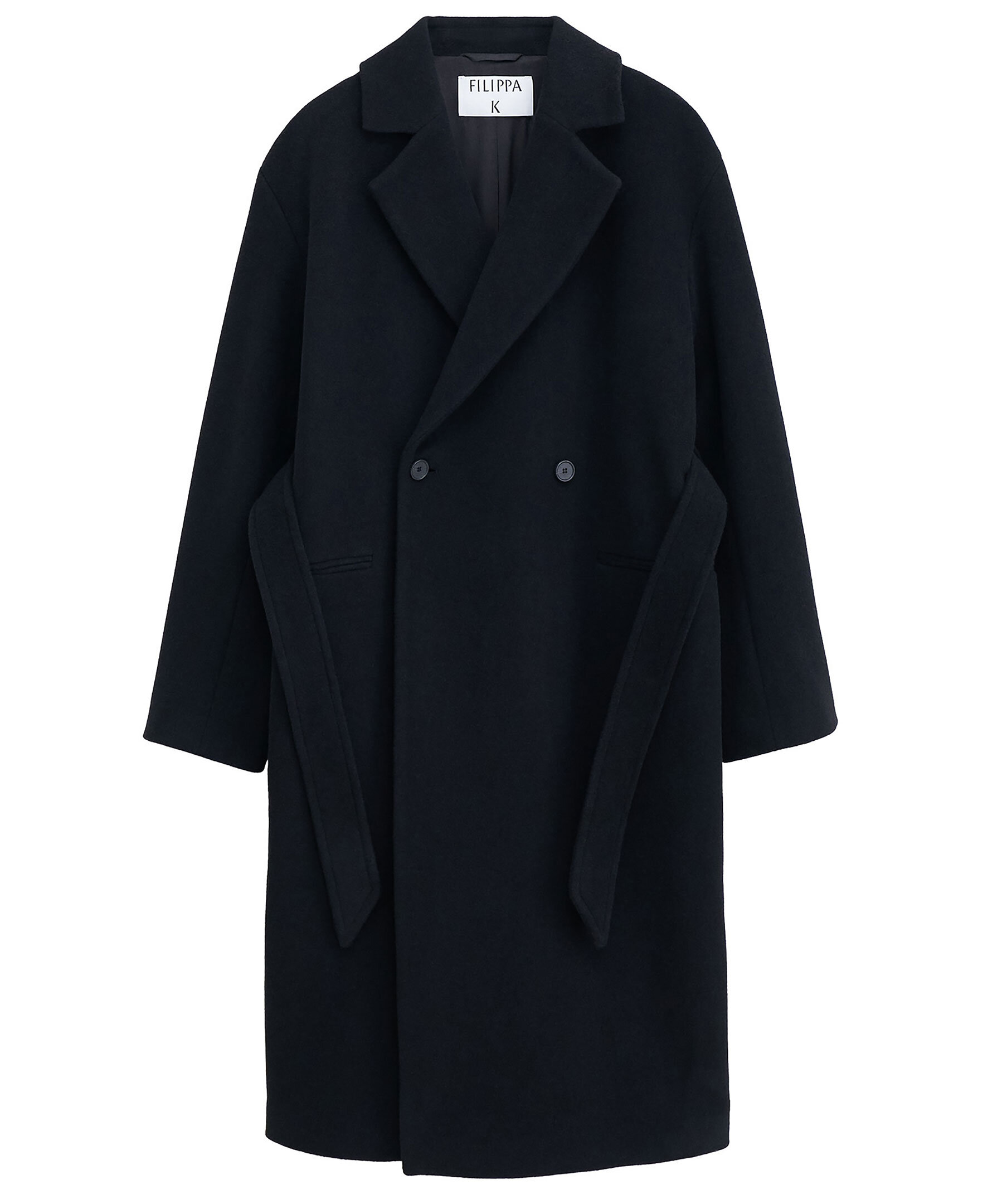 Svart kappa från Filippa K. Kappan har en avslappnad och skräddarsydd passform. Gjord i en tung borstad italiensk blandning av återvunnen ull. Designad med dubbelknäppning, nedsänkta axlar och är vadlång. Hel fodrad. Sidfickor.