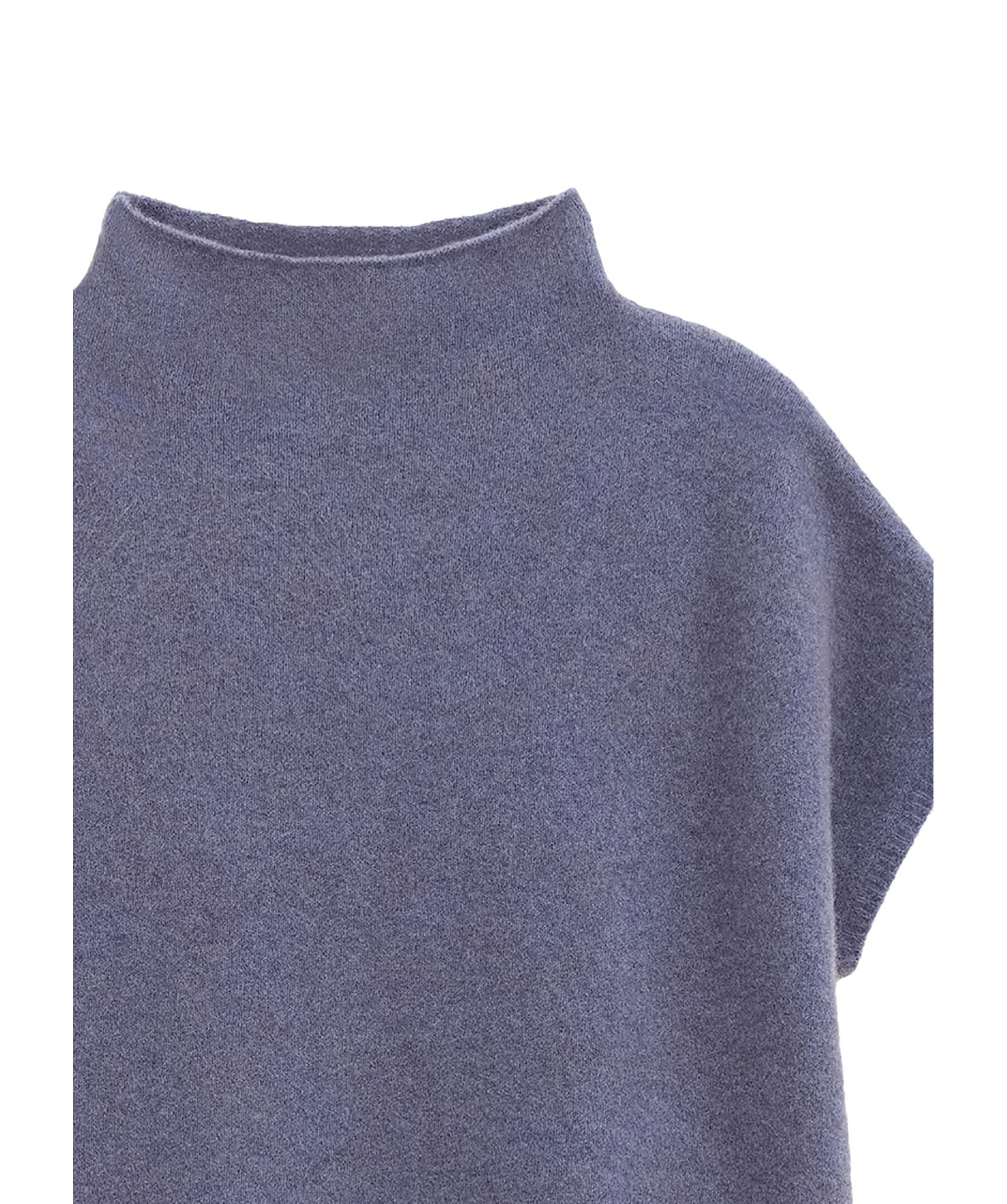 Duvblå stickad tröja med korta ärmar från Filippa K. Tröjan har en vid krage och är gjord i en ullblandning. Droppade axlar och avslappnad passform.