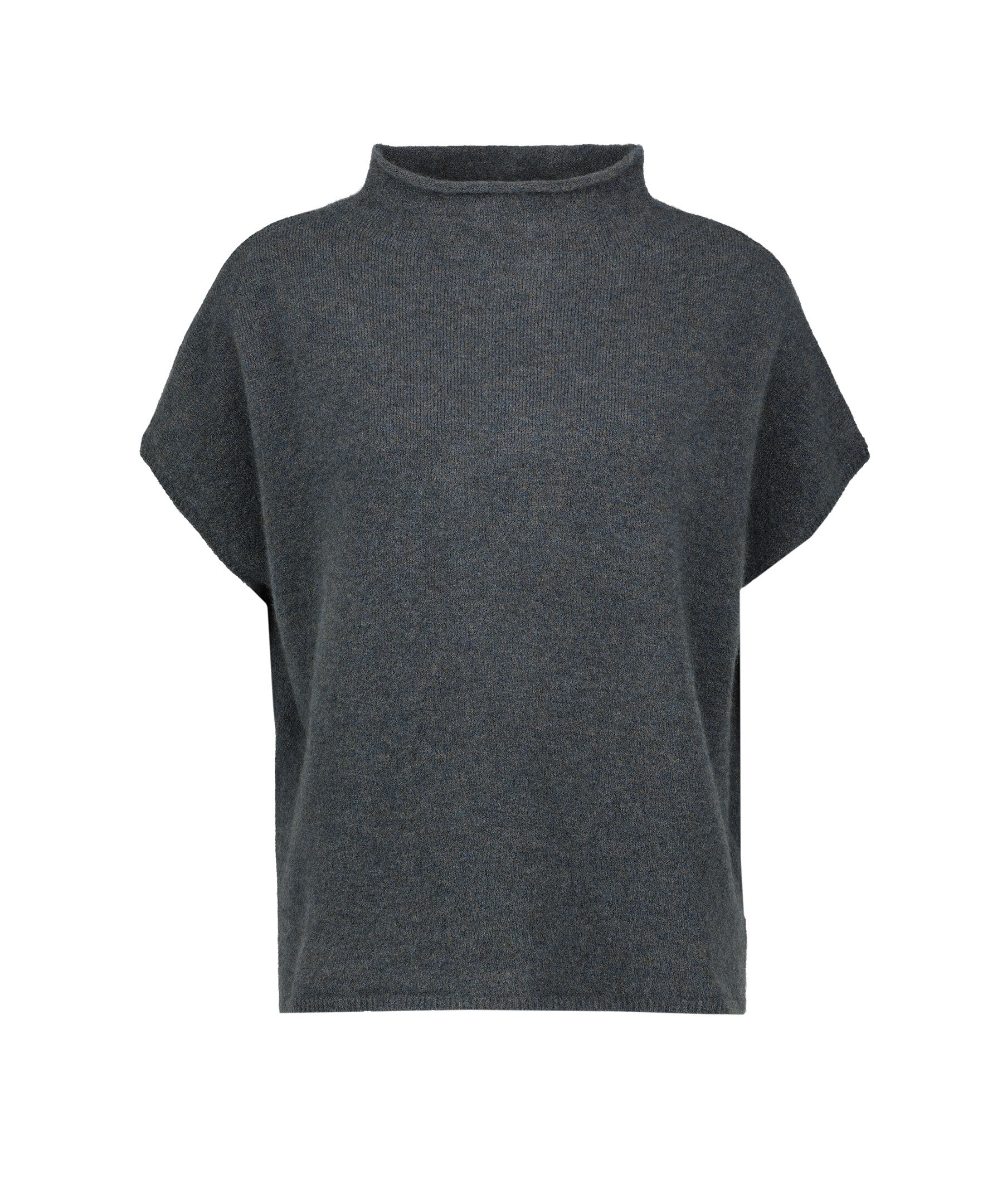 Mörkgrå stickad tröja med korta ärmar och subtilt inslag av blått och grönt från Filippa K. Tröjan har en vid krage och är gjord i en ullblandning. Droppade axlar och avslappnad passform.