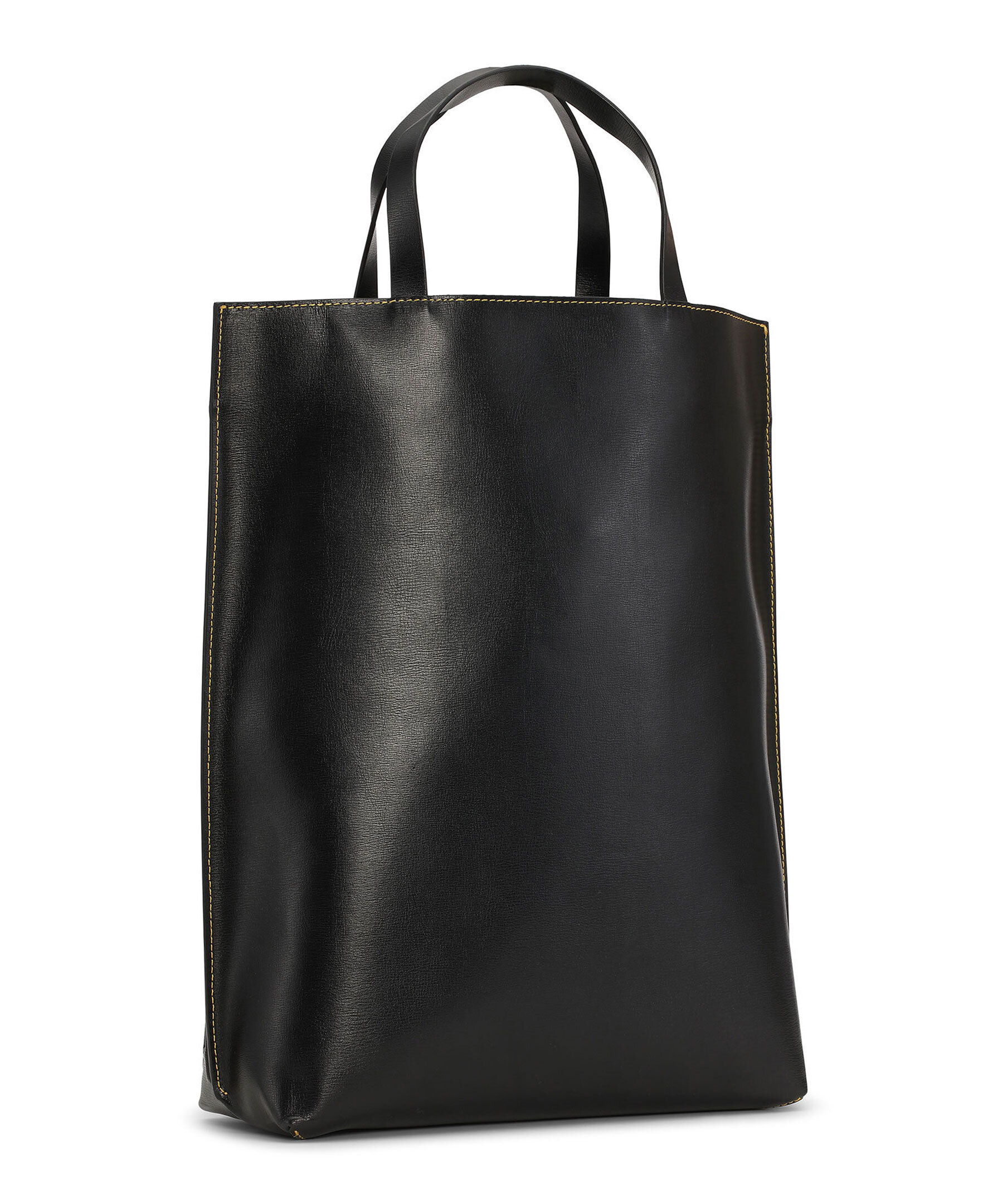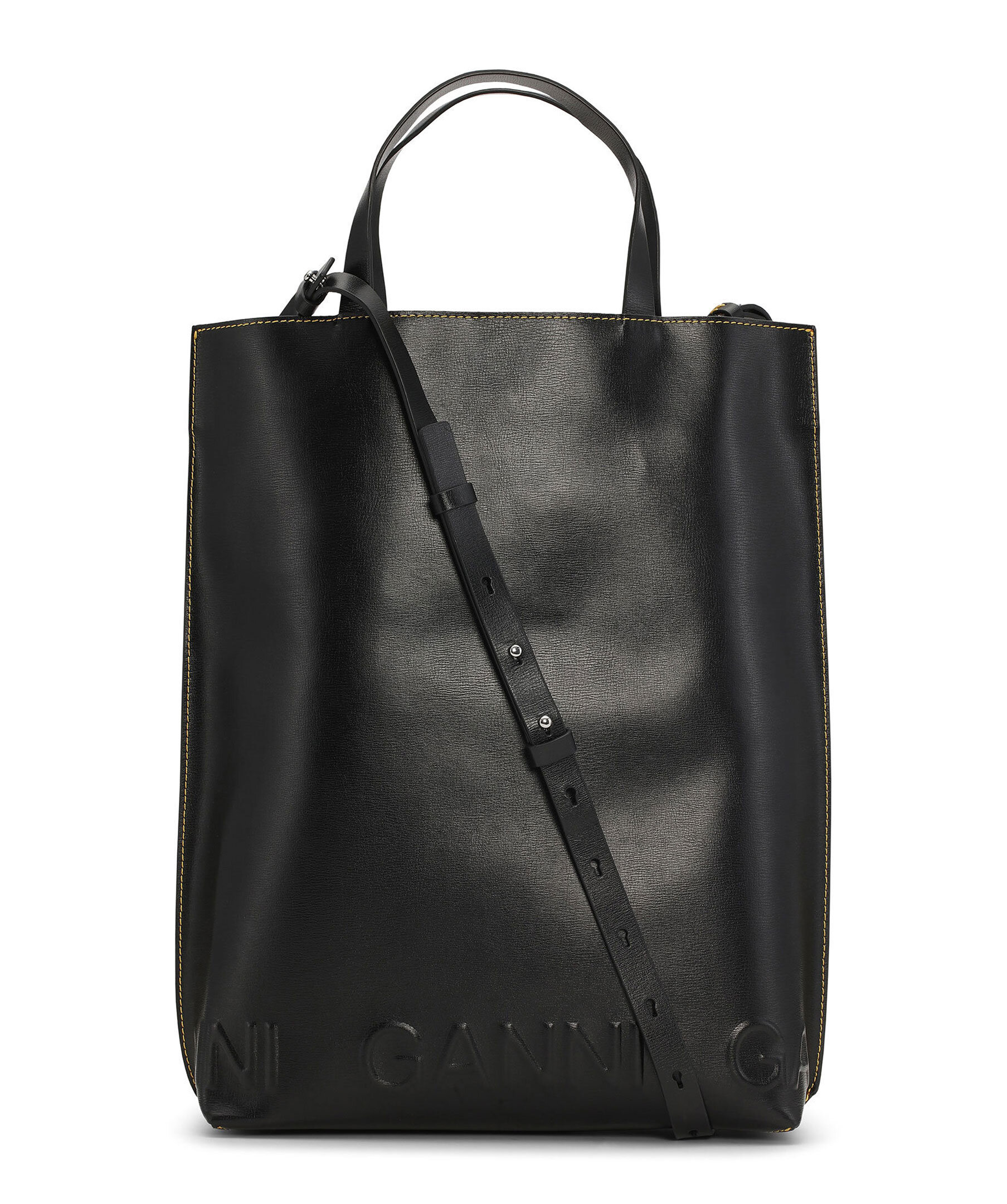 Svart tote bag från Ganni. Justerbar axelrem. Embossad logotyp vid väskans nederkant. Innerficka med dragkedja. huvudfacket stängs med tryckknapp. Gula sömmar. Handtagen har höjden 10cm.