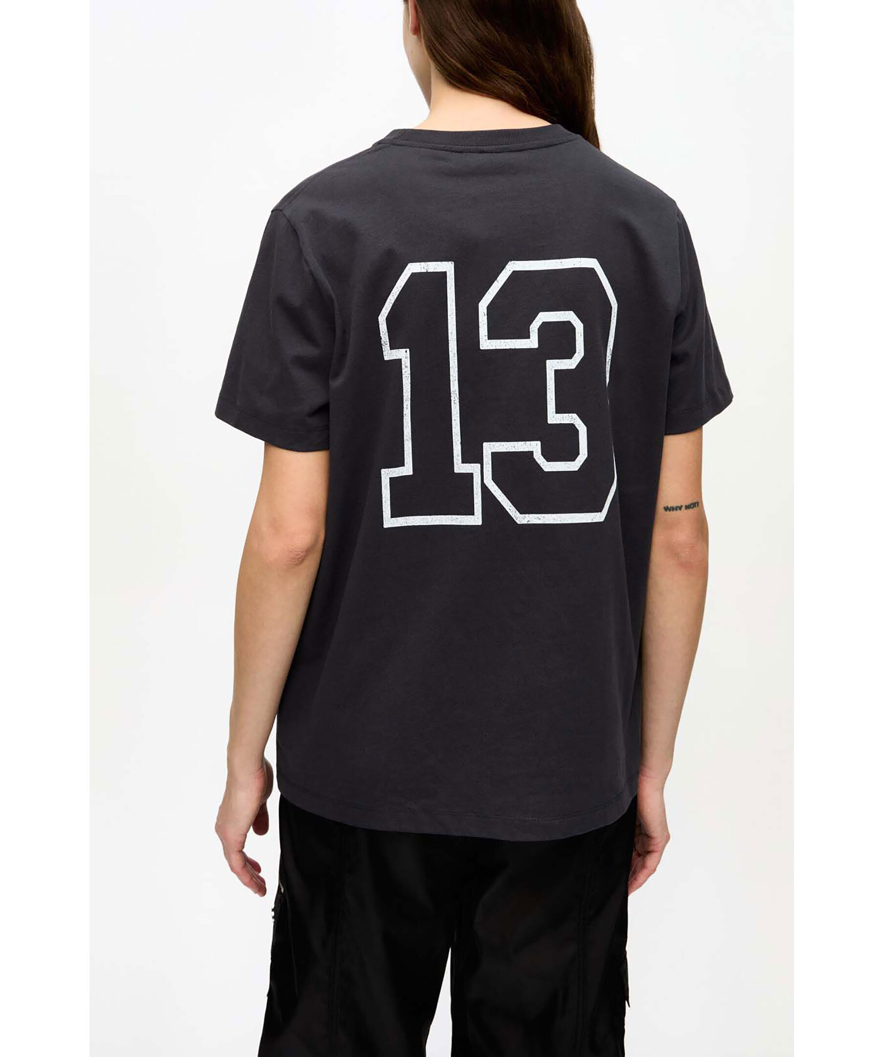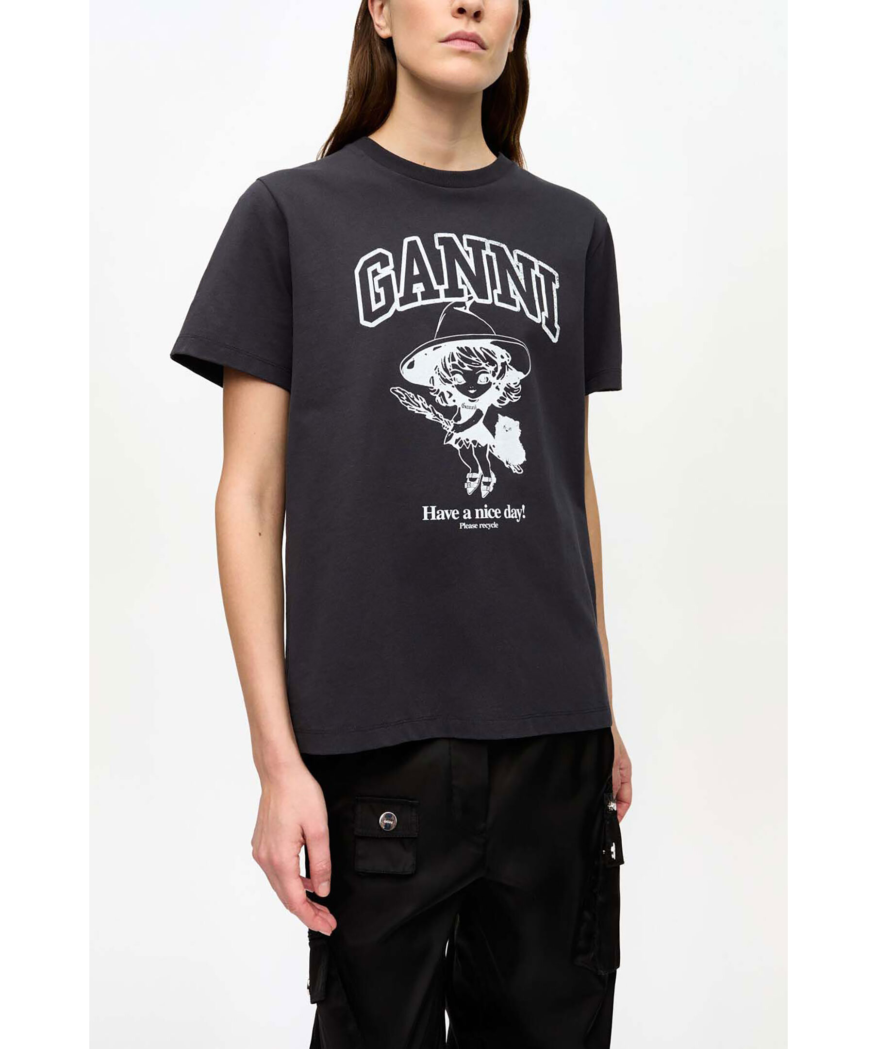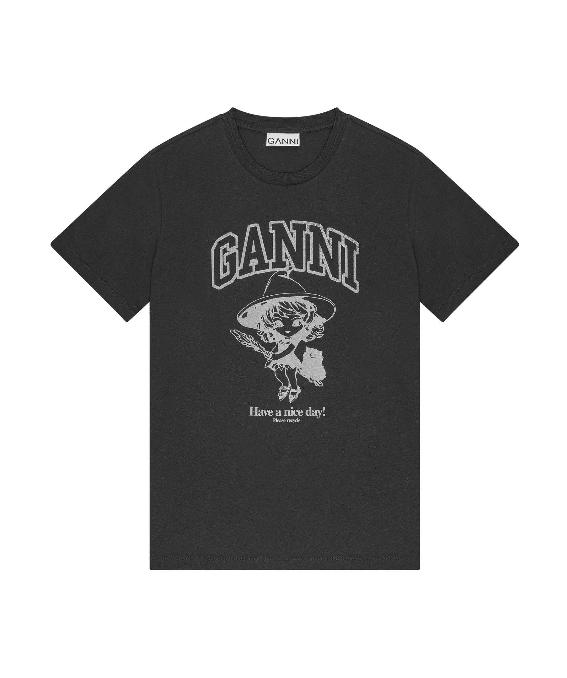 Svart t-shirt från Ganni. T-shirten har rundad halsringning, korta ärmar och ett grafiskt tryck av en häxa samt nummer 13 på ryggen. Tillverkad i ekologisk bomull.