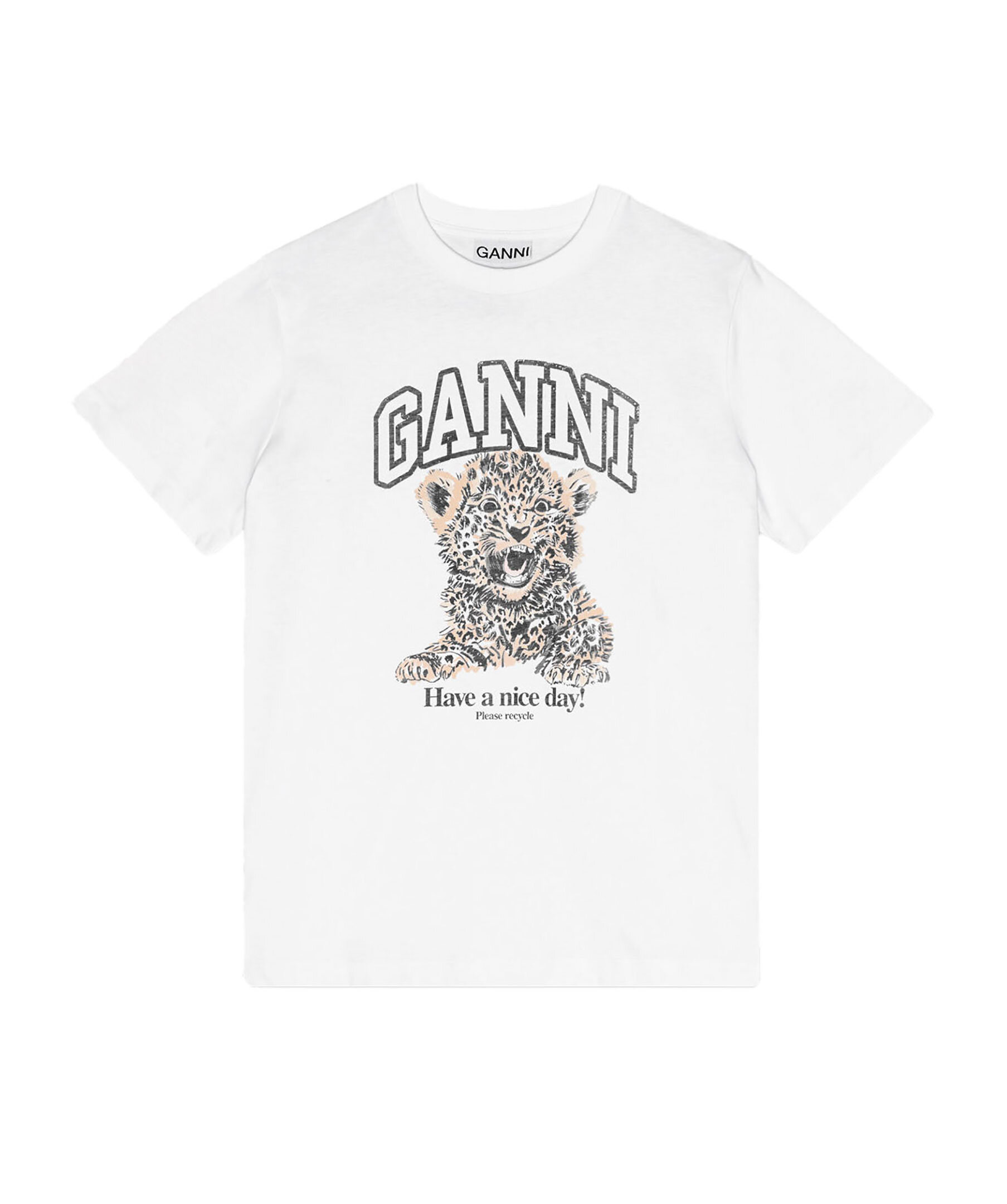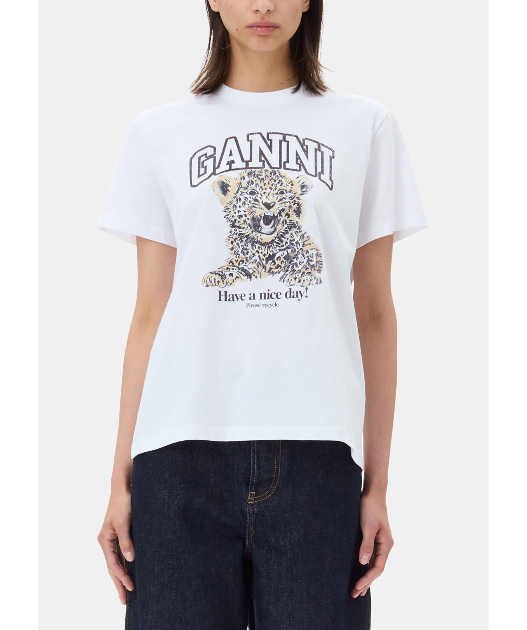 Vit t-shirt från Ganni. T-shirten har rund halsringning, korta ärmar och leopardtryck framtill. Tillverkad i bomull.