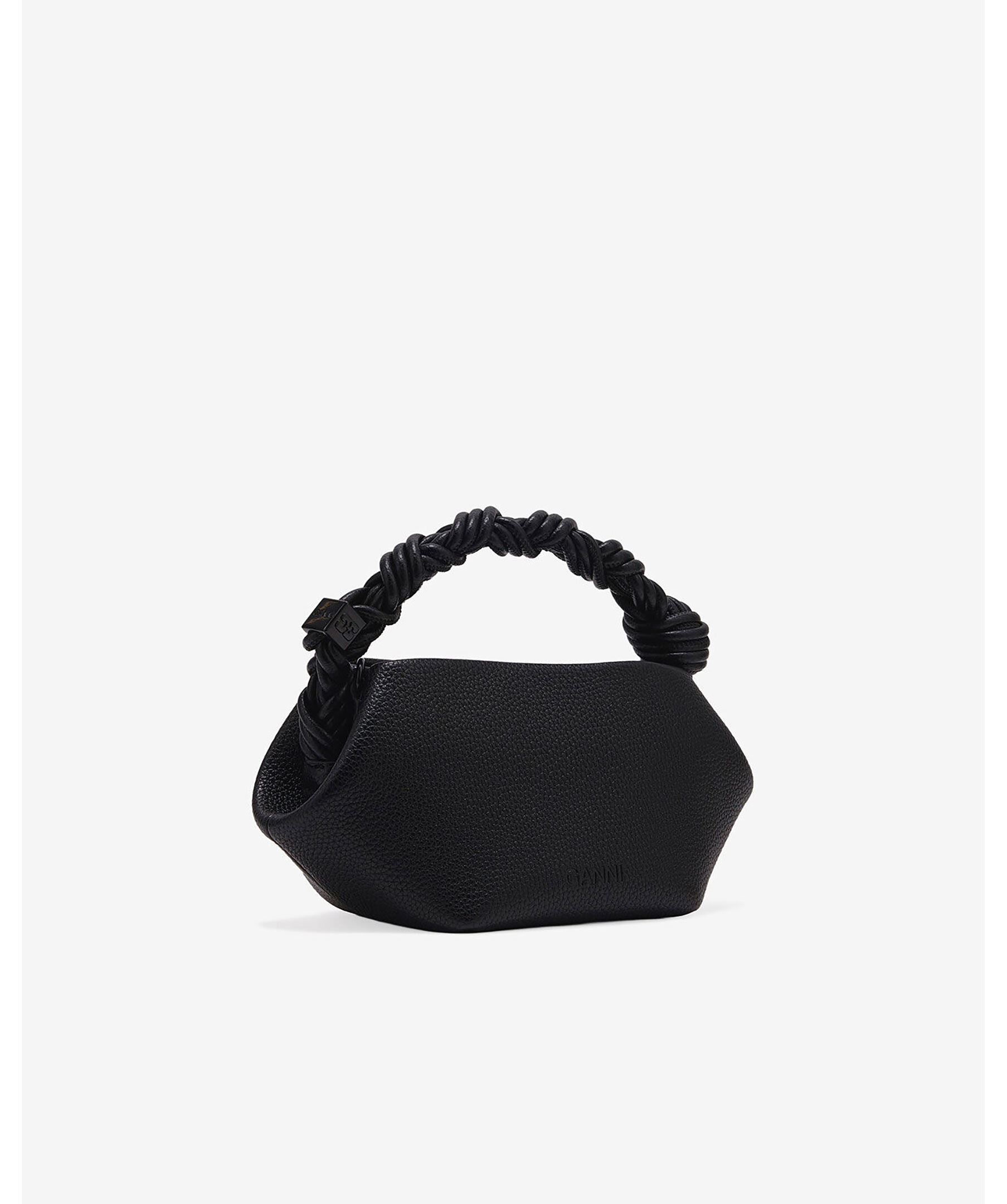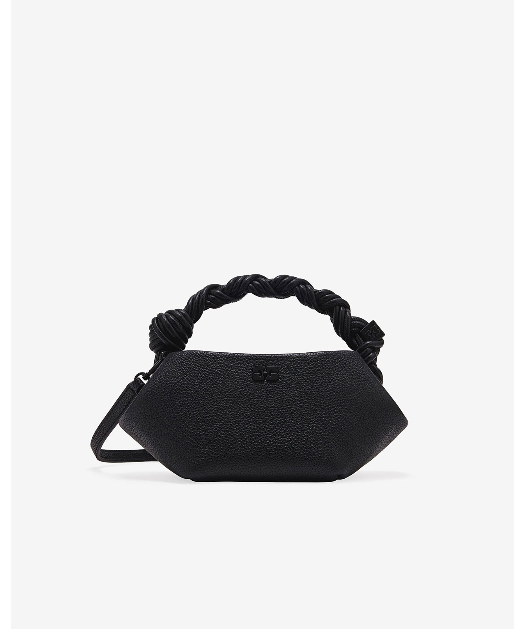 Svart mini Bou-väska från GANNI med kornig finish. Väskan har ton-i-ton metallisk Butterfly-logotyp, vridet flätat topphandtag med knut, justerbar och avtagbar axelrem, magnetlåsförslutning och ett inre kortfack.