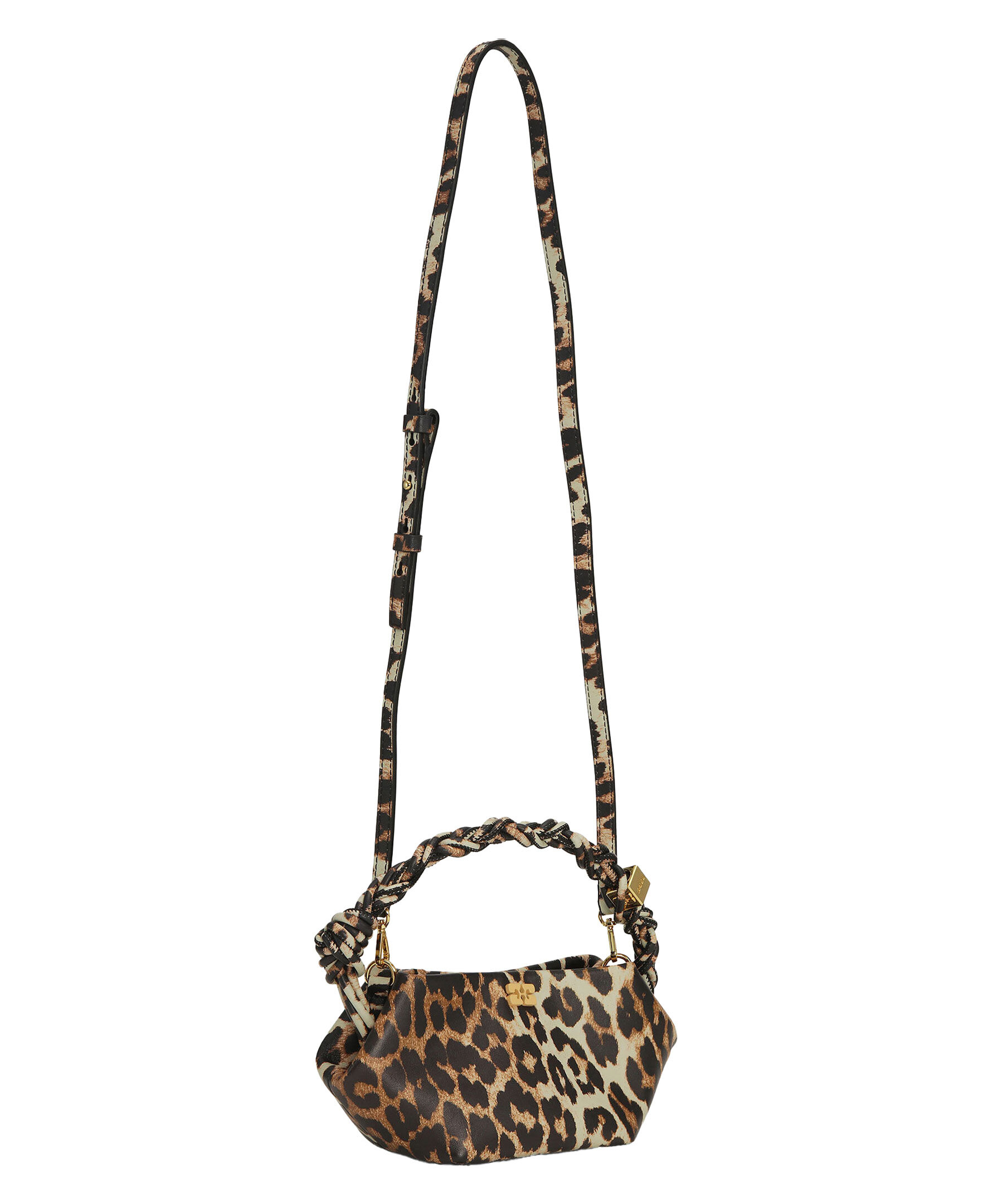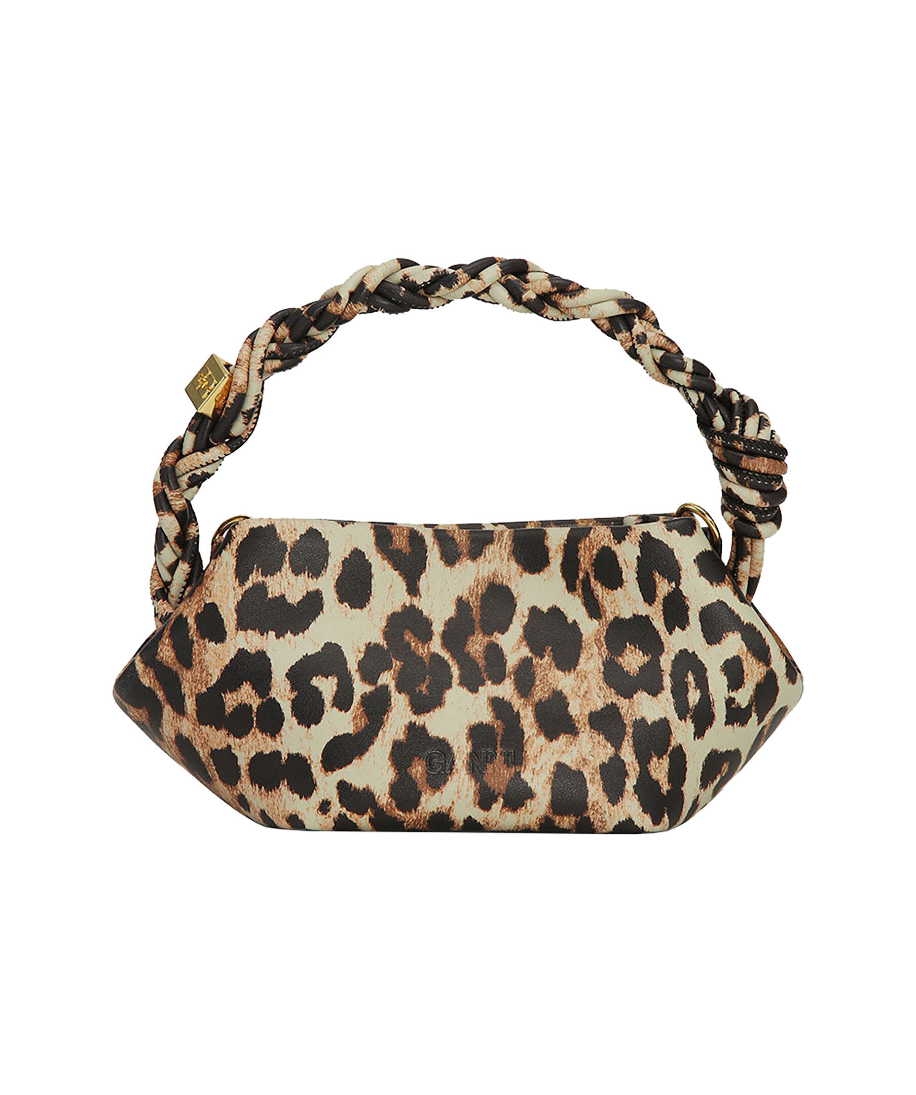 Leopardmönstrad väska från Ganni. Väskan har ett vridet handtag med flätad knut och en guldfärgad detalj i form av en tärning med logotyp. Guldfärgad Ganni butterfly-logotyp på framsidan. Magnetisk stängning samt kortficka på insidan. Justerbar och avtagbar axelrem. Tillverkad av en läderblandning.