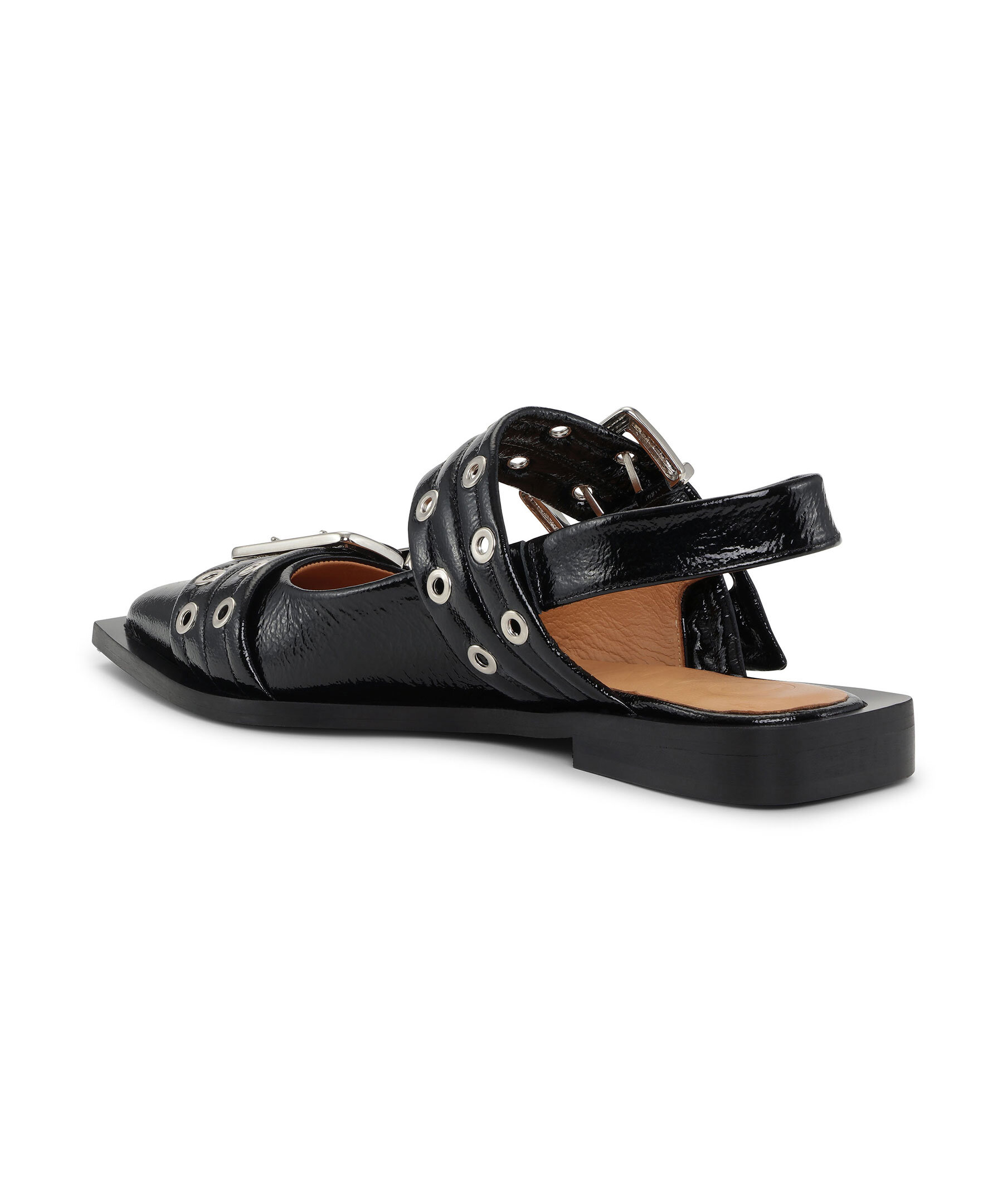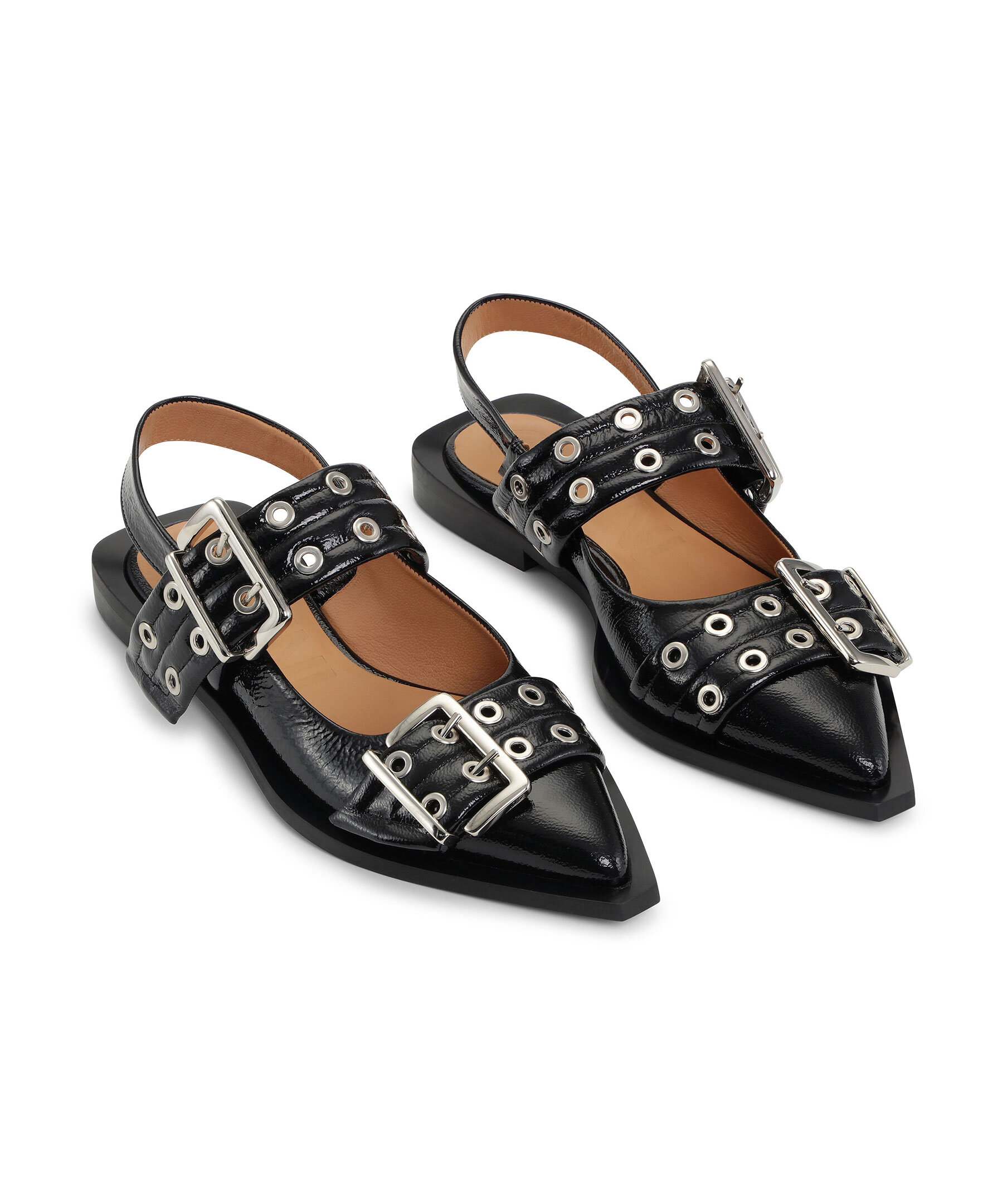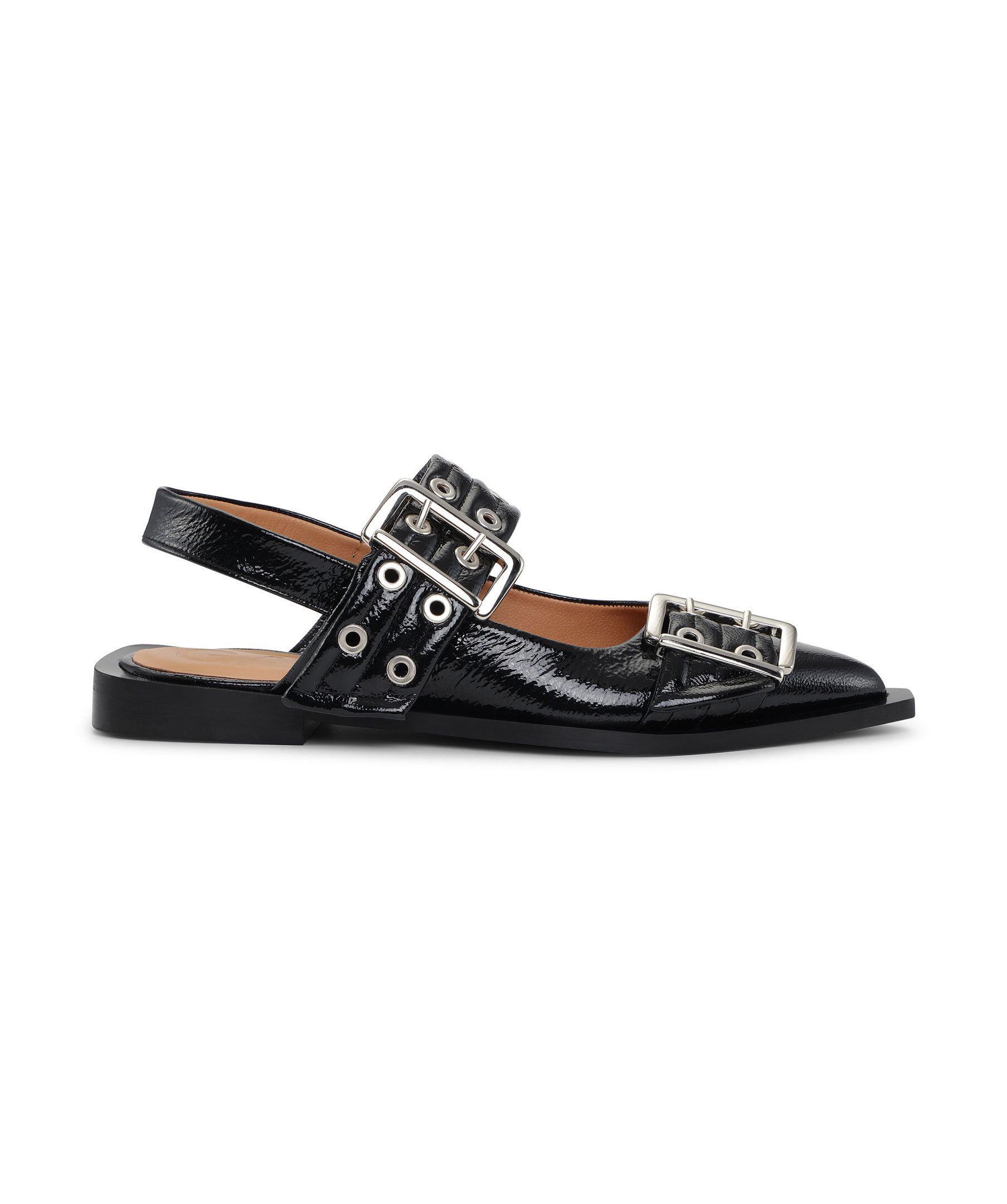 Svarta ballerinaskor med ett tjockt spänne på ovansidan från Ganni. Designade för den modeintresserade kvinnan, har dessa platta sandaler en högglansig finish och en spetsig tå för en chic look. Spännet ger en touch av elegans, medan den förlängda sulan ger extra komfort.