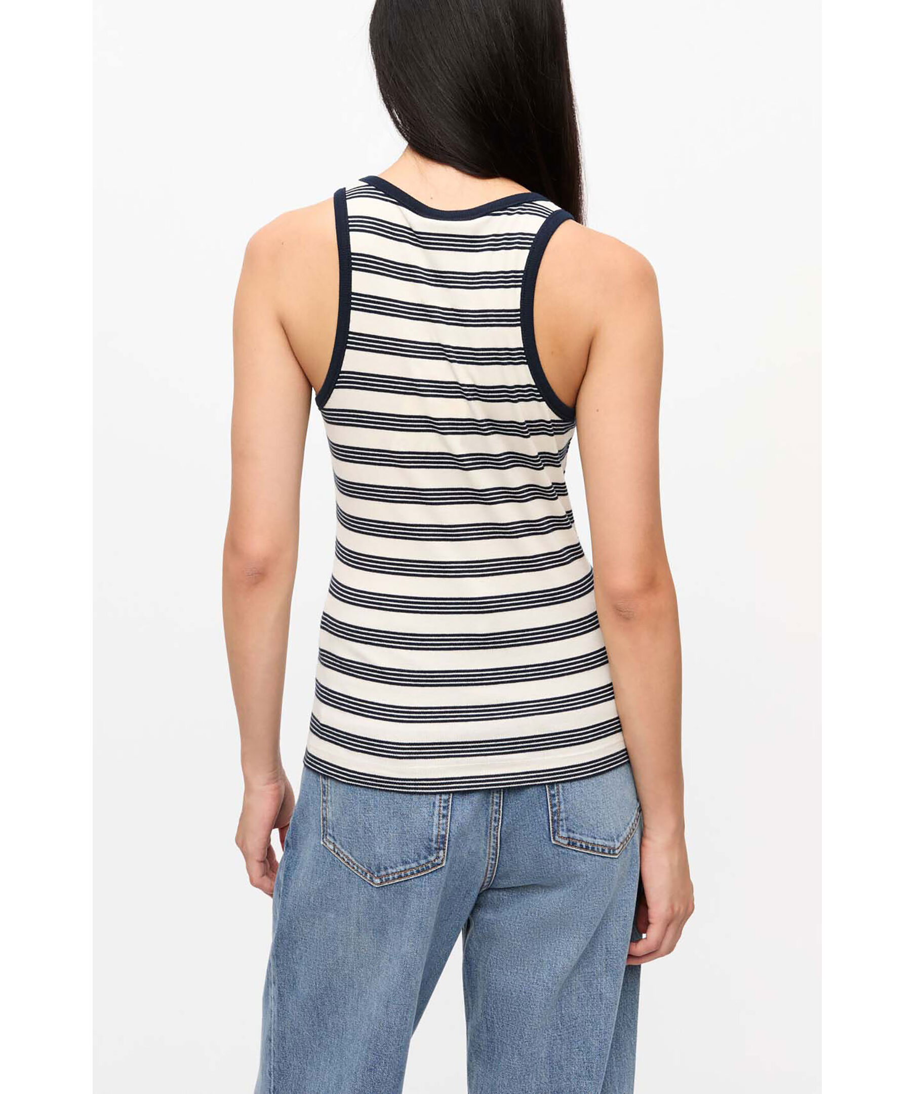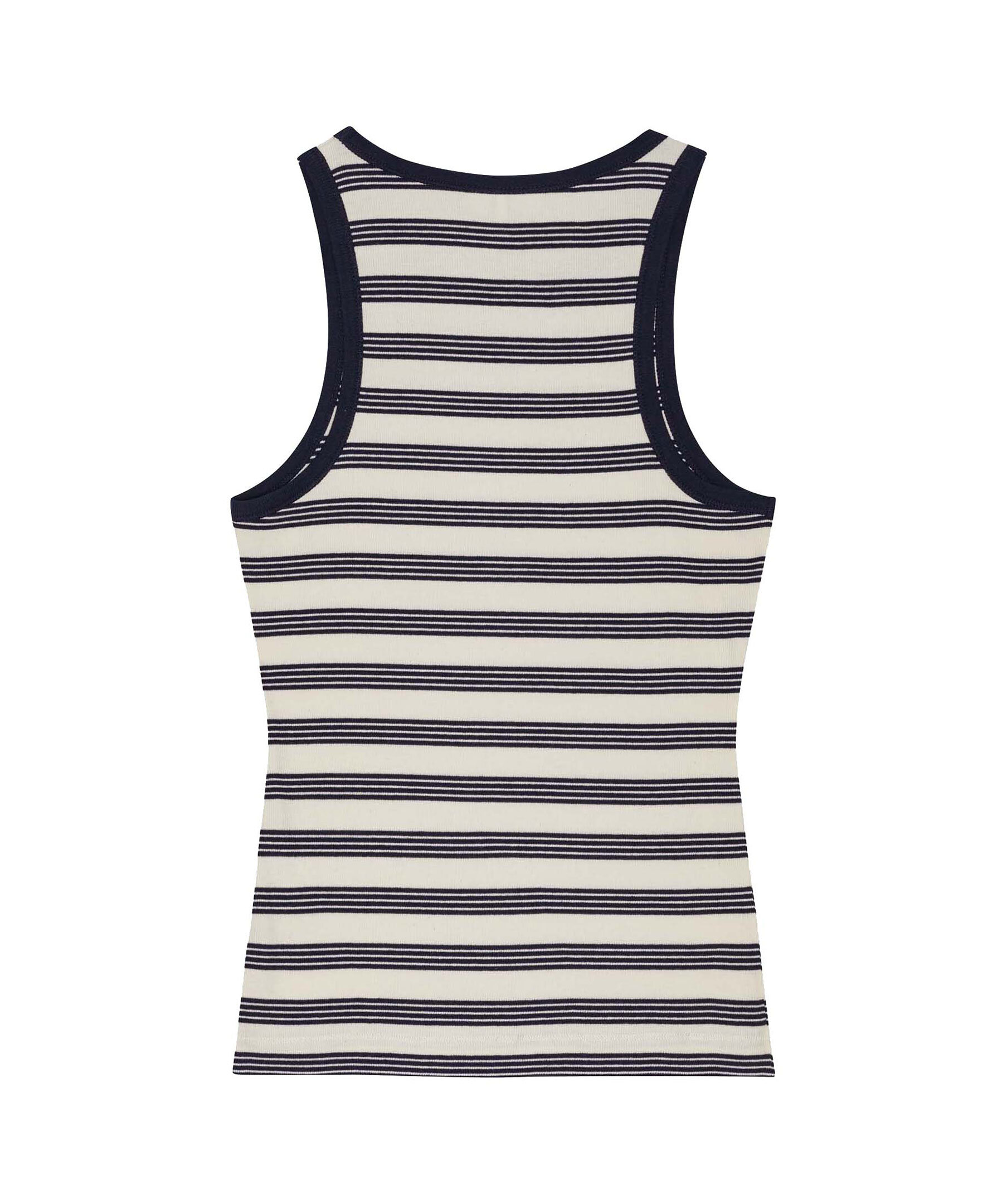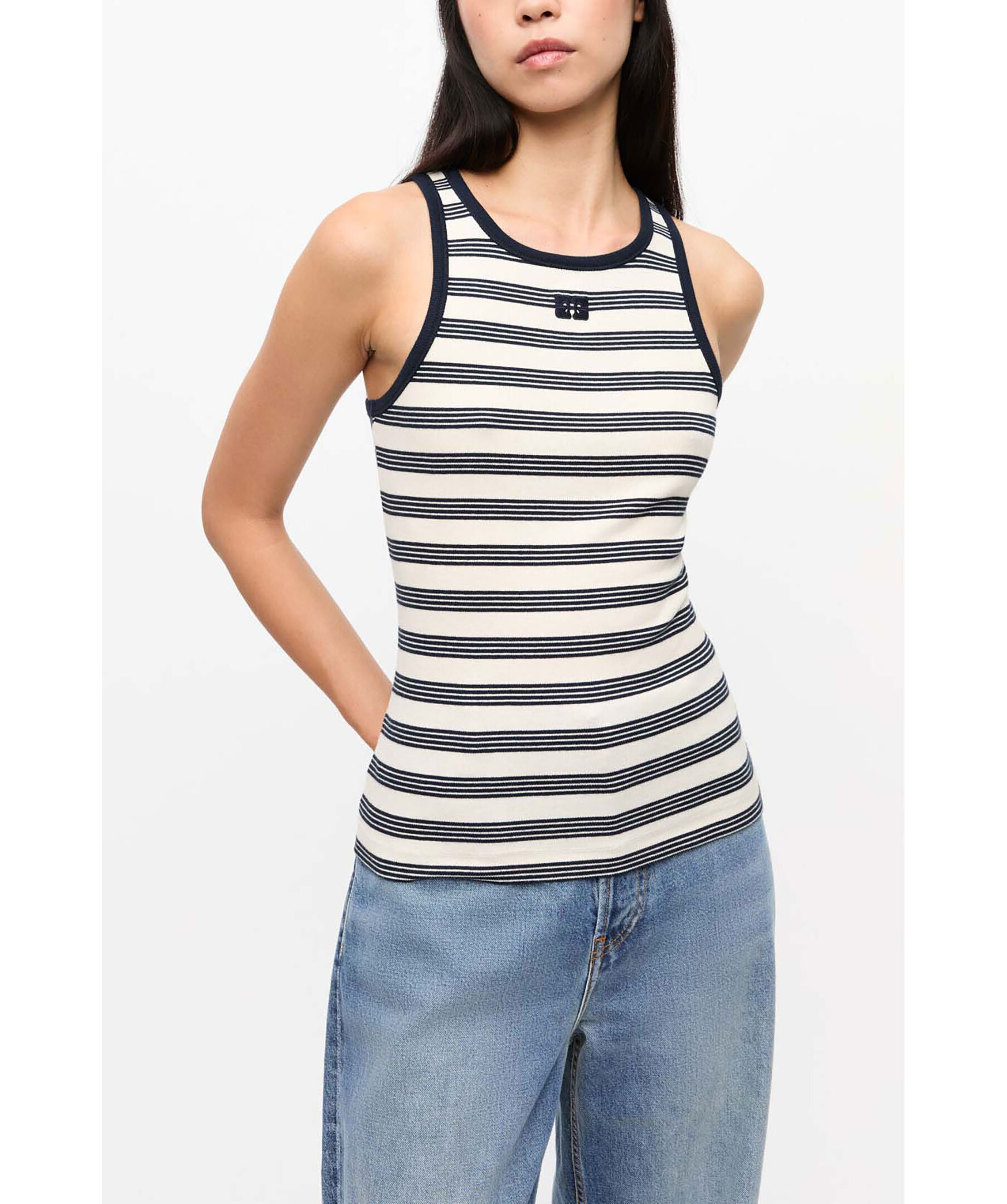 Randigt, ribbstickat linne från Ganni. Linnet har brottarrygg och har broderad GANNI Butterfly-logotyp på bröstet. Tillverkad i en bomullsblandning.
